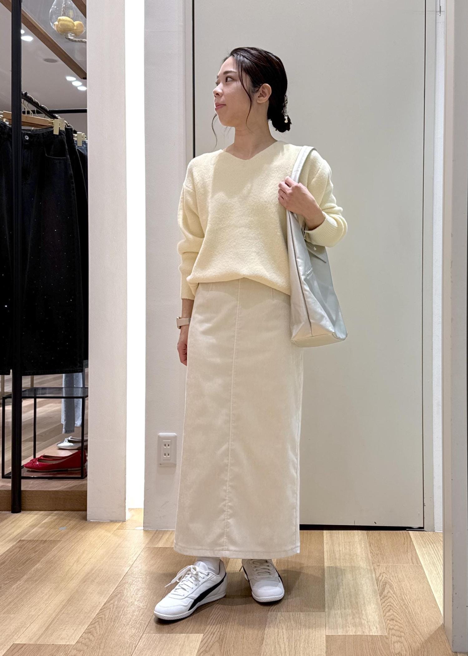 ゆるっとしたシルエットのカーディガンを合わせる事で抜け感もプラスしました。