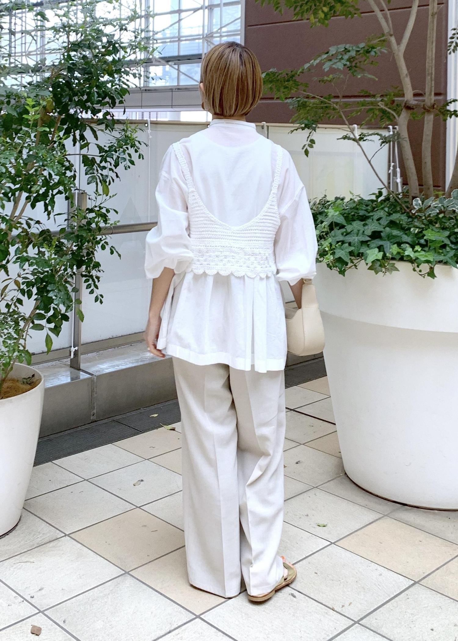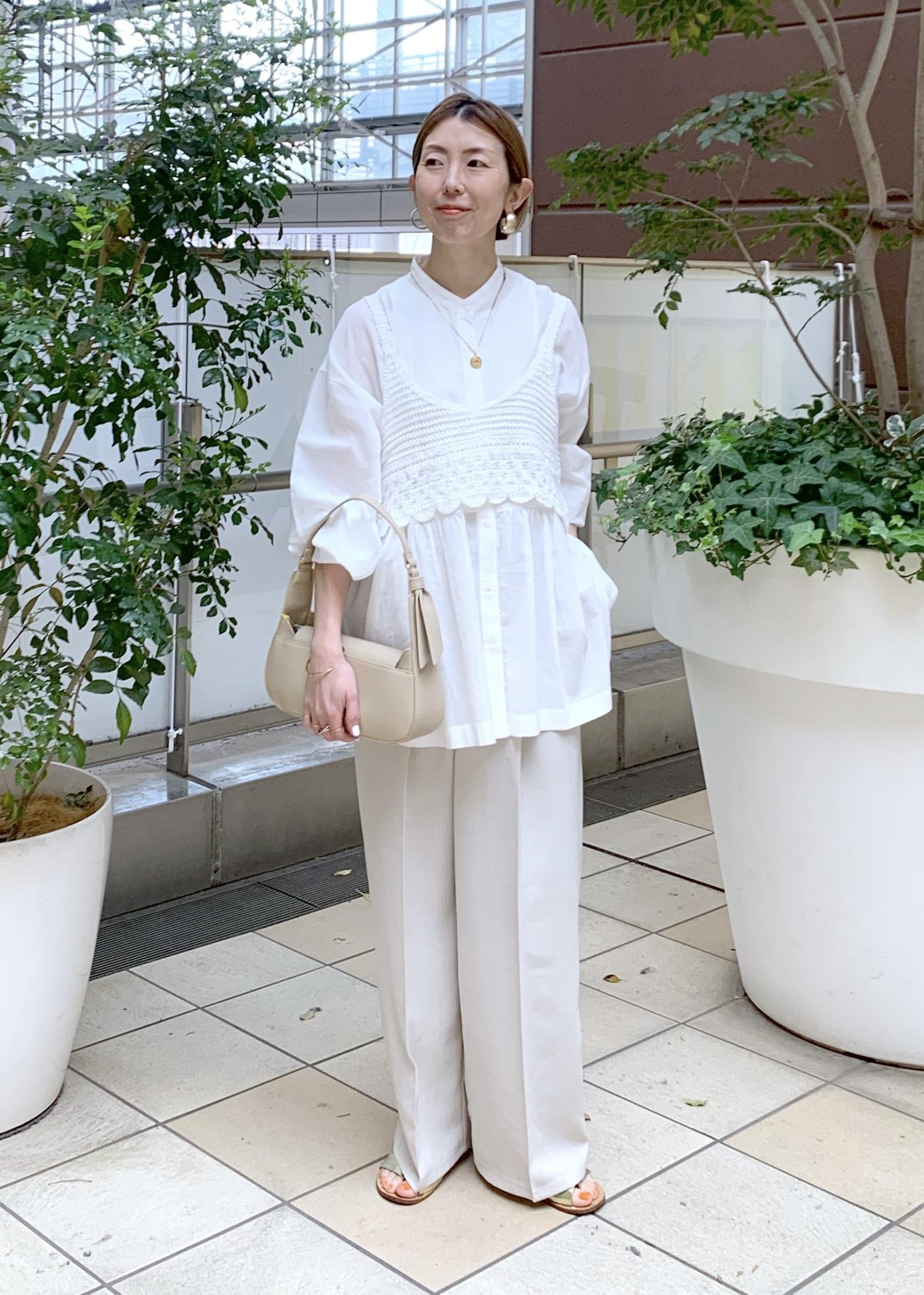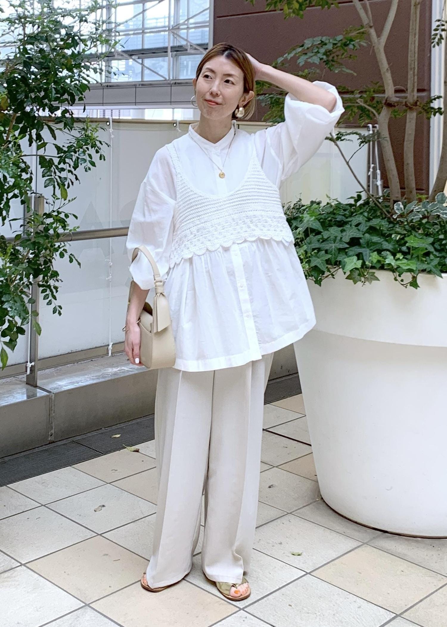 シンプルなワントーンスタイリングにクロシェベストをプラス。