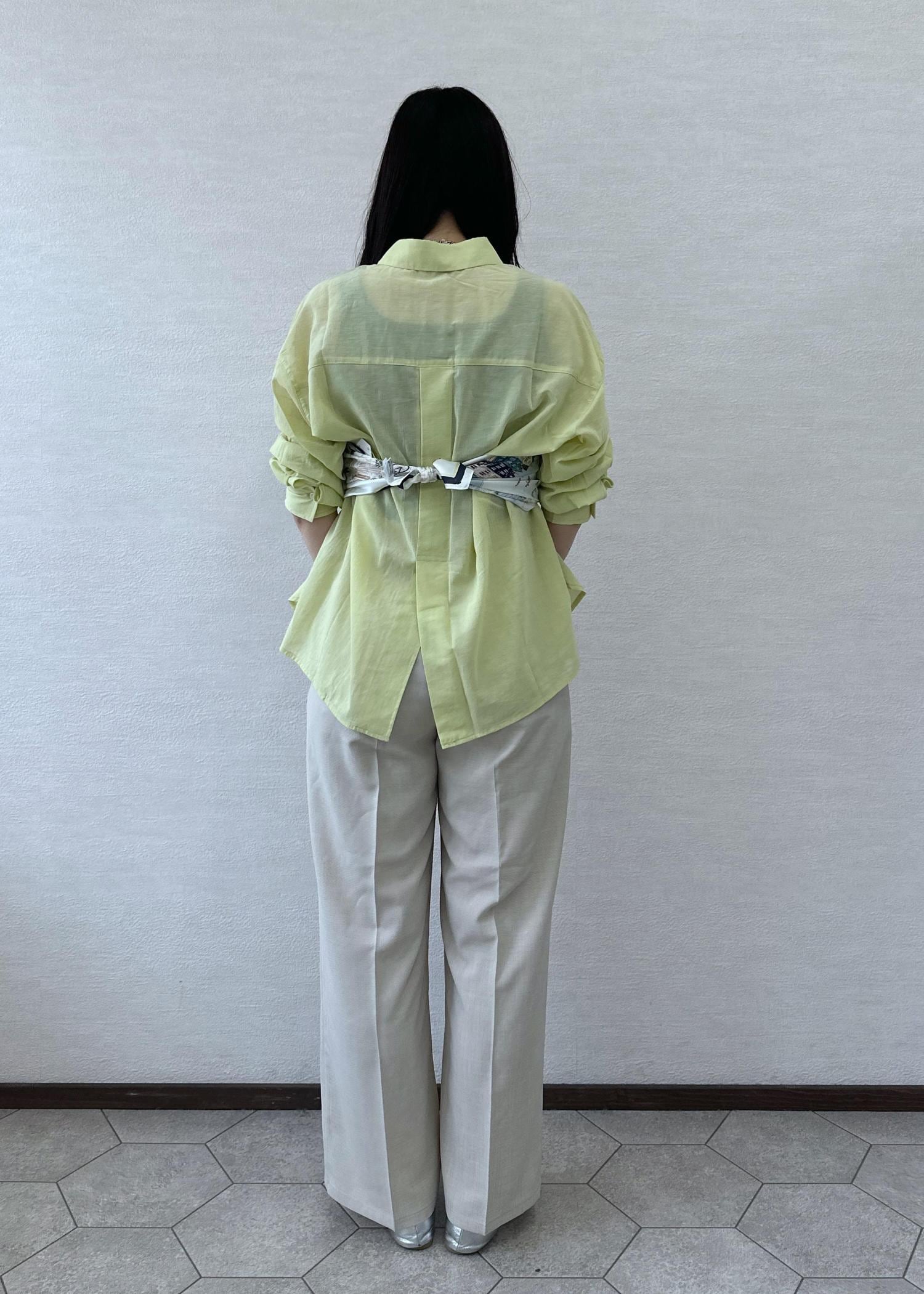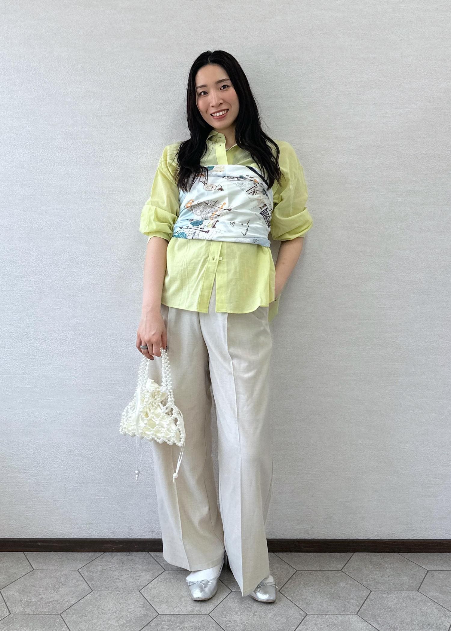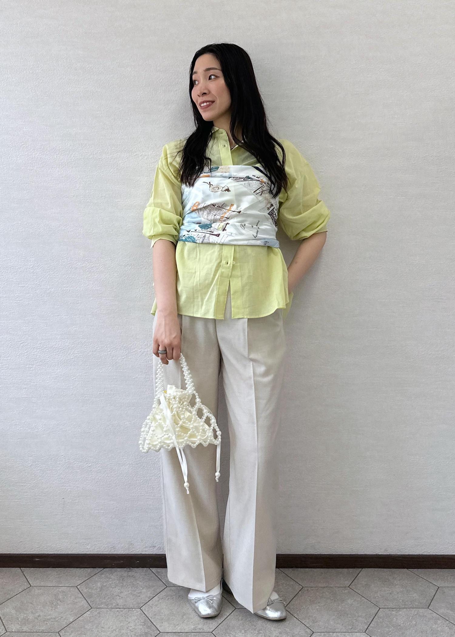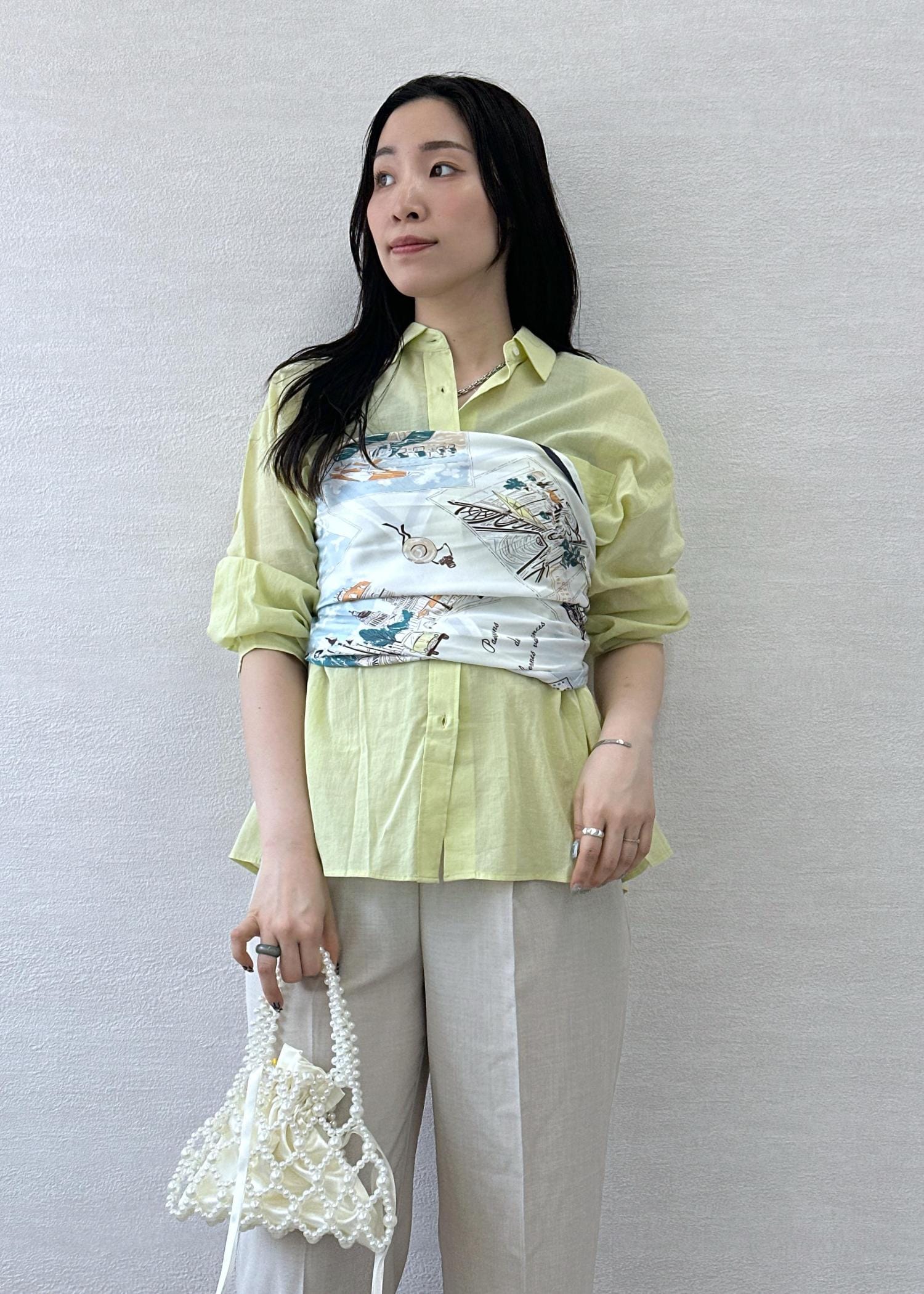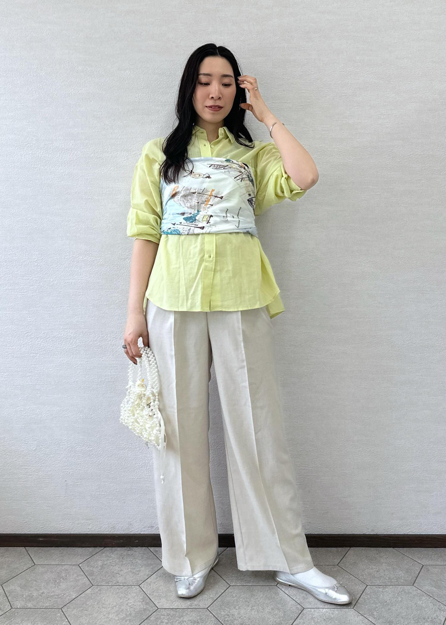 イエローのシャツにスカーフをビスチェ風にアレンジしました。