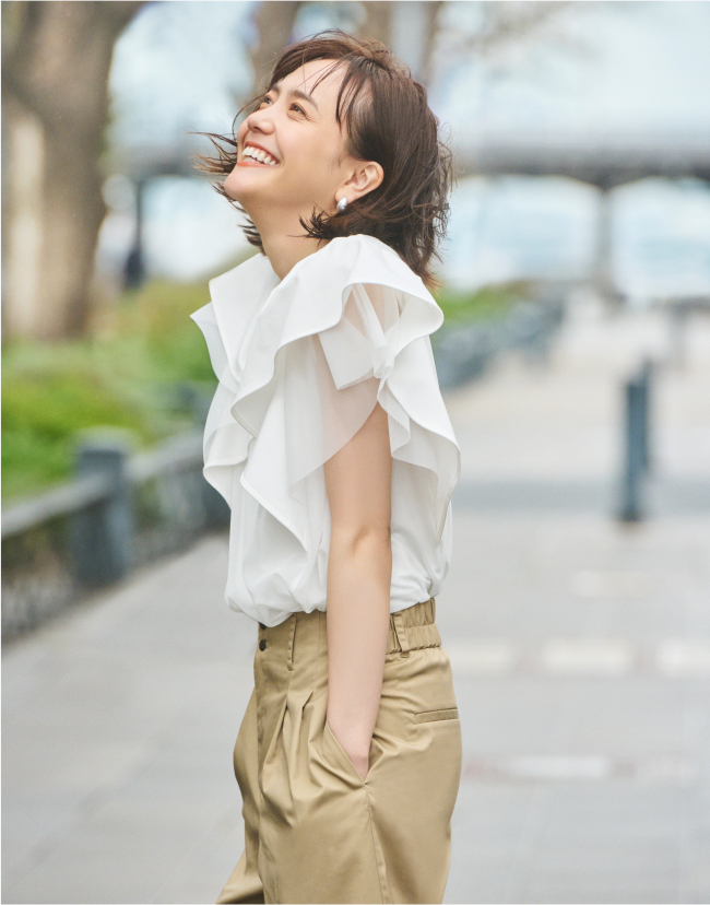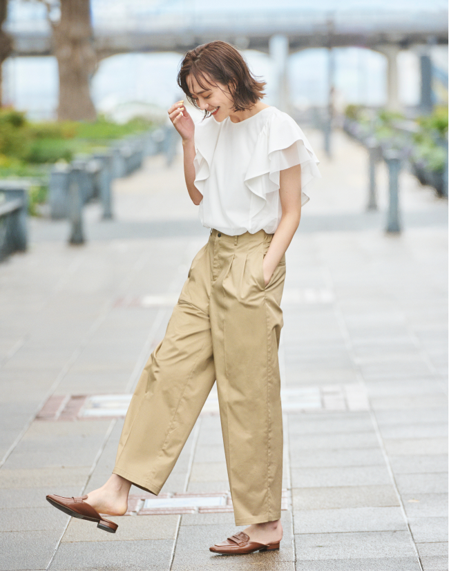 エアリーなトップスに、あえてハリ感のあるカジュアルなチノパンを合わせて。上下にコントラストをつけることで、着こなしにメリハリとこなれ感が生まれる。足元にはカラートーンを揃えたブラウンのローファーを。