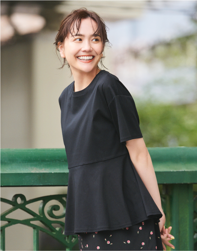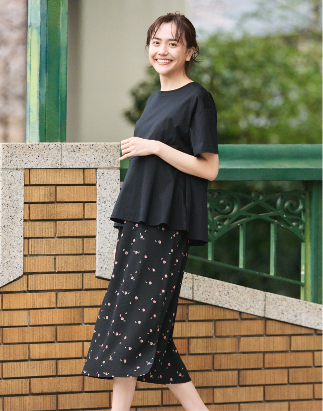 軽やかなシルエットと心地いい素材を満喫する、初夏のオールブラックスタイル。インナーにすっきりシルエットのワンピースを合わせて、トップスのフレア感を強調。可憐な花柄がワントーンスタイリングのキュートな味付けに。