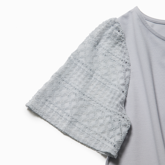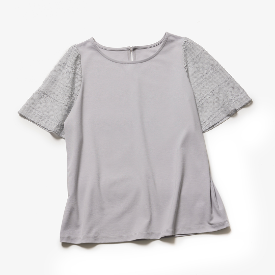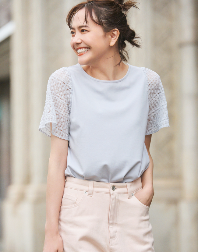 • 繊細に編み上げたレース素材のフレアスリーブは装いのアクセントになってくれる上、二の腕を隠してくれるボリューム感も心強い。ボディにはしなやかなカットソー素材を採用し、身幅を広めに取りながらもすっきりとした印象に。