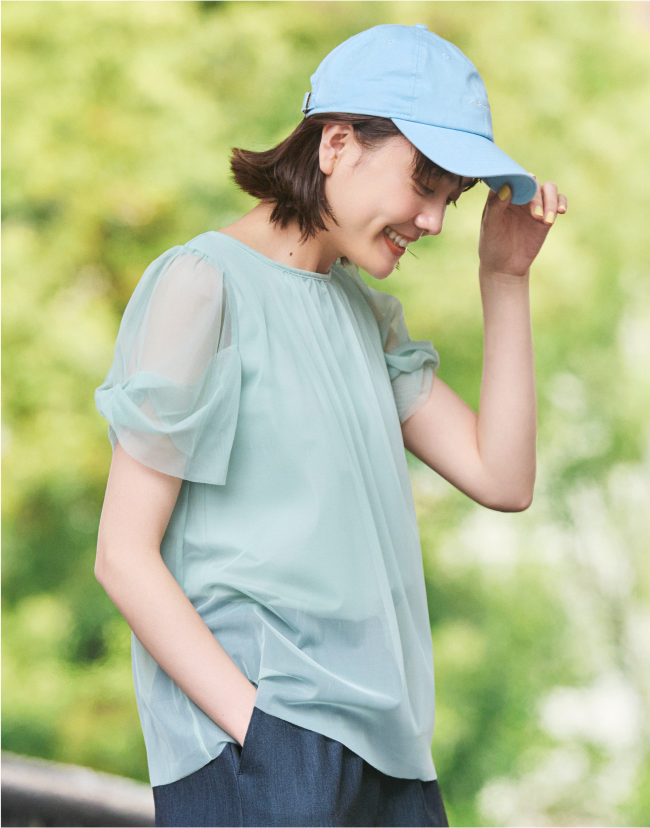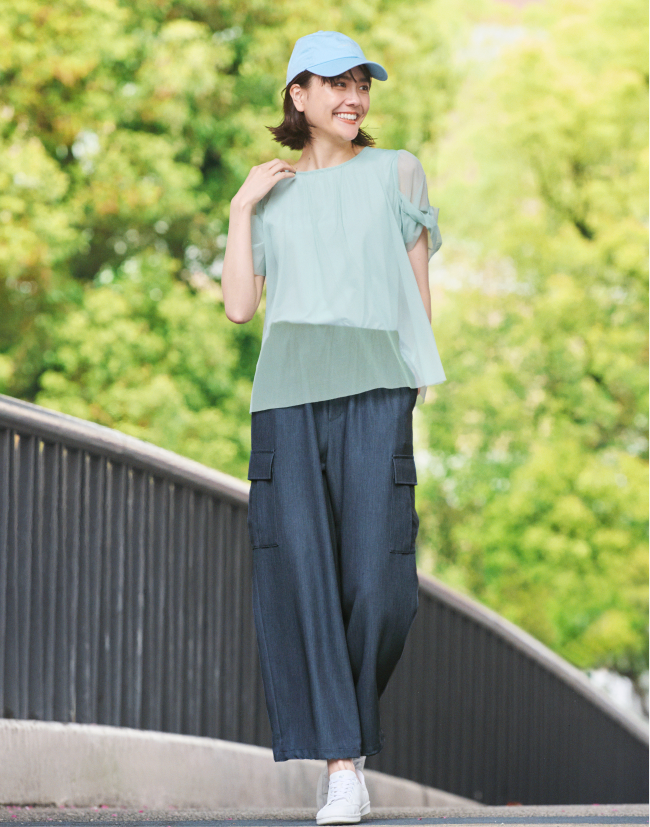 爽やかなミントカラーを基調に、カーゴパンツとキャップを組み合わせた涼しげでアクティブな着こなしを。カジュアルで終わらない上品なエッセンスを加え、旬のスポーティシックの一歩先へ。