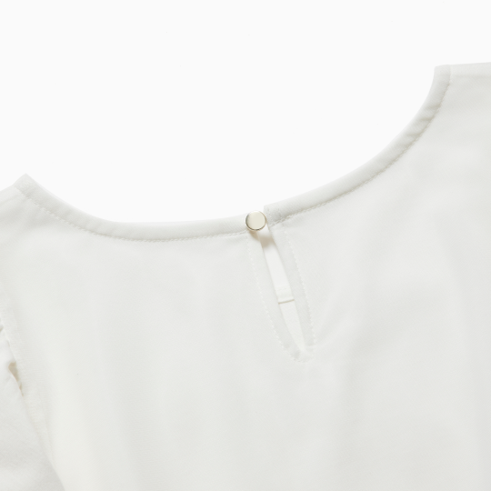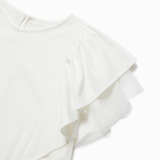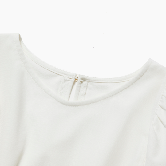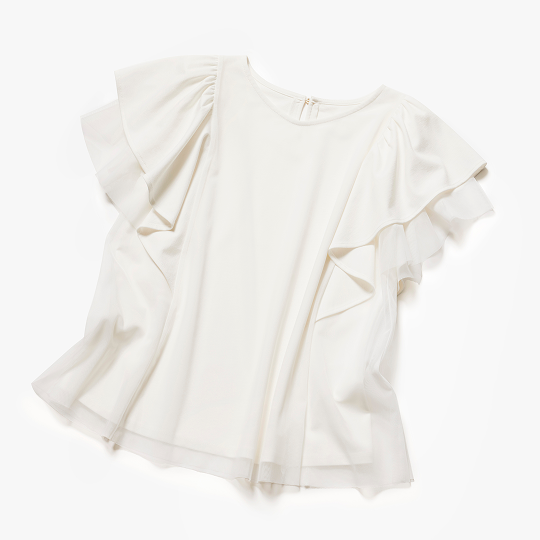 • なめらかな肌触りのカットソーに透け感のあるチュール素材をドッキング。どの角度から見ても映える、ふんわりと波打つスリーブデザインが目を引く。ボリュームのある袖に対して、首元は浅めなVネックに仕上げてすっきりとした印象に。