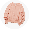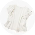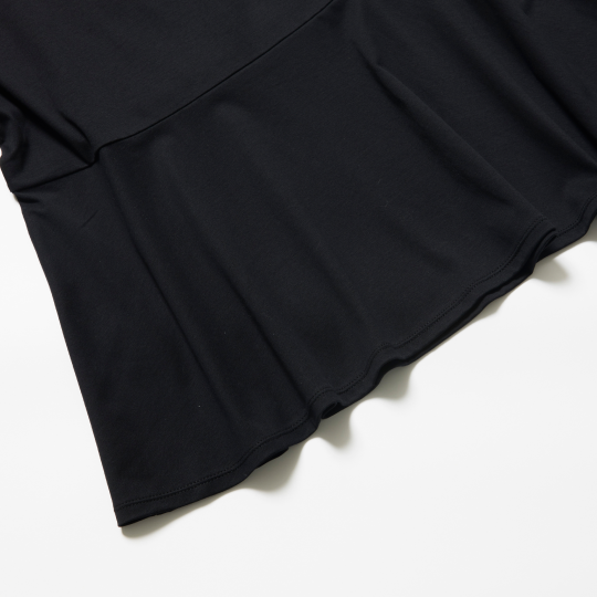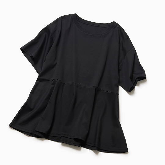 • 肌触りのいいコットンにシルケット加工を施し、シルクのような光沢感としなやかな質感を追求。首や袖回りはTシャツライクなシンプルな仕立てながら、ウエスト下をペプラムデザインに切り替え、ゆるやかなフレアシルエットを描いたトップス。