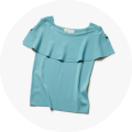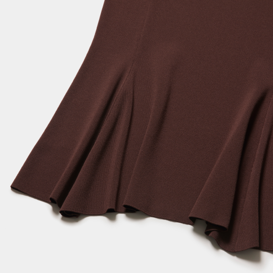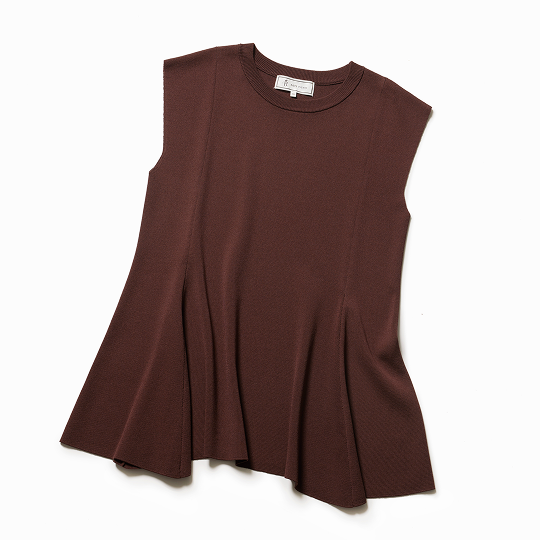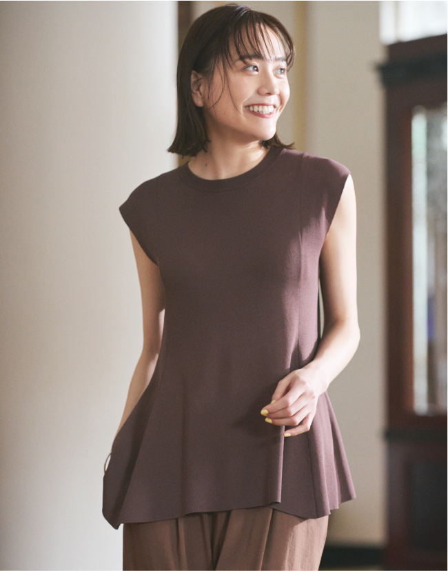 ペプラムデザインのシルエットが特徴的なトップスを使った、ブラウンでまとめたシックなスタイル。さらりと軽やかなパンツ、抜け感のあるシアーなミュールをセットしてヘルシーかつ凛とした雰囲気のスタイルが完成。