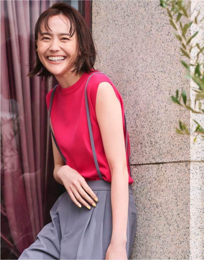 ヴィヴィッドなピンクが周囲の視線をキャッチ! テーパードパンツは気分にマッチするサスペンダー付きを選び、チャーミングなムードをさらに加速。小物は潔く黒で統一し、ピリリと引き締めるイメージで。