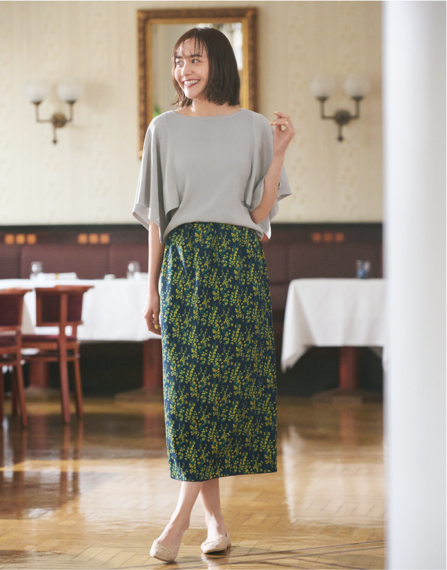 立体的なシルエットのトップスには端正なIラインのスカートを合わせて。トップスは袖にたっぷりとボリュームがある分、ボトムにインするとバランスよく仕上がる。