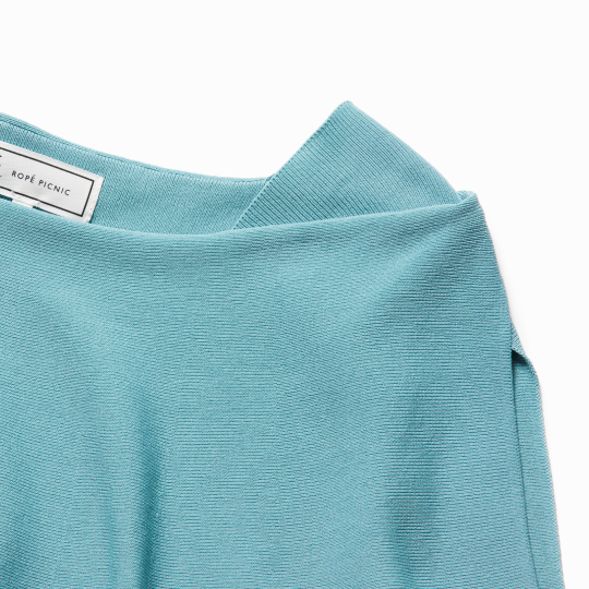 - 裾に向かってドラマティックなドレープを描くペプラムデザインで腰回りをカバー。ウエストが高い位置でシェイプされているため、自然と脚長効果も実現。