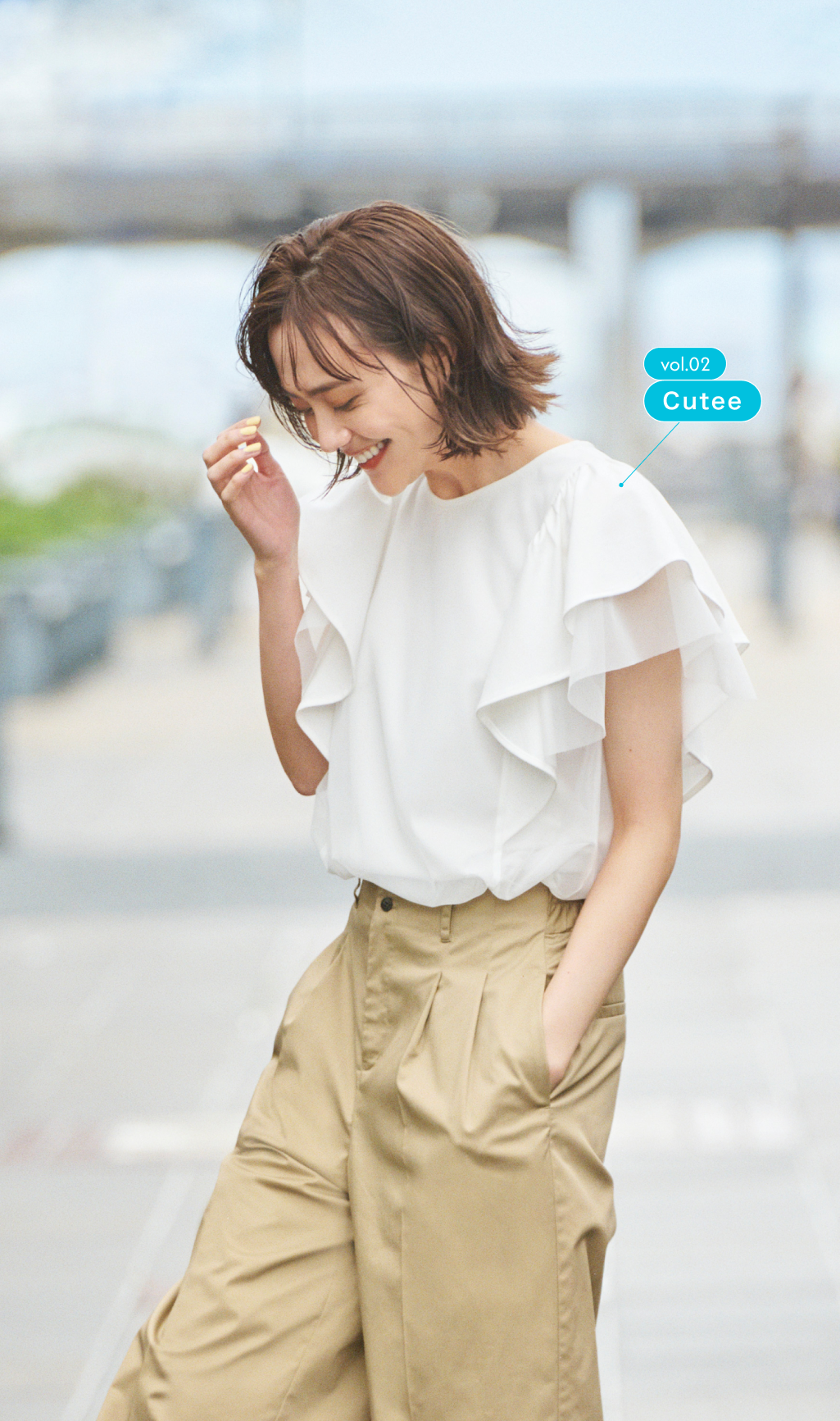 甘めのディテールが効いたトップスには、気負わずはけるデニムを合わせてカジュアルダウン。パンツはワイドレッグを選んでトレンド感のある装いに。