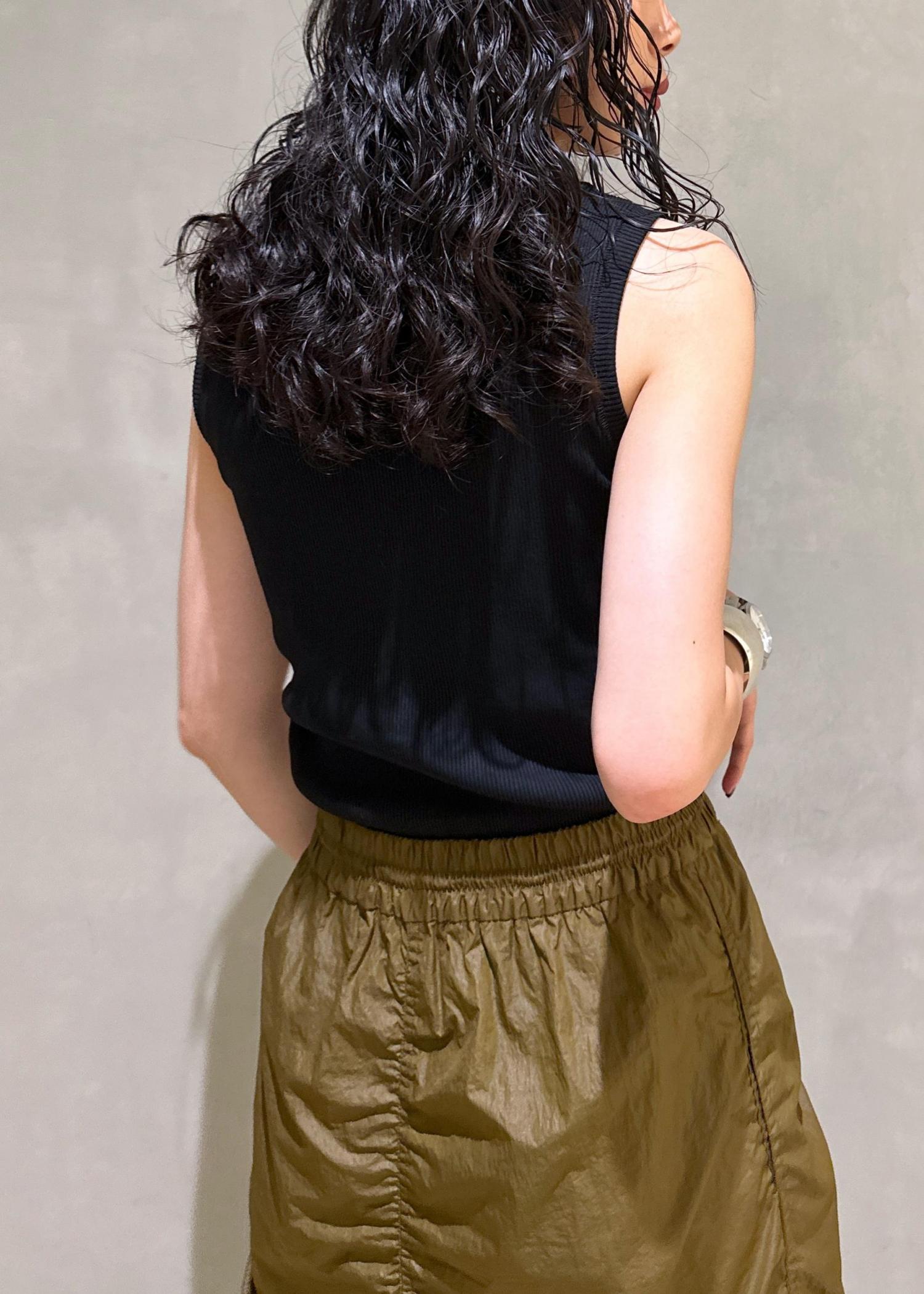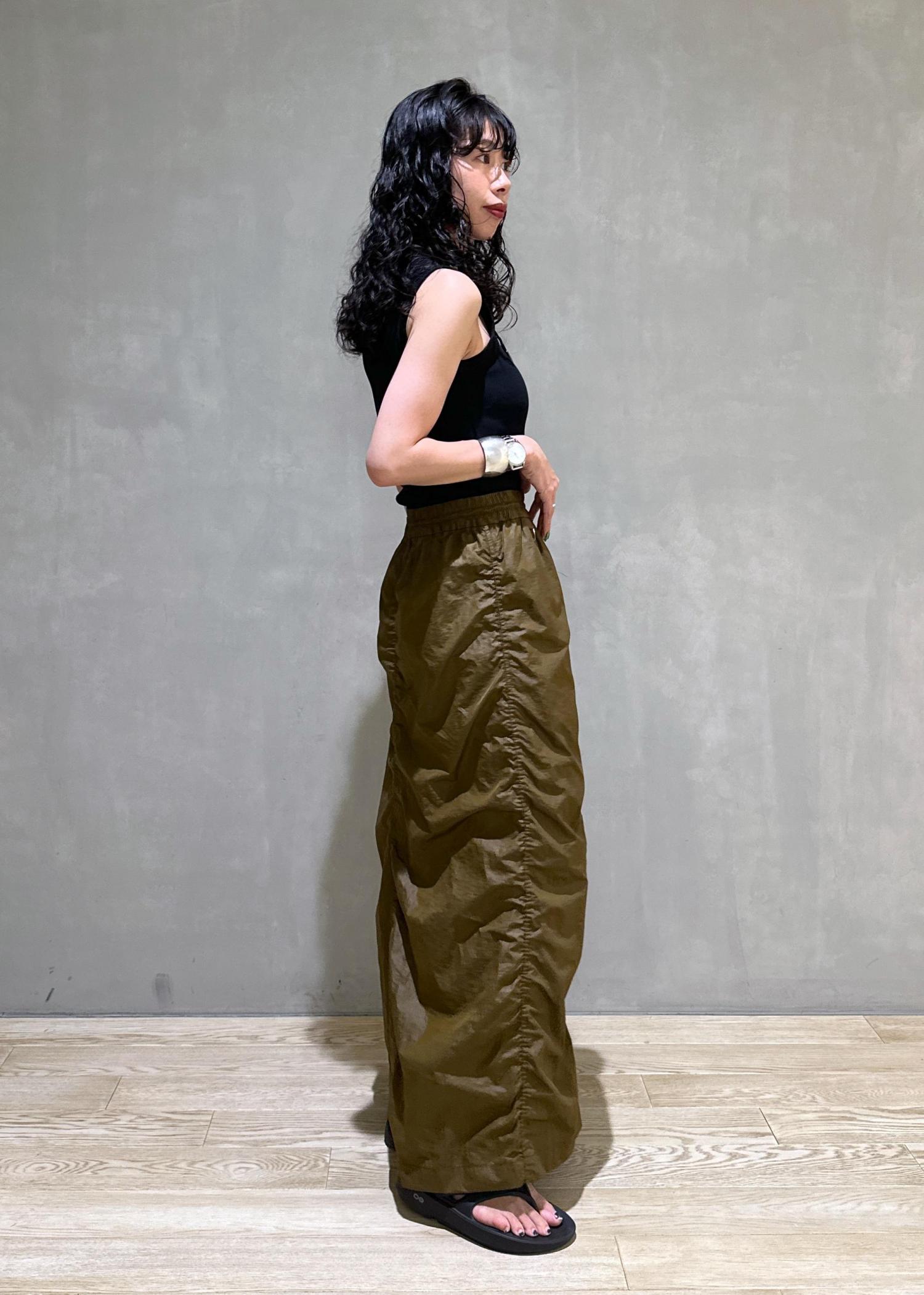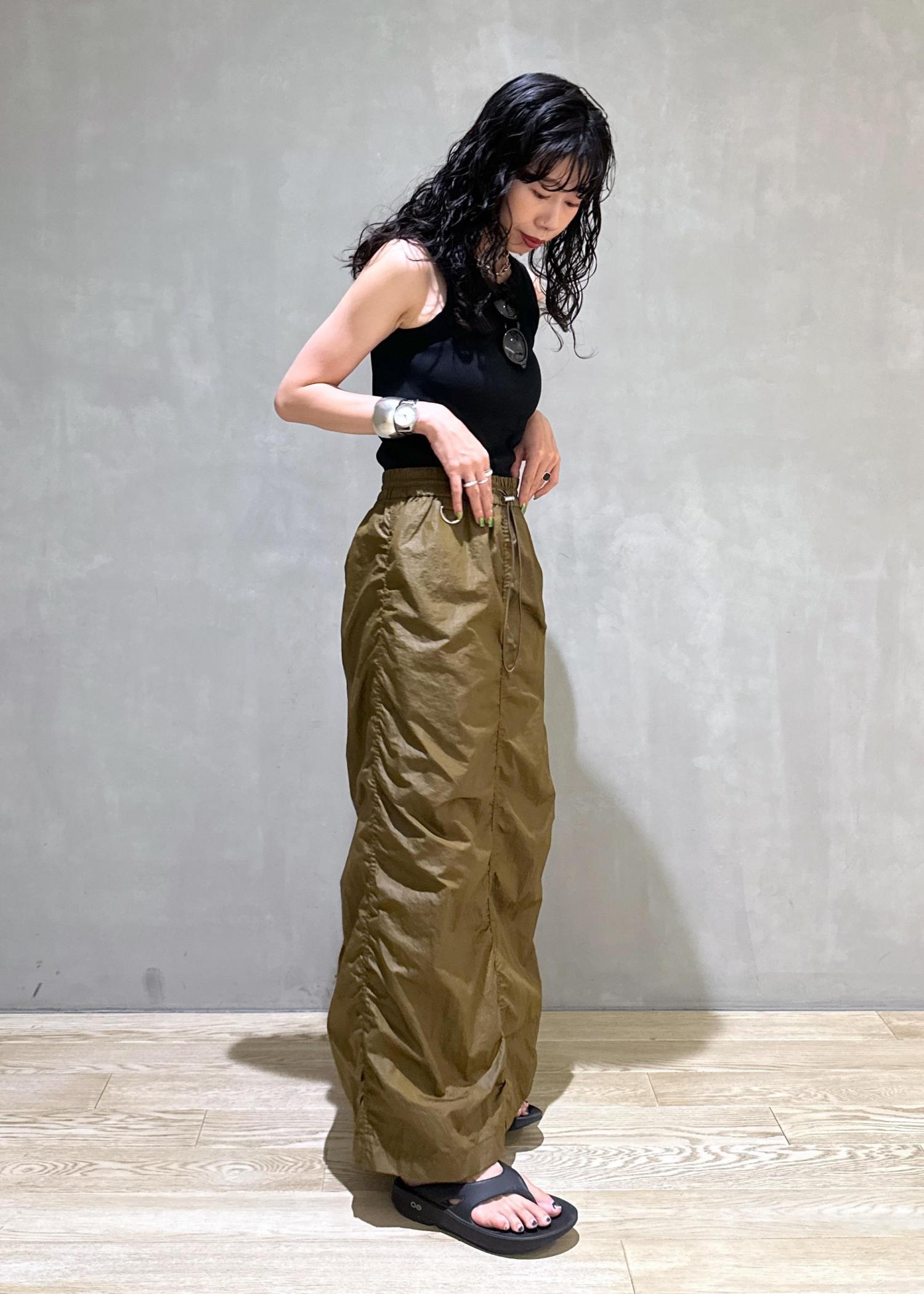 ナイロンスカートは、色味も形も一癖あってとってもお気に入り。後ろにスリットが入っていて動きやすいですよ〜^ ^♪♪