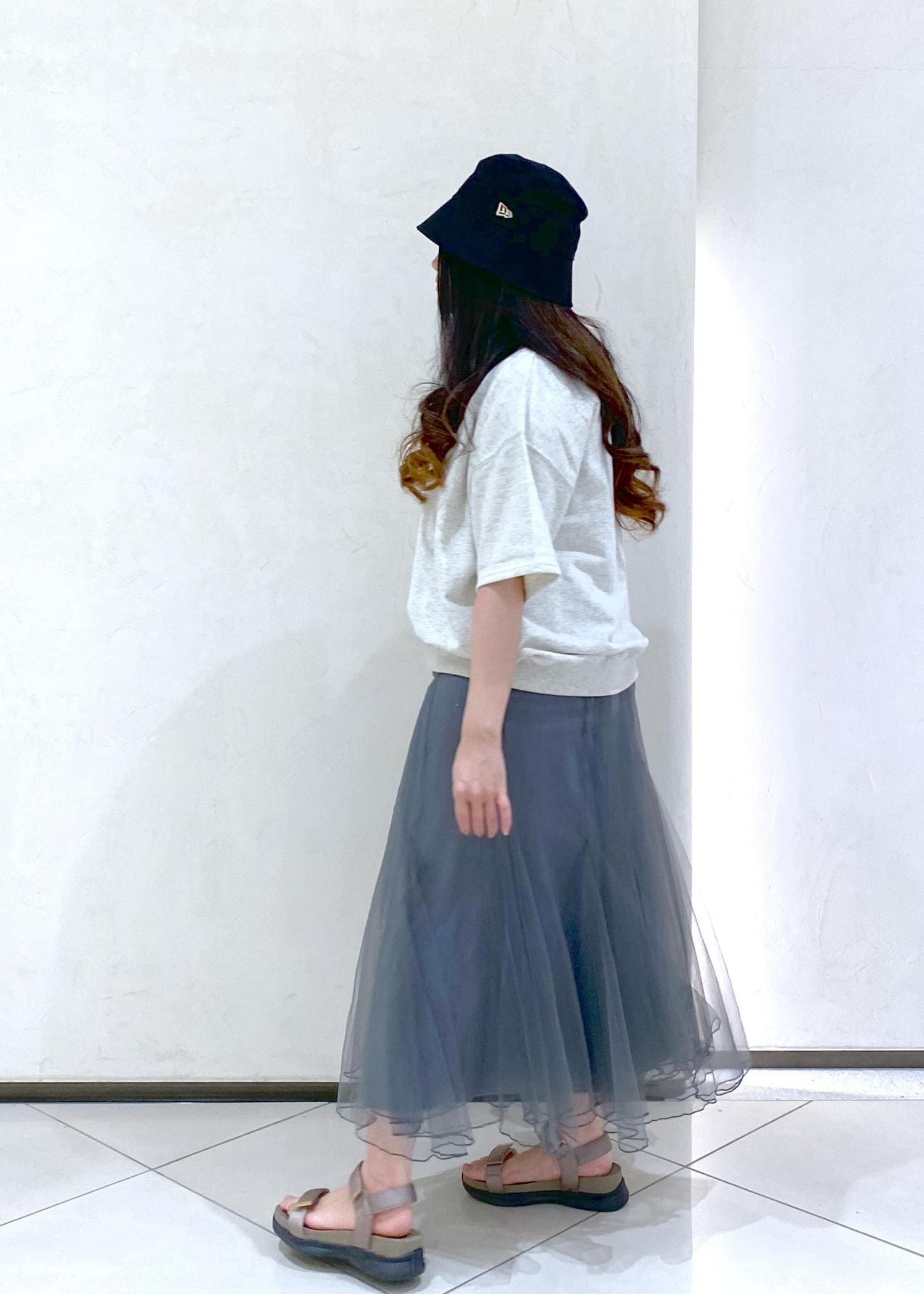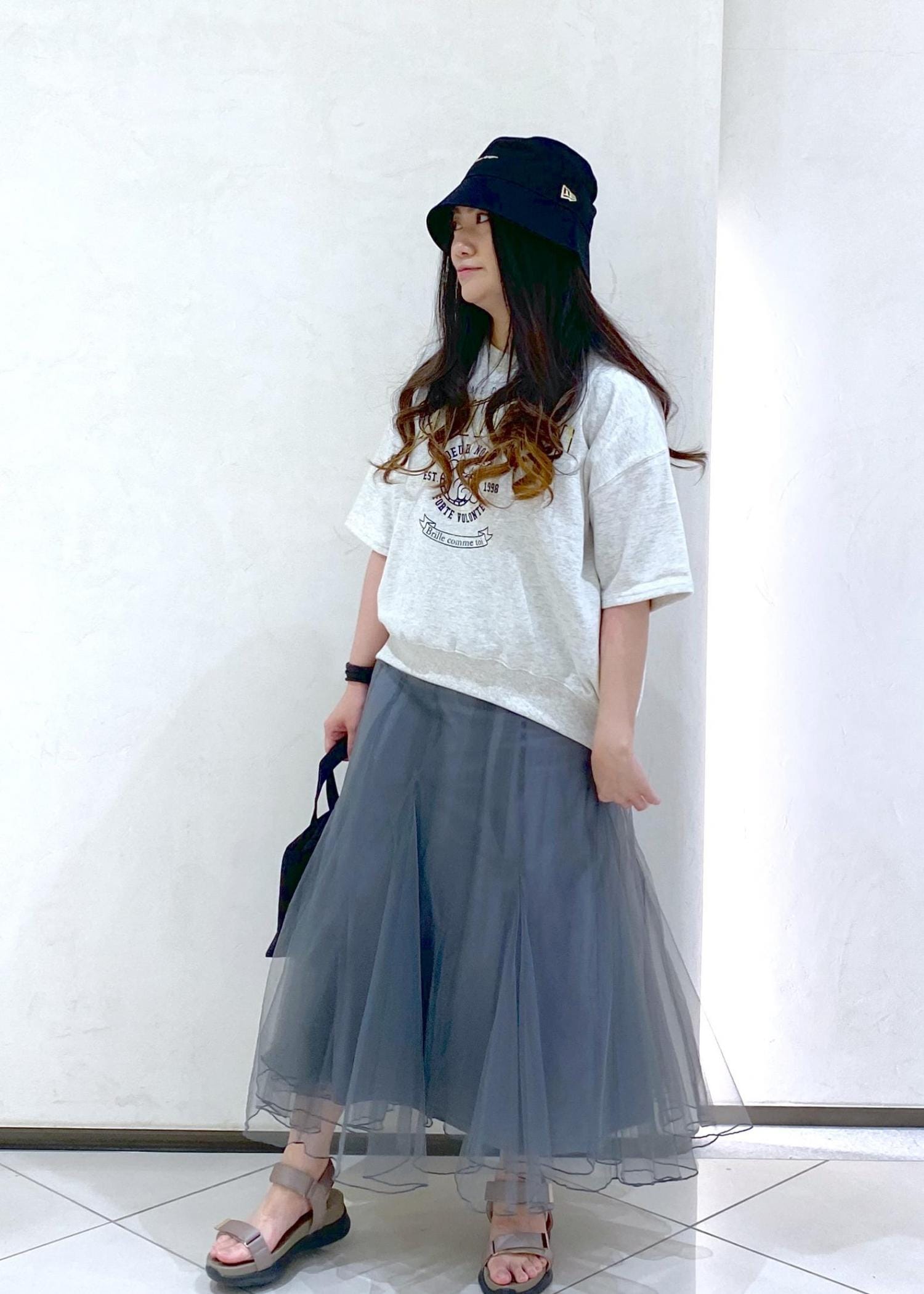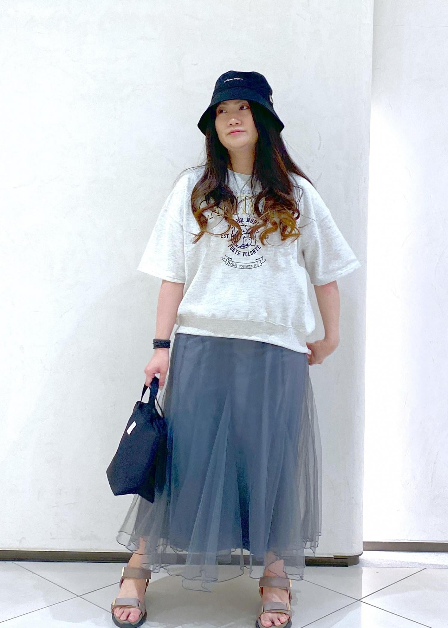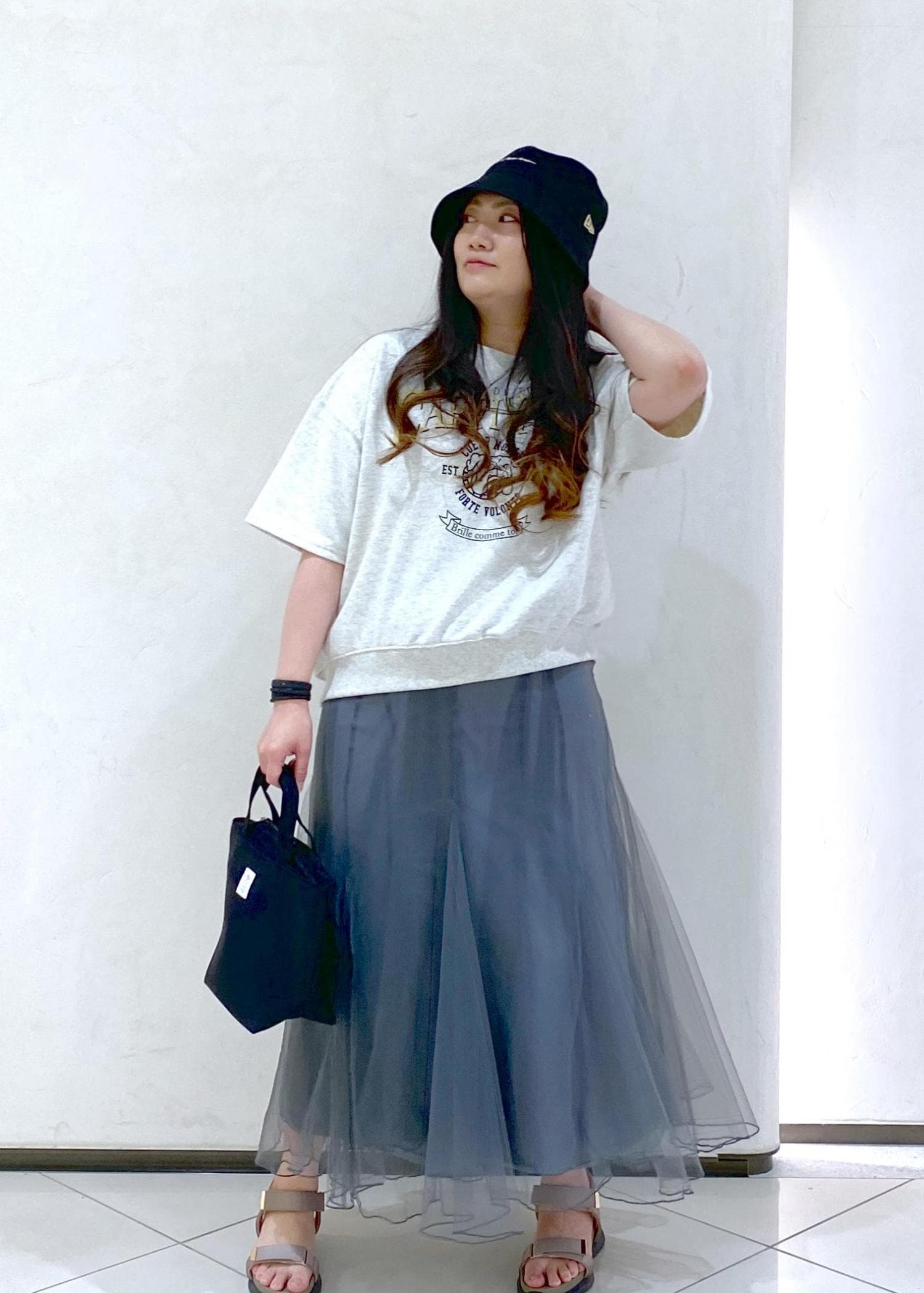 甘めに見えるチュールスカートにスウェットを合わせて、カジュアルがお好きな方にも挑戦しやすいコーデにしました!ぜひお試しください。