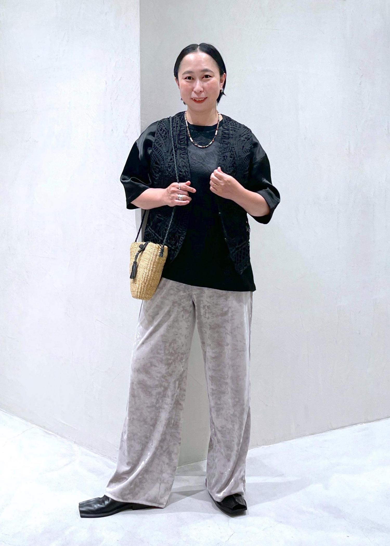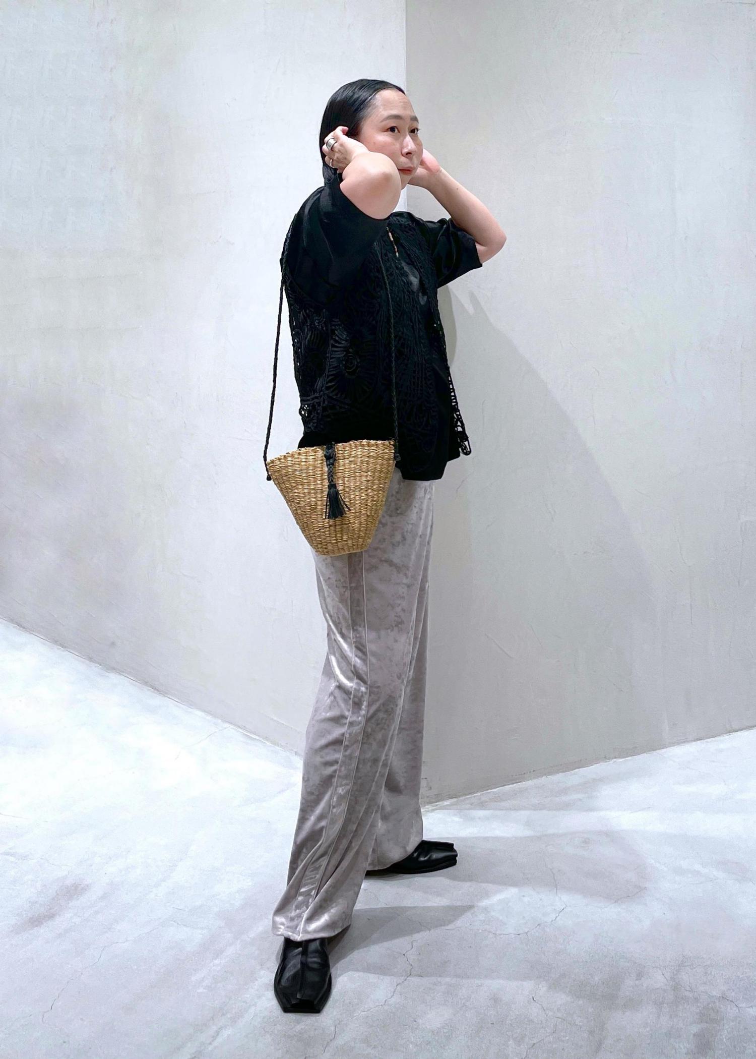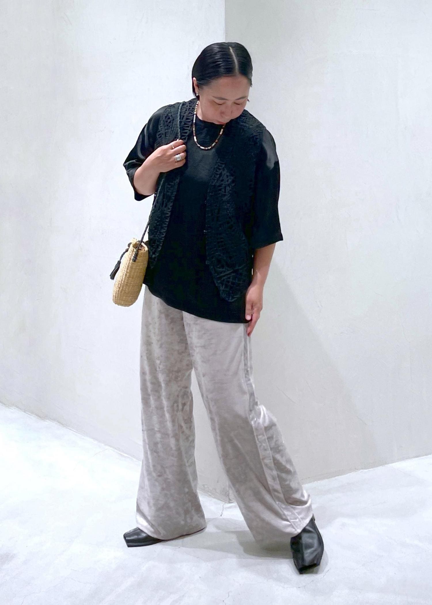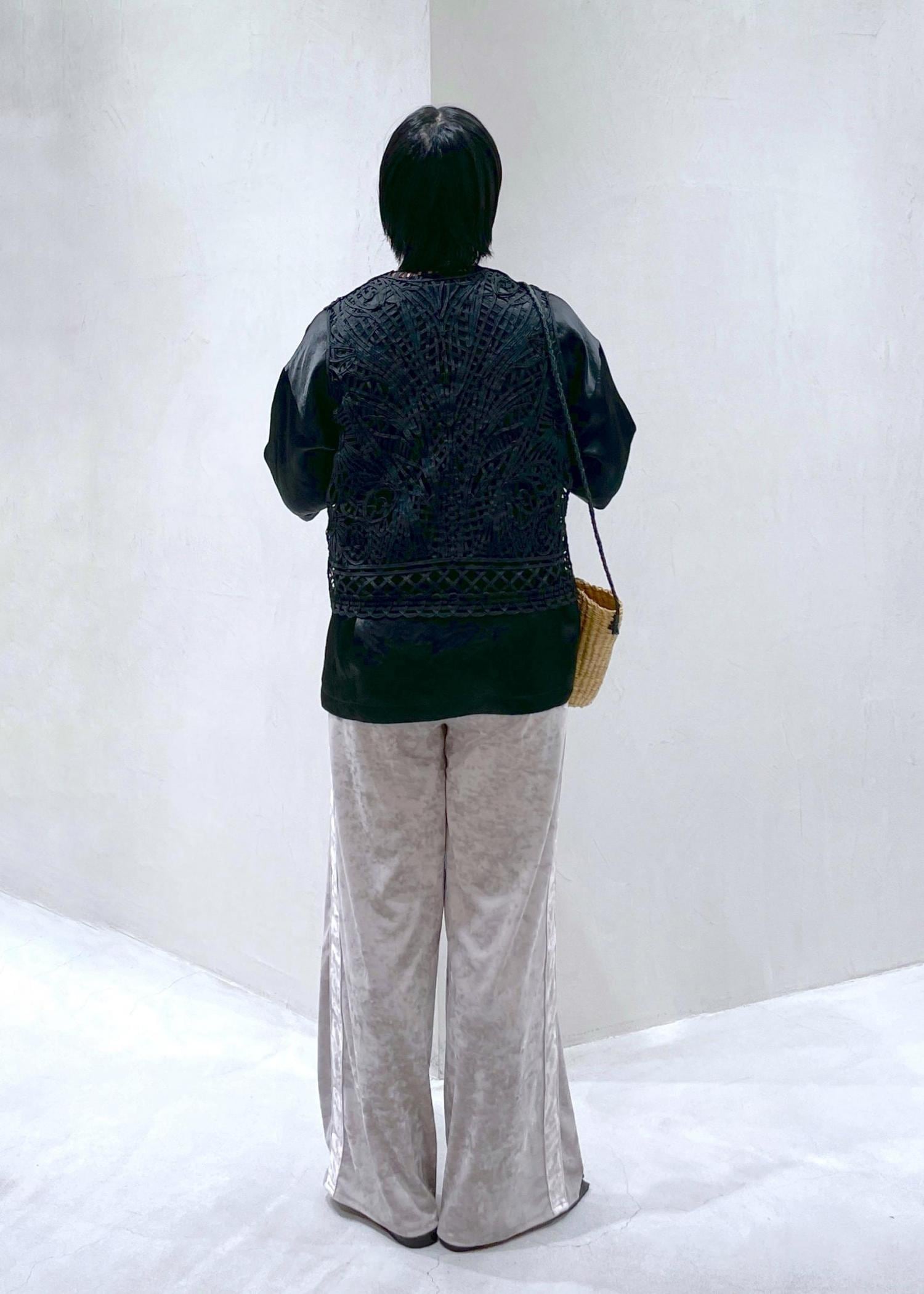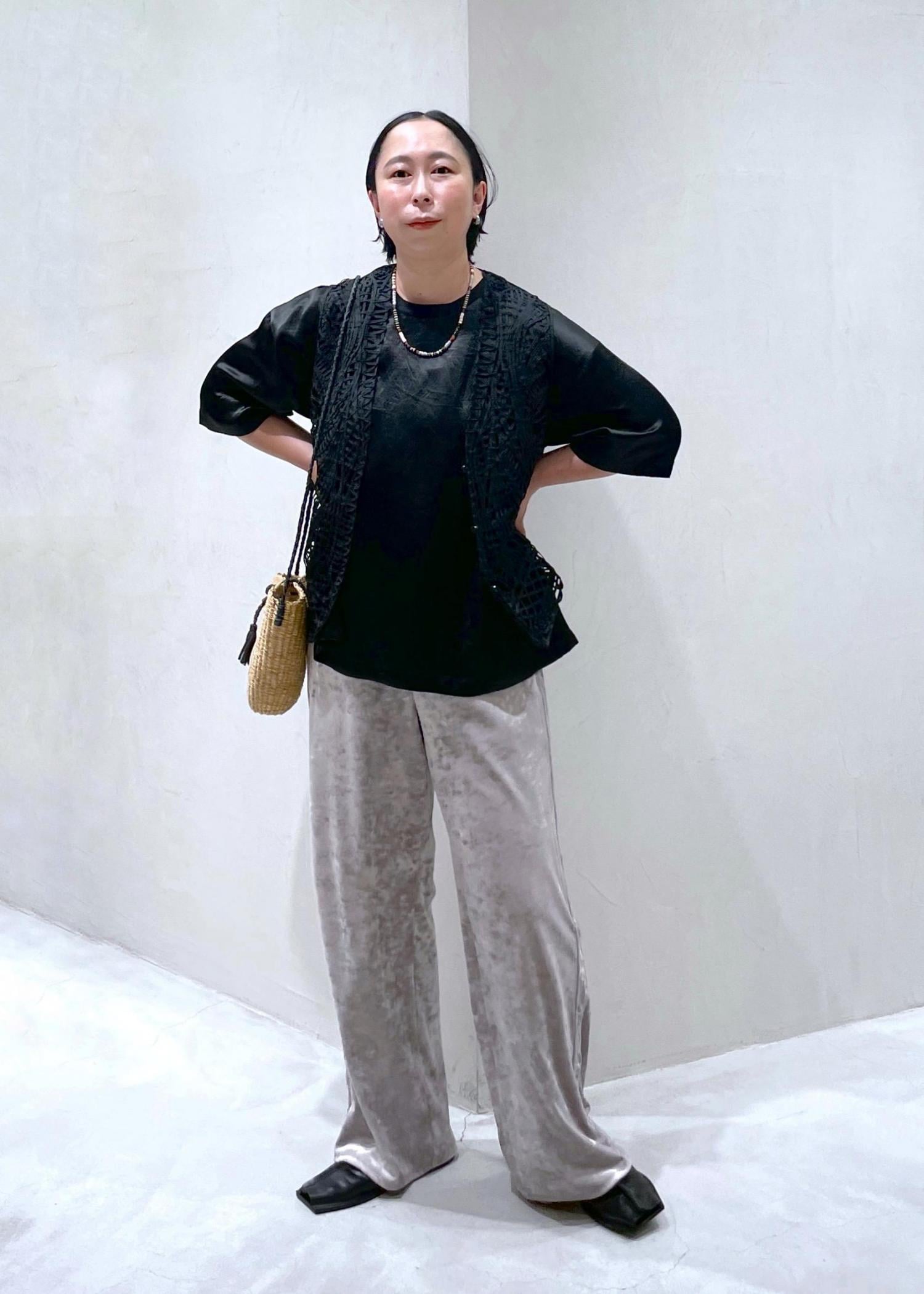 異素材の光沢アイテムをゆるめのシルエットで合わせて、レースジレとレザーサンダルでメリハリを意識しました。