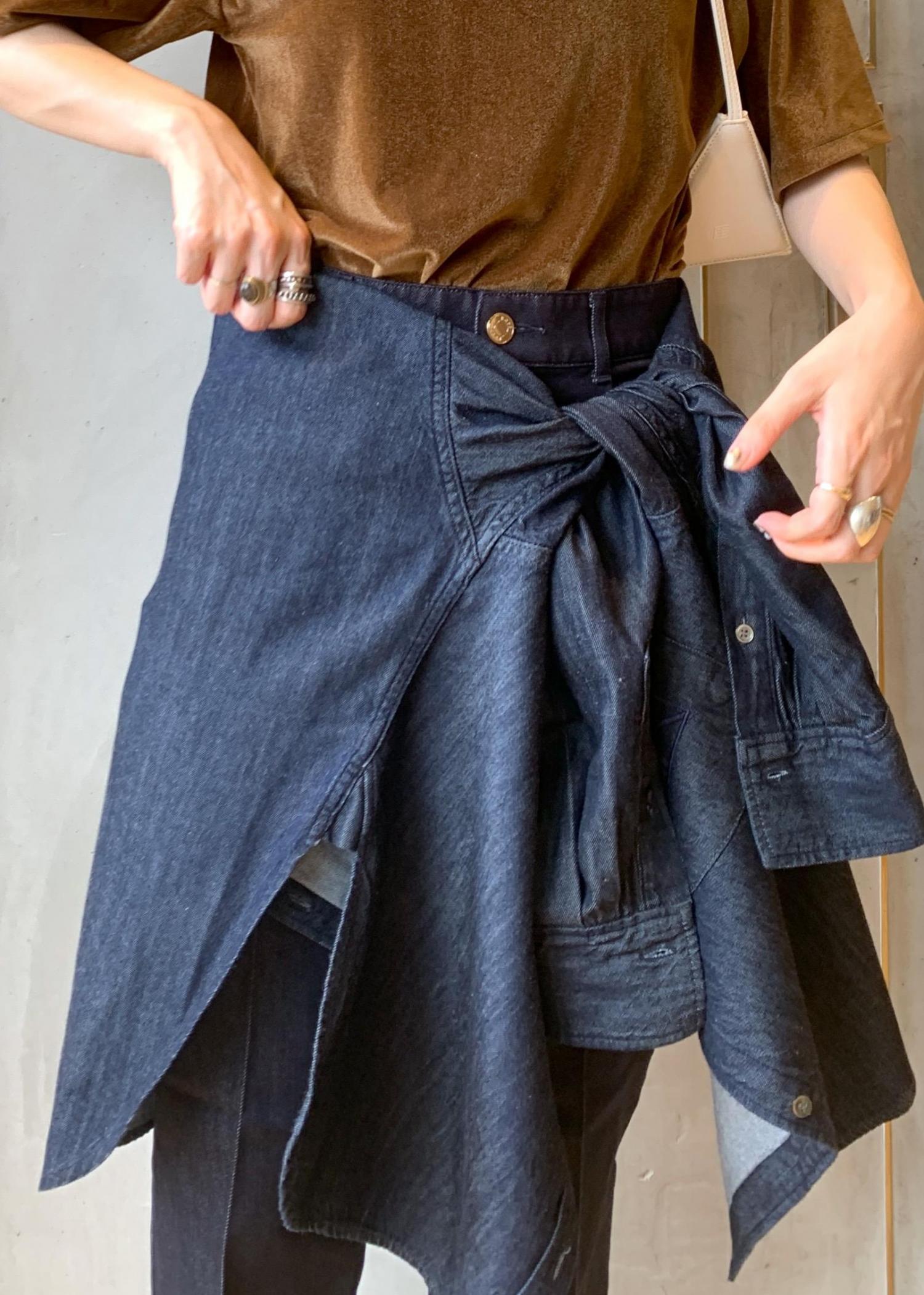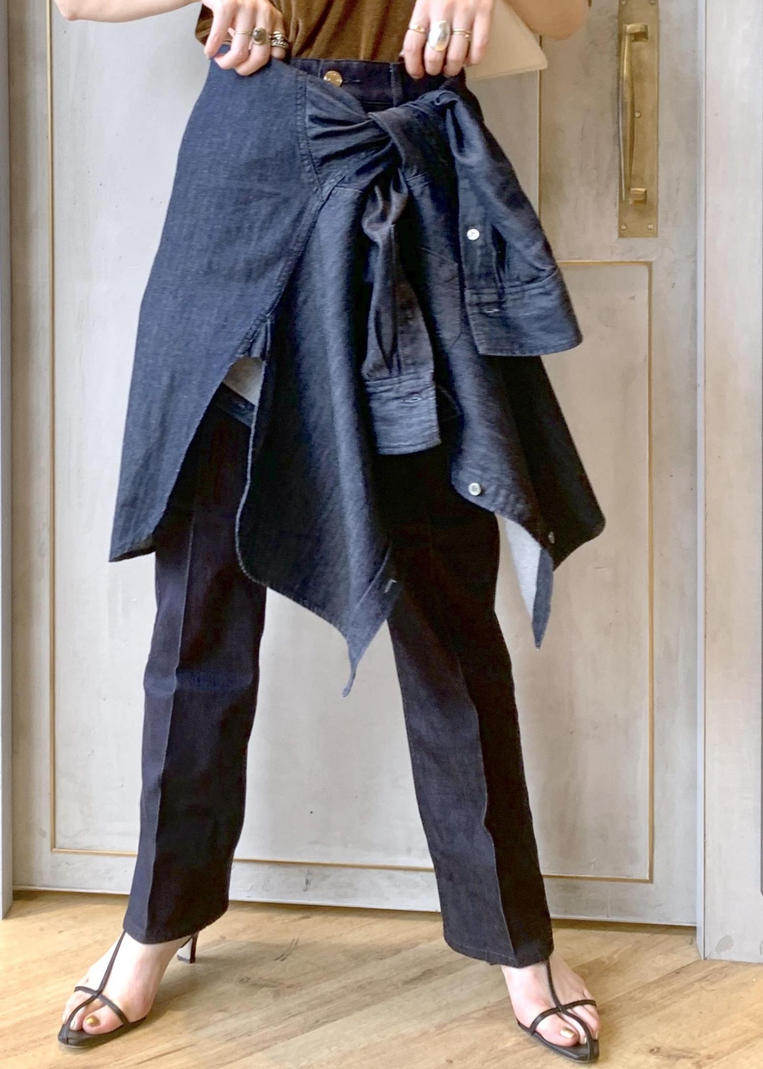 デニムシャツを腰に巻いて、体型カバー+脚長効果を狙いました◎