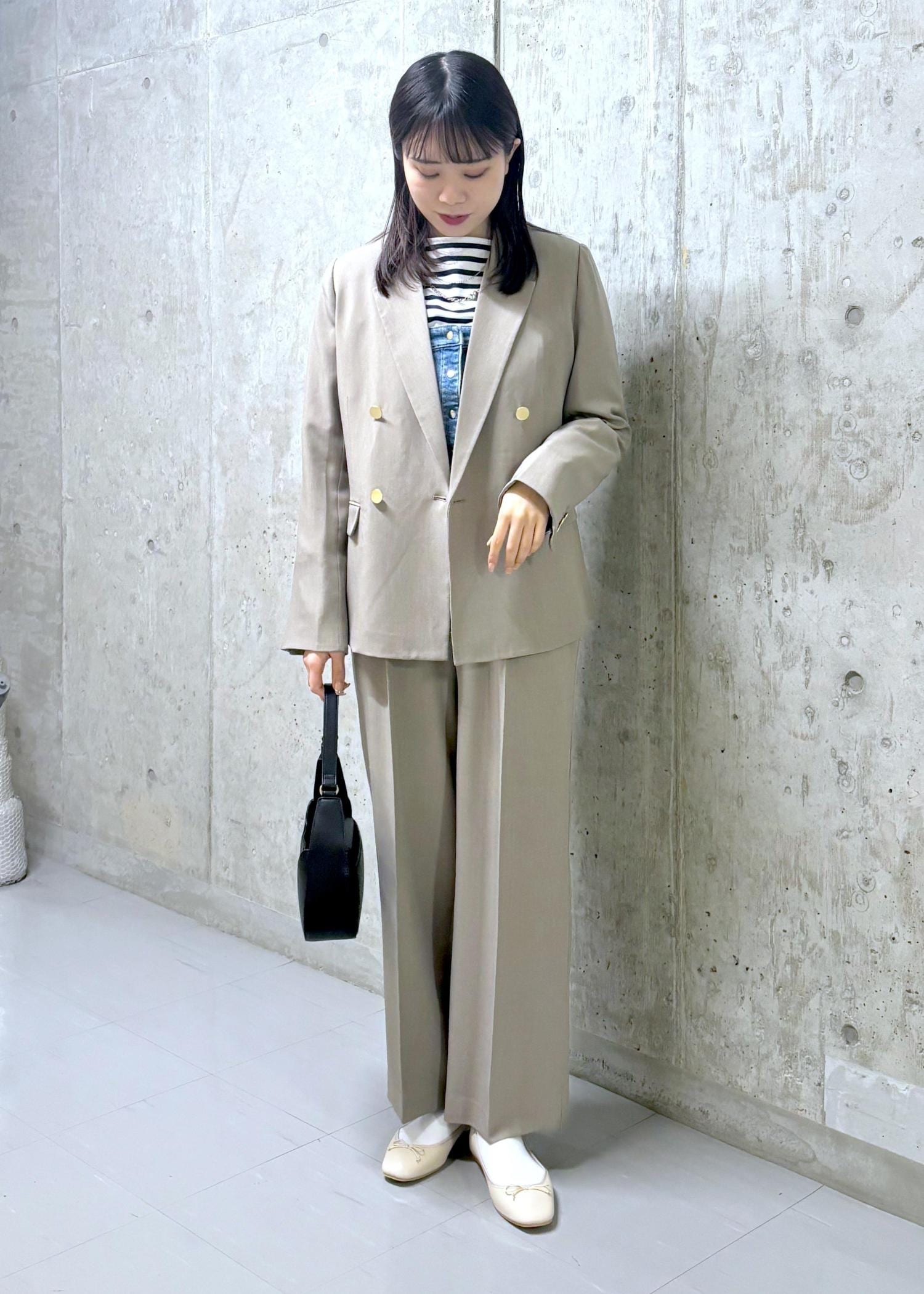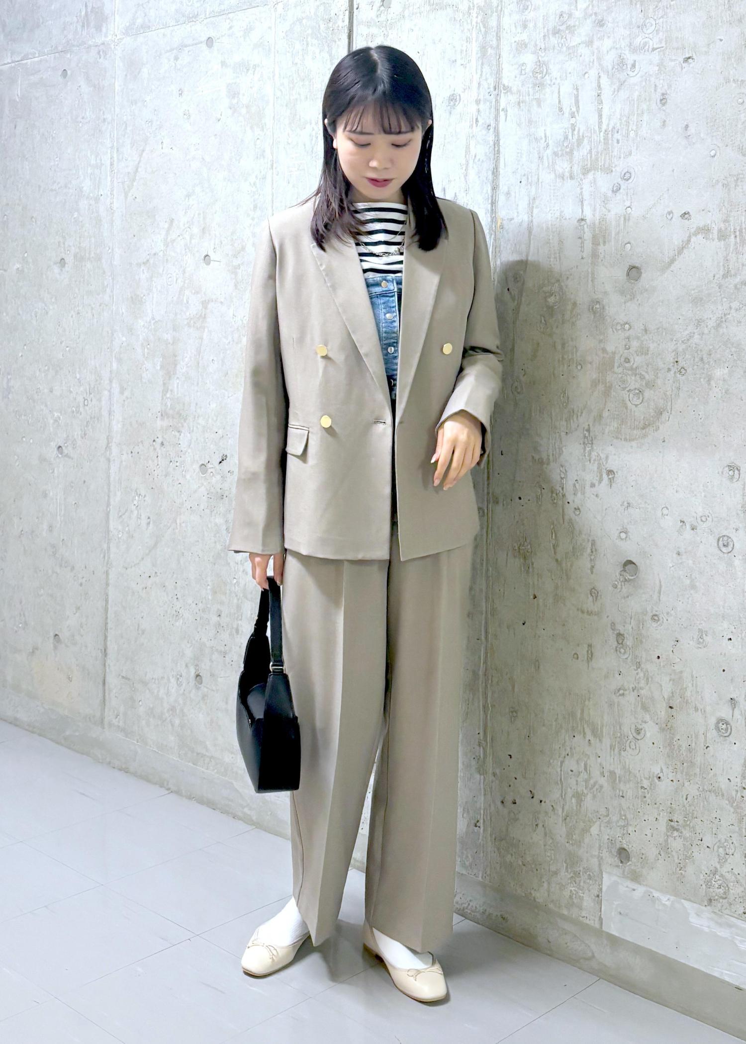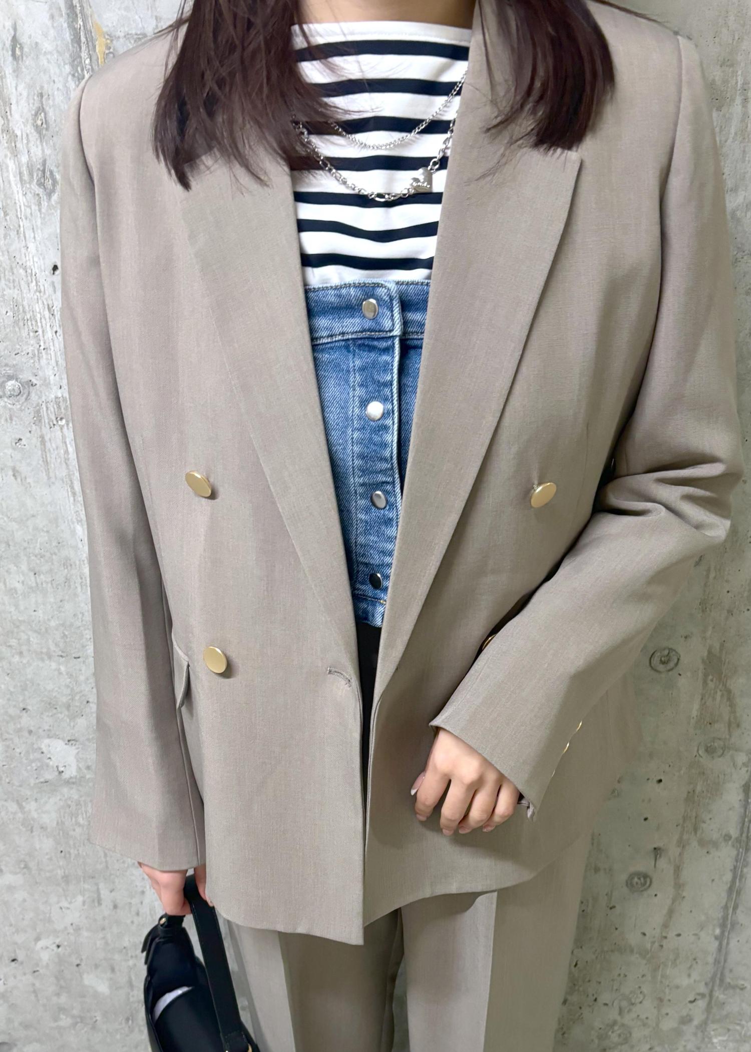 春らしいカラーのジャケットセットアップにインナーはボーダートップス×デニムビスチェで少しカジュアルなコーディネートに仕上げました◎