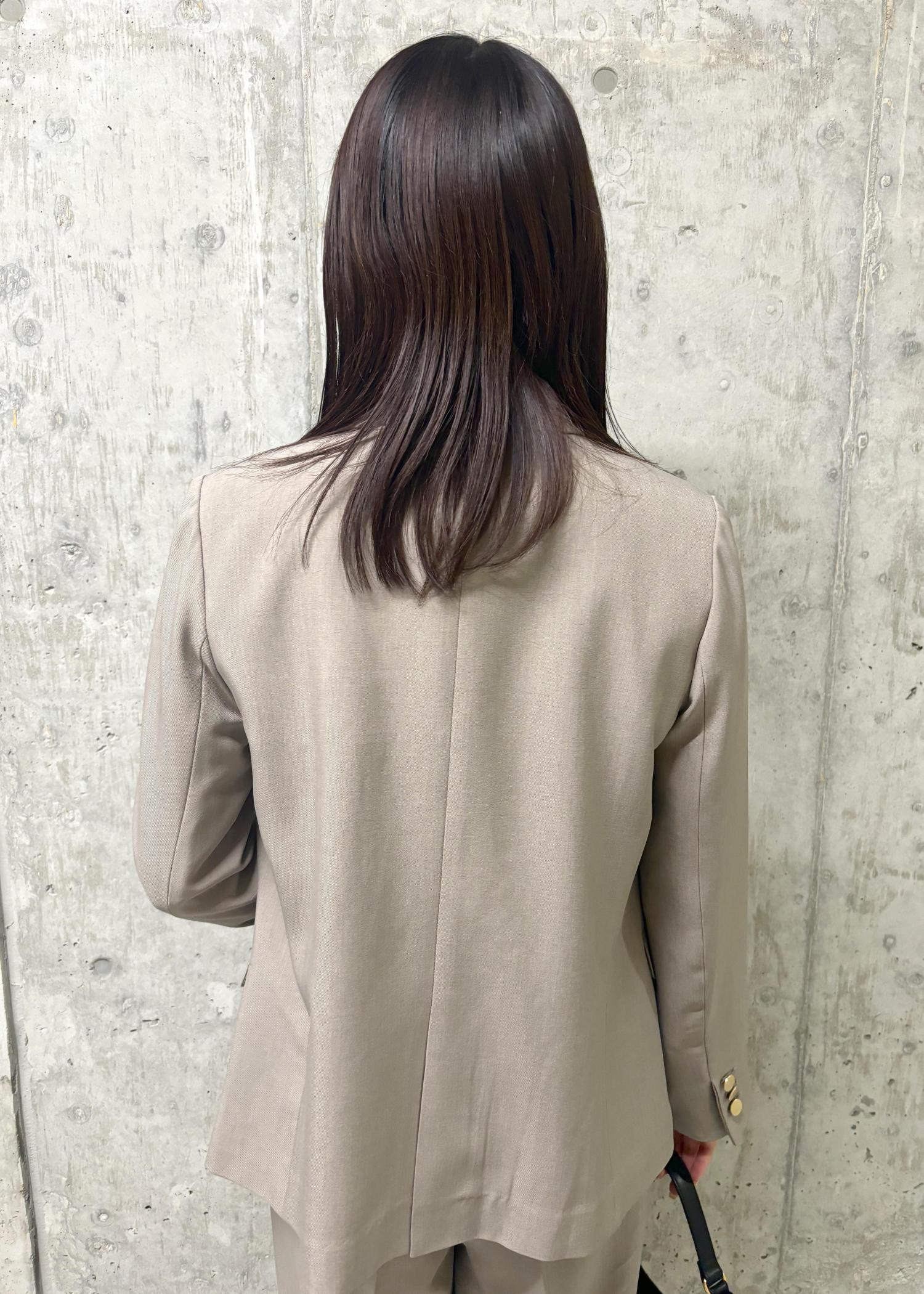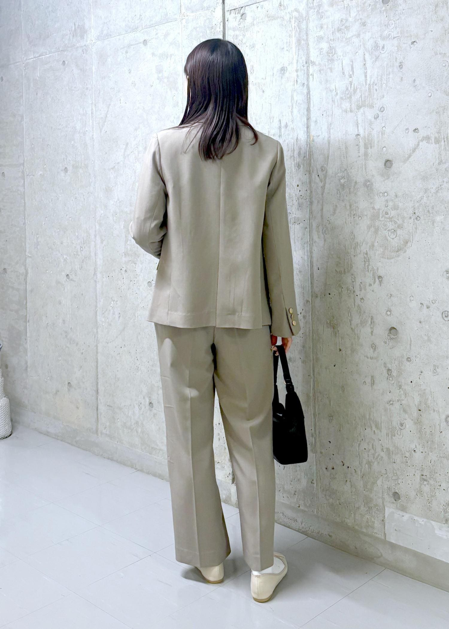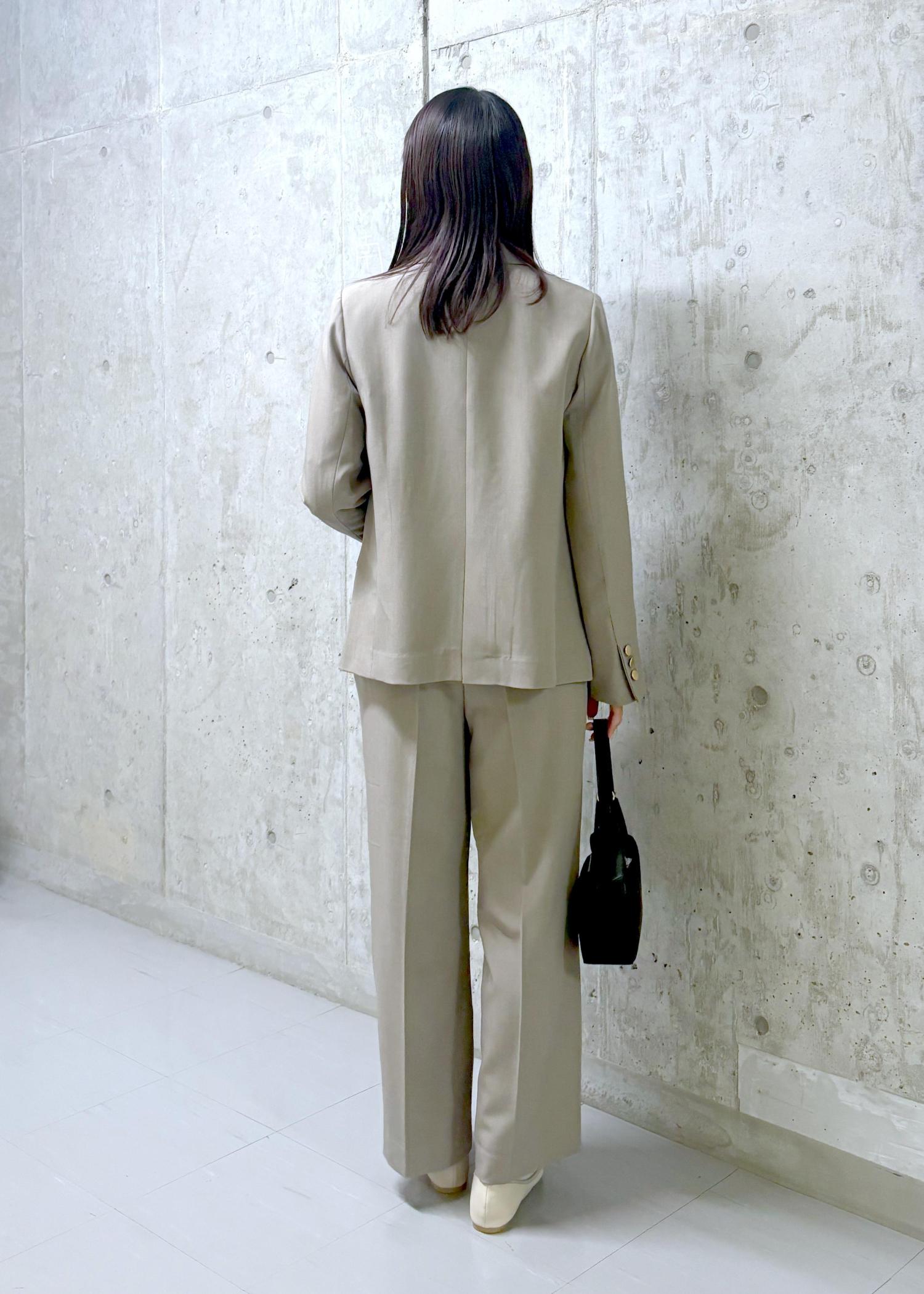 春らしいカラーのジャケットセットアップにインナーはボーダートップス×デニムビスチェで少しカジュアルなコーディネートに仕上げました◎
