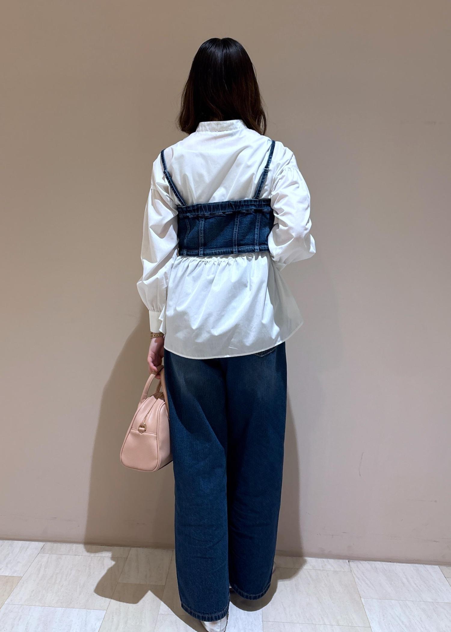 これからの時期にピッタリなデニムビスチェを使った大人カジュアルコーデ。