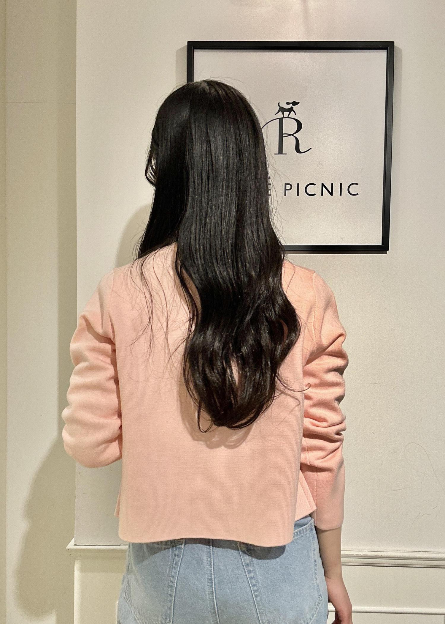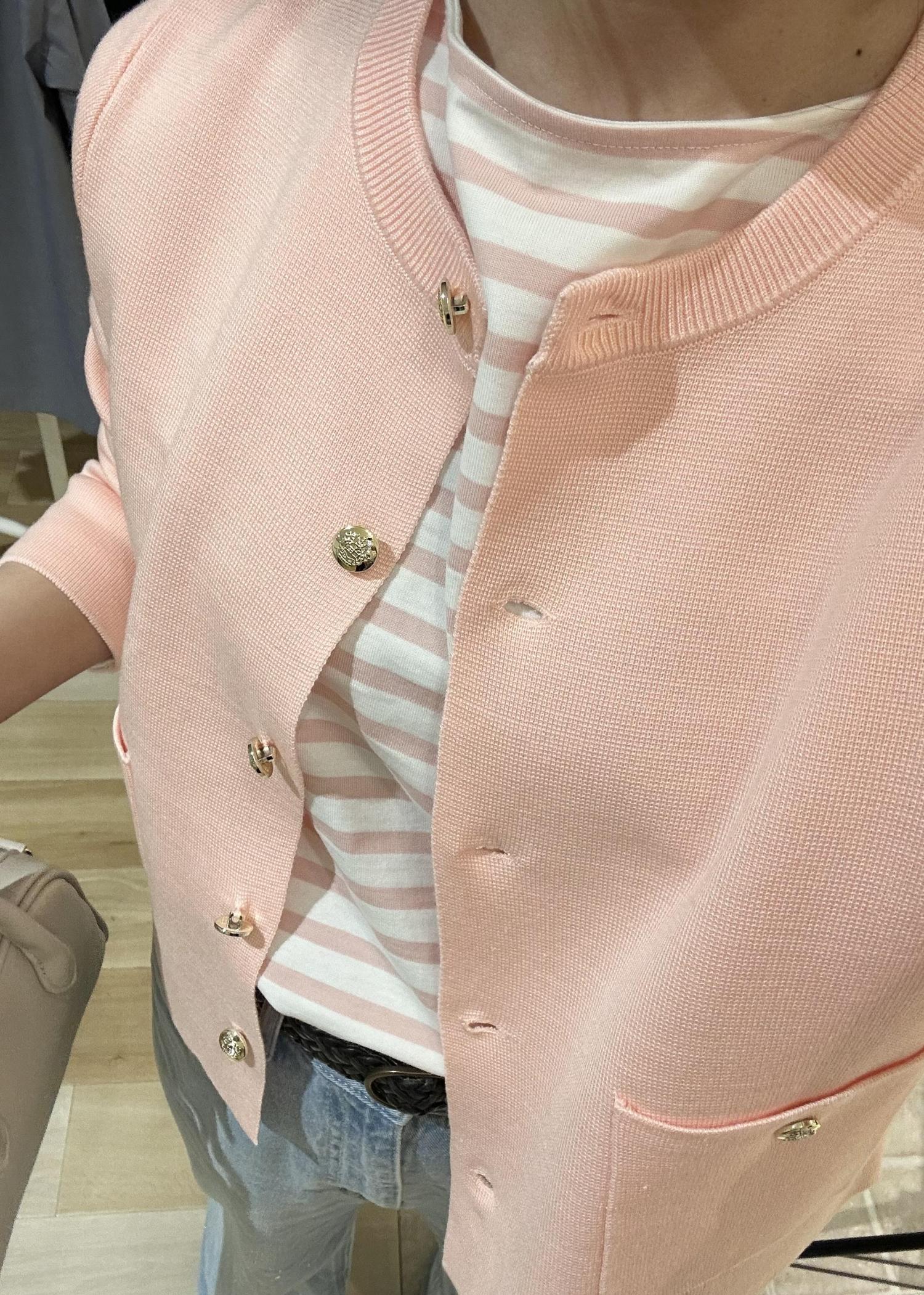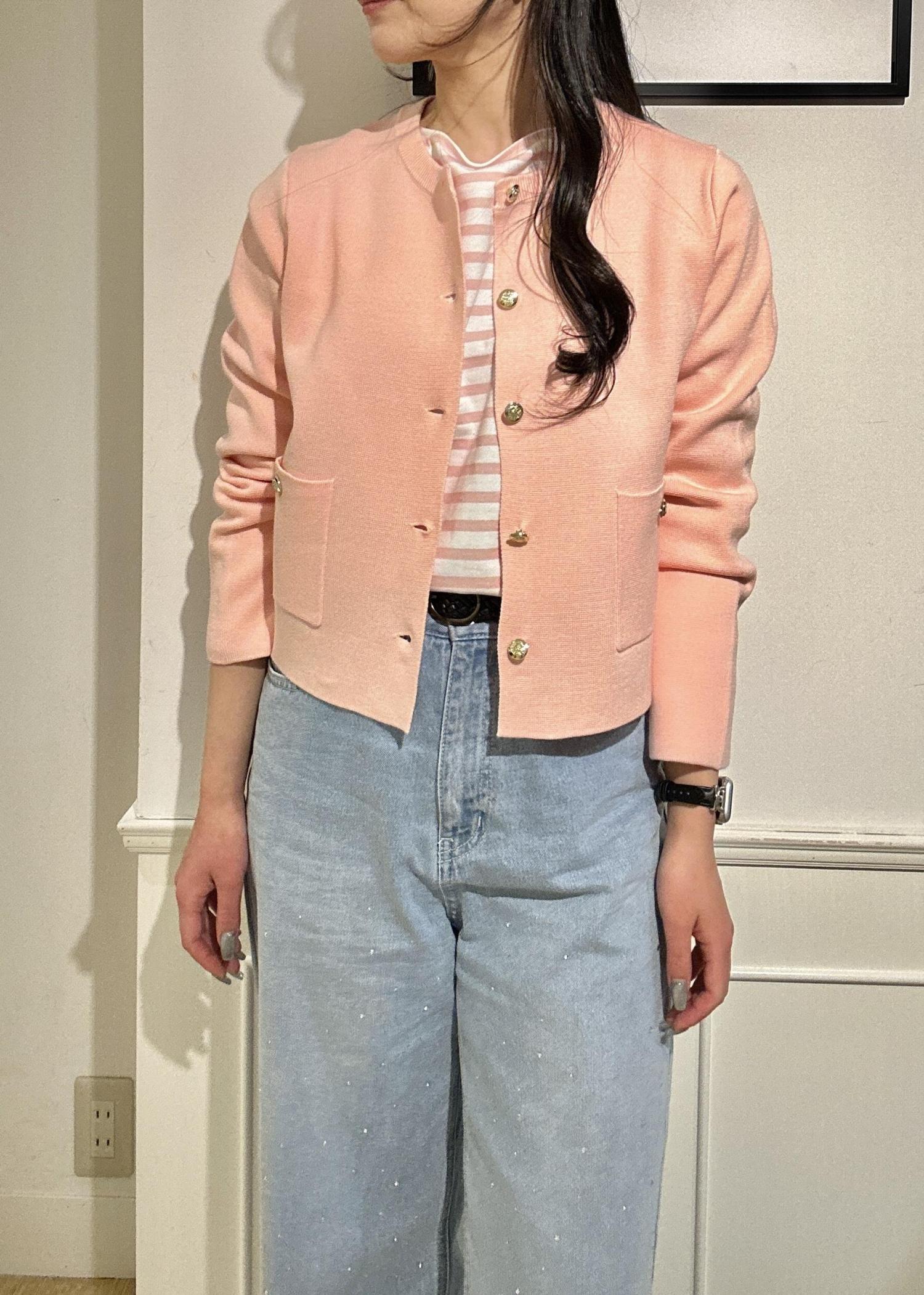 ピンクのカーディガンは、ゴールドのボタンがアクセントになっていて上品見えするアイテムです。