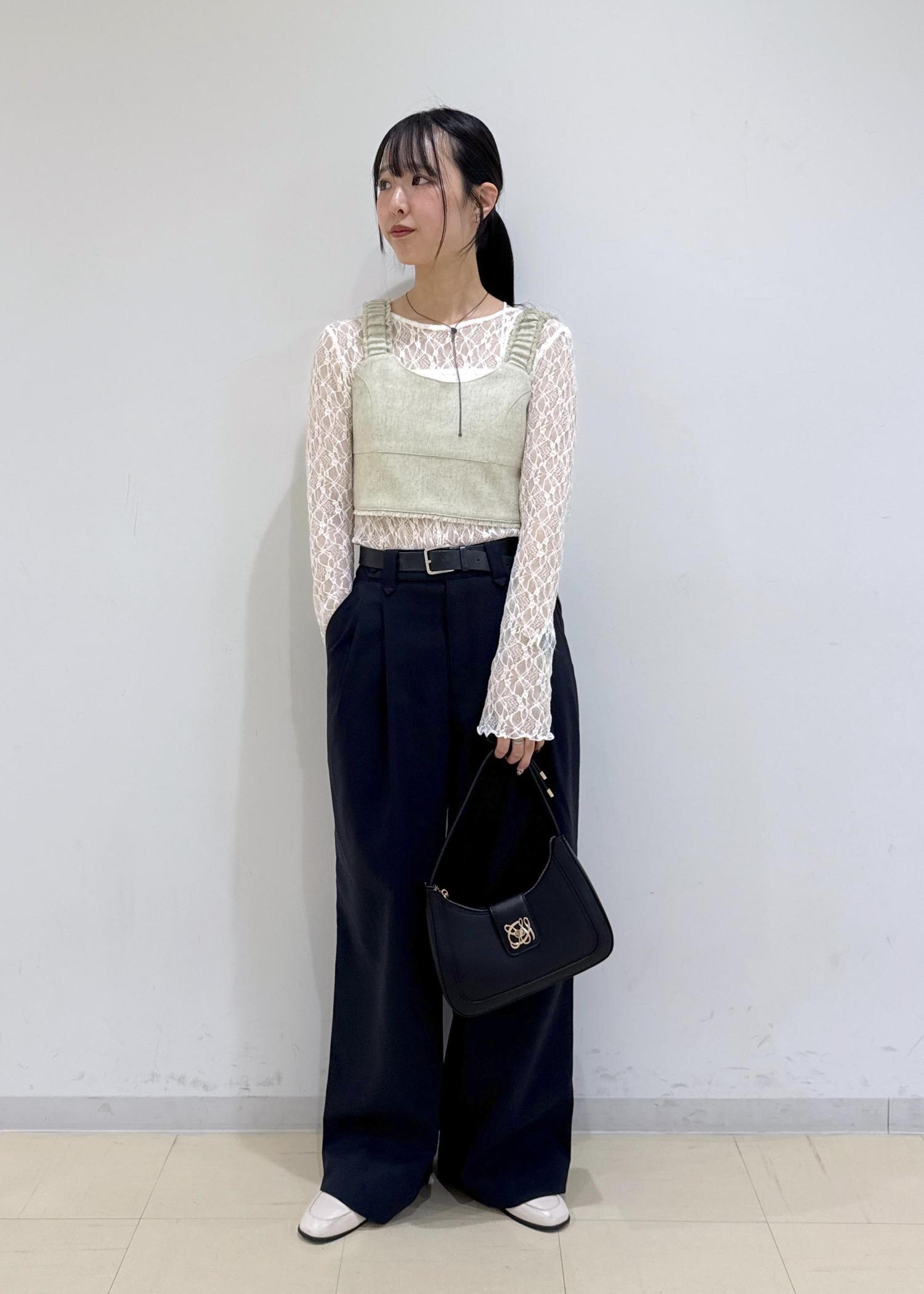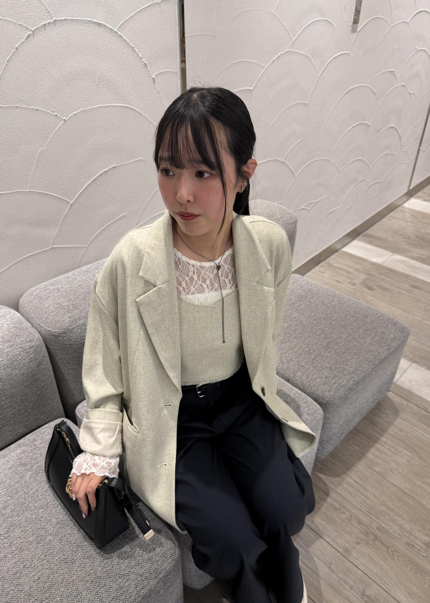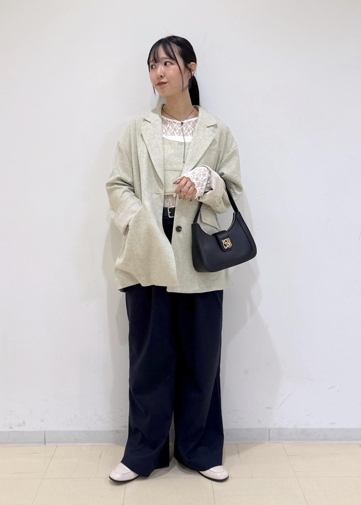 オーバーサイズ×パンツでかなりカジュアルめに見えますが、レースインナーを入れることで女性らしさをプラス