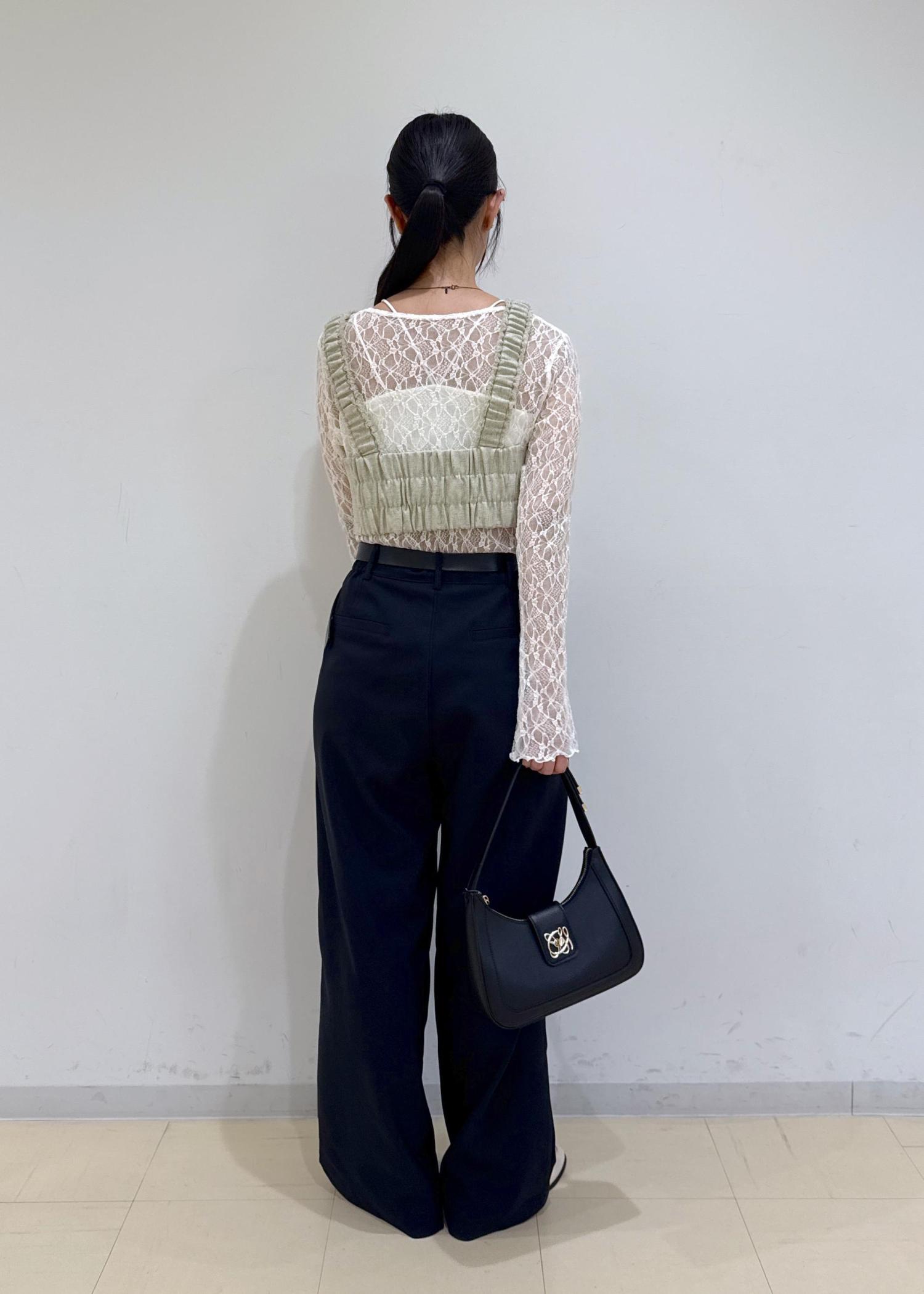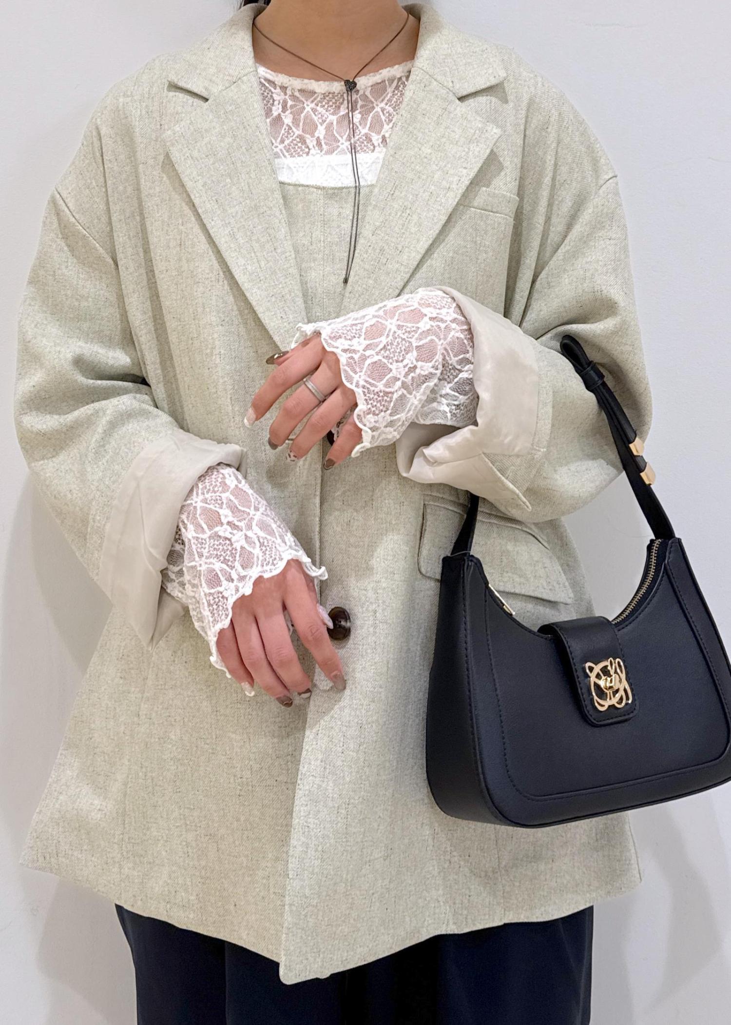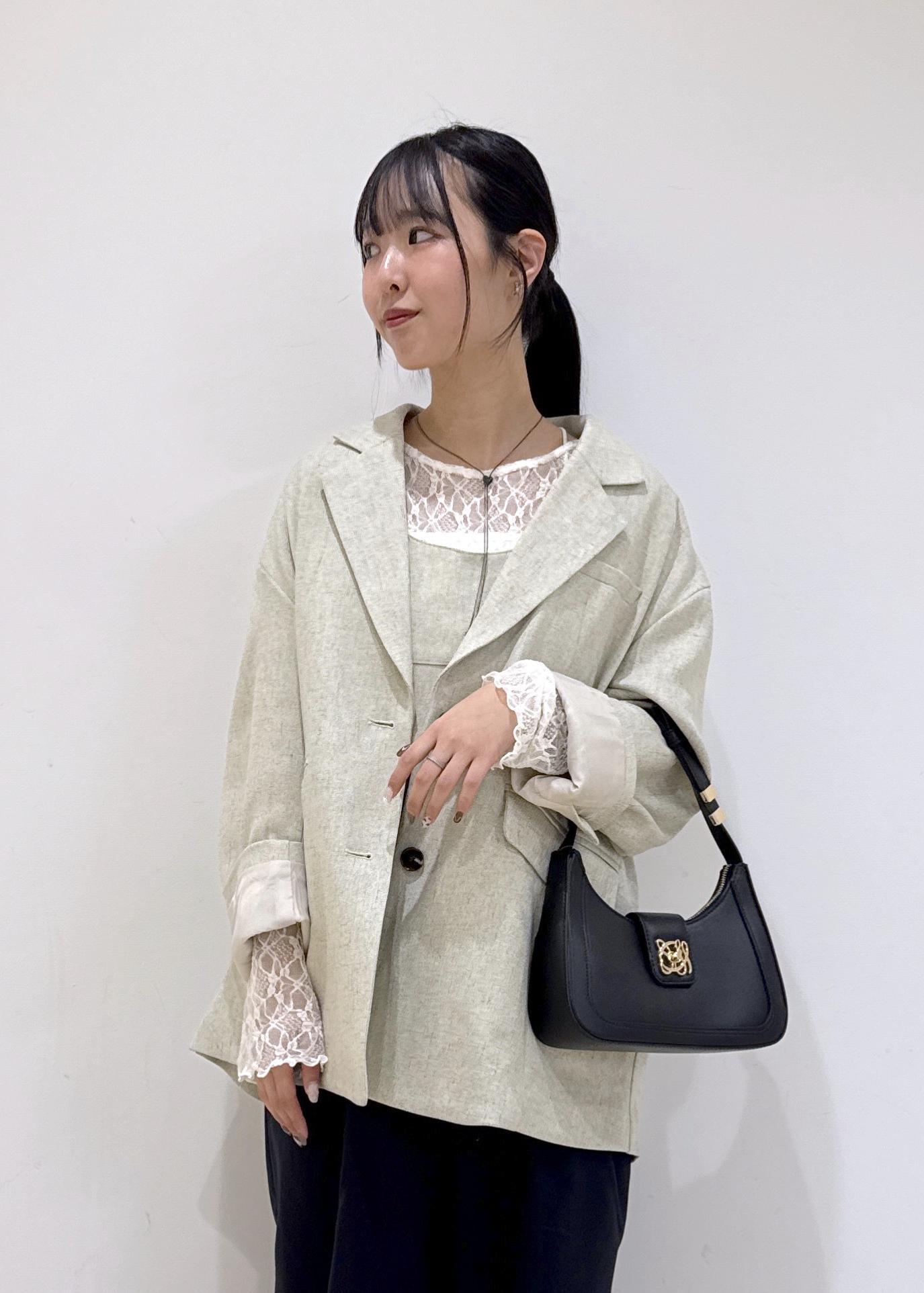 オーバーサイズ×パンツでかなりカジュアルめに見えますが、レースインナーを入れることで女性らしさをプラス