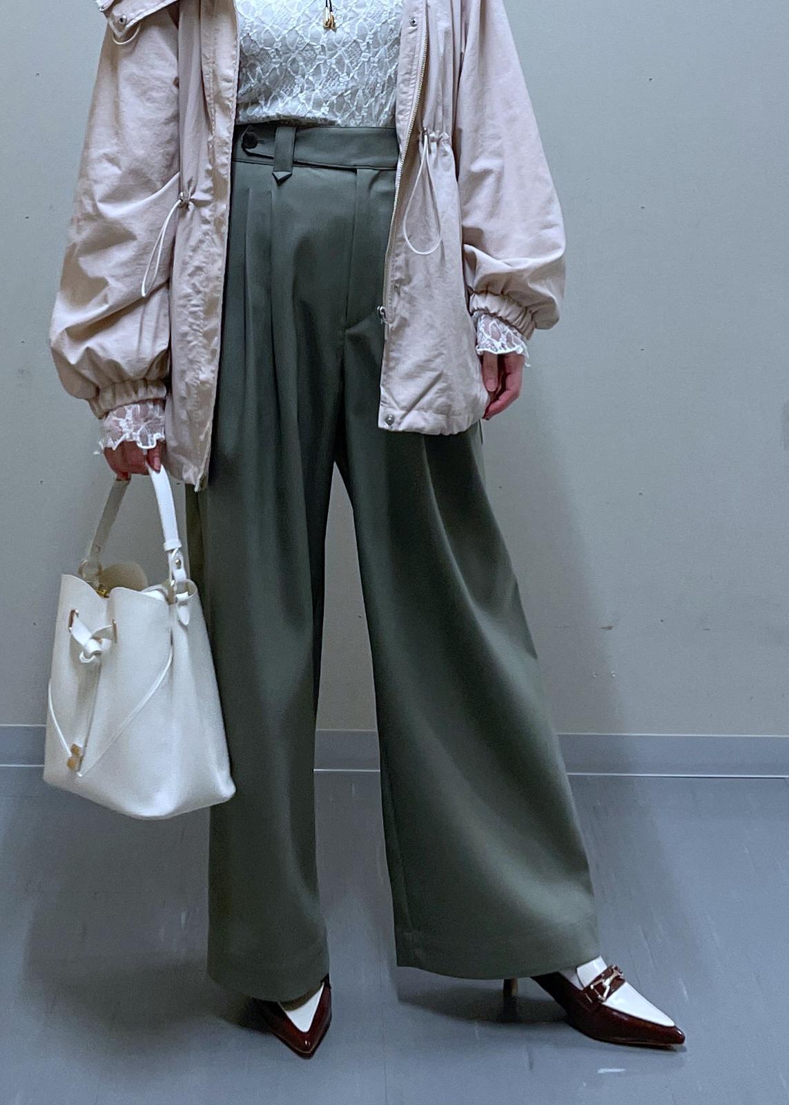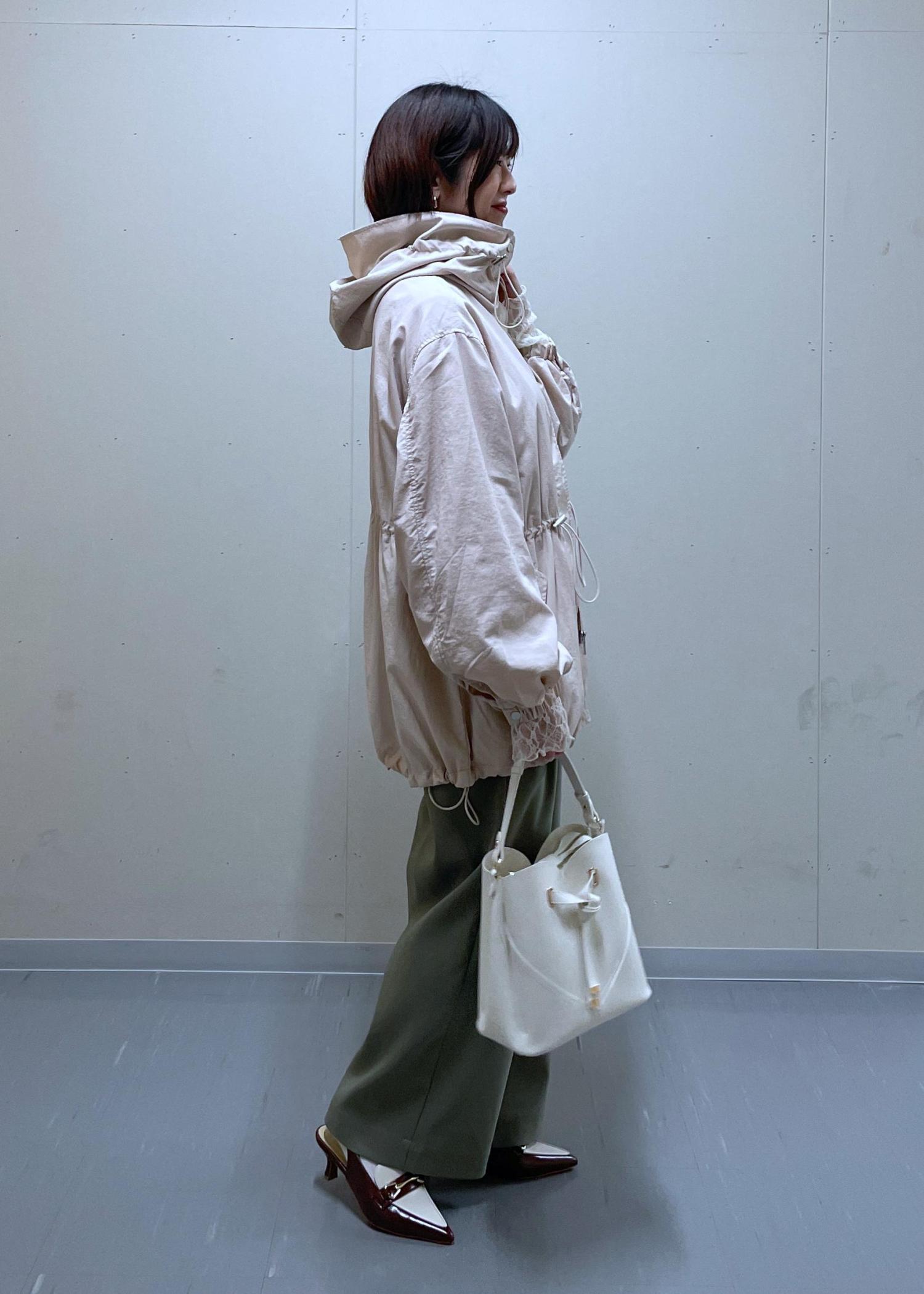 全体的にゆるっとしたシルエットなので、コンパクトなトップスを合わせるのがおすすめです。 -