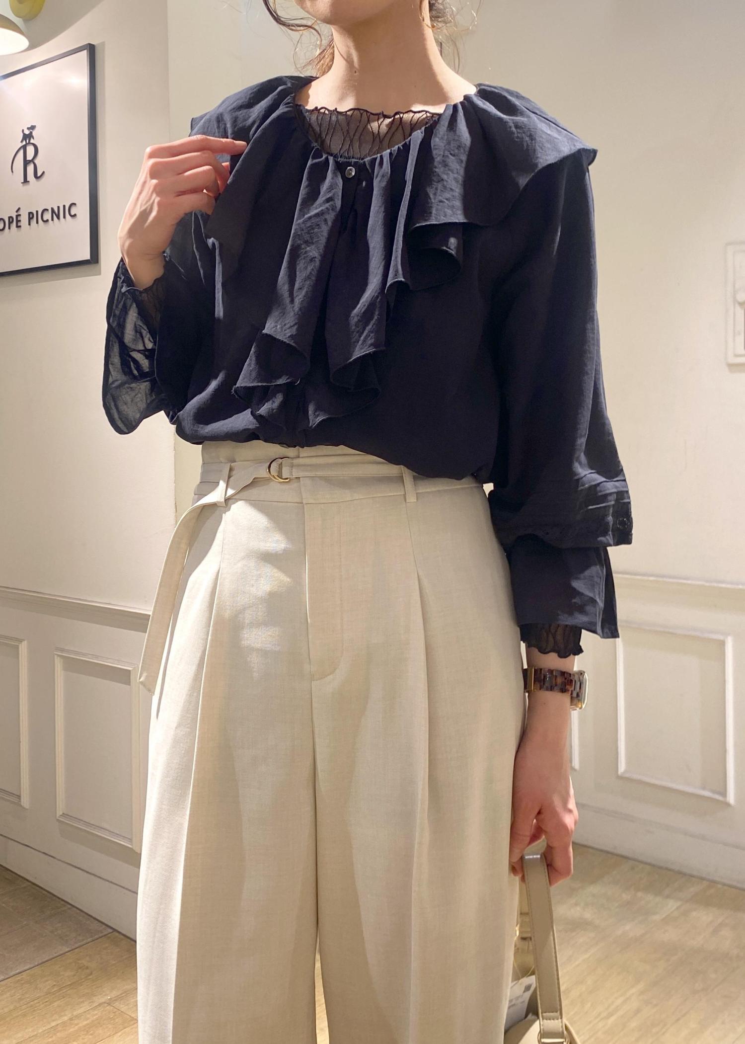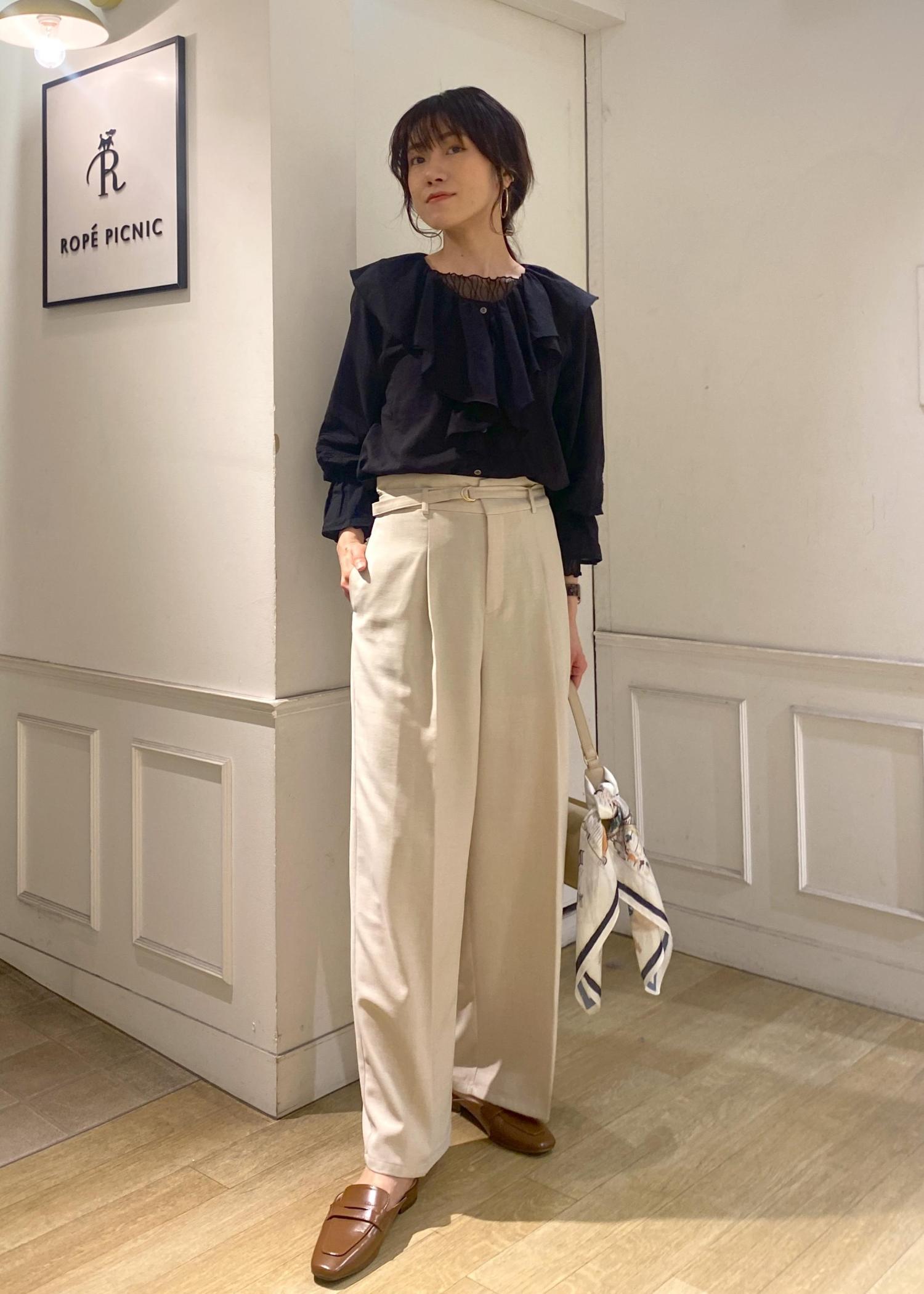 首元は顔まわりがスッキリ見えるVネックで、甘すぎず大人っぽく着こなせるフリルデザインです。