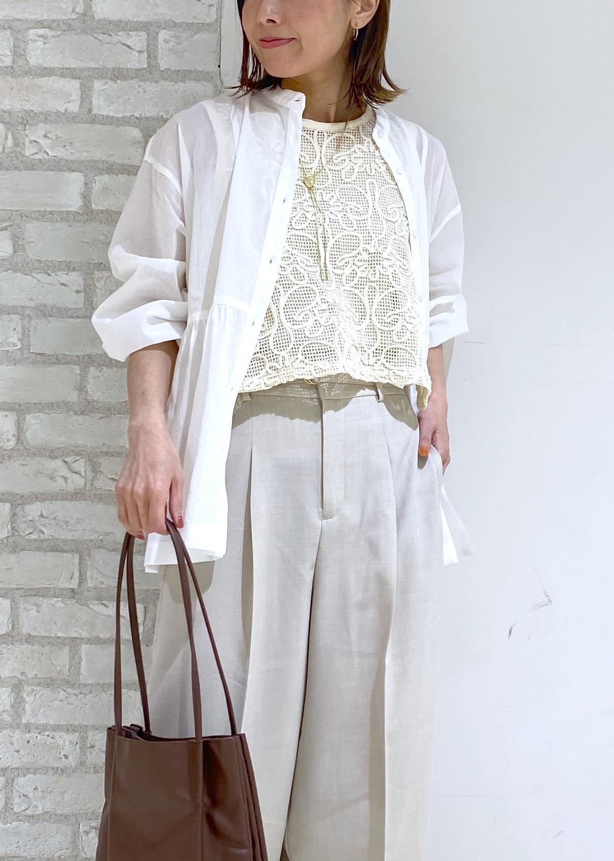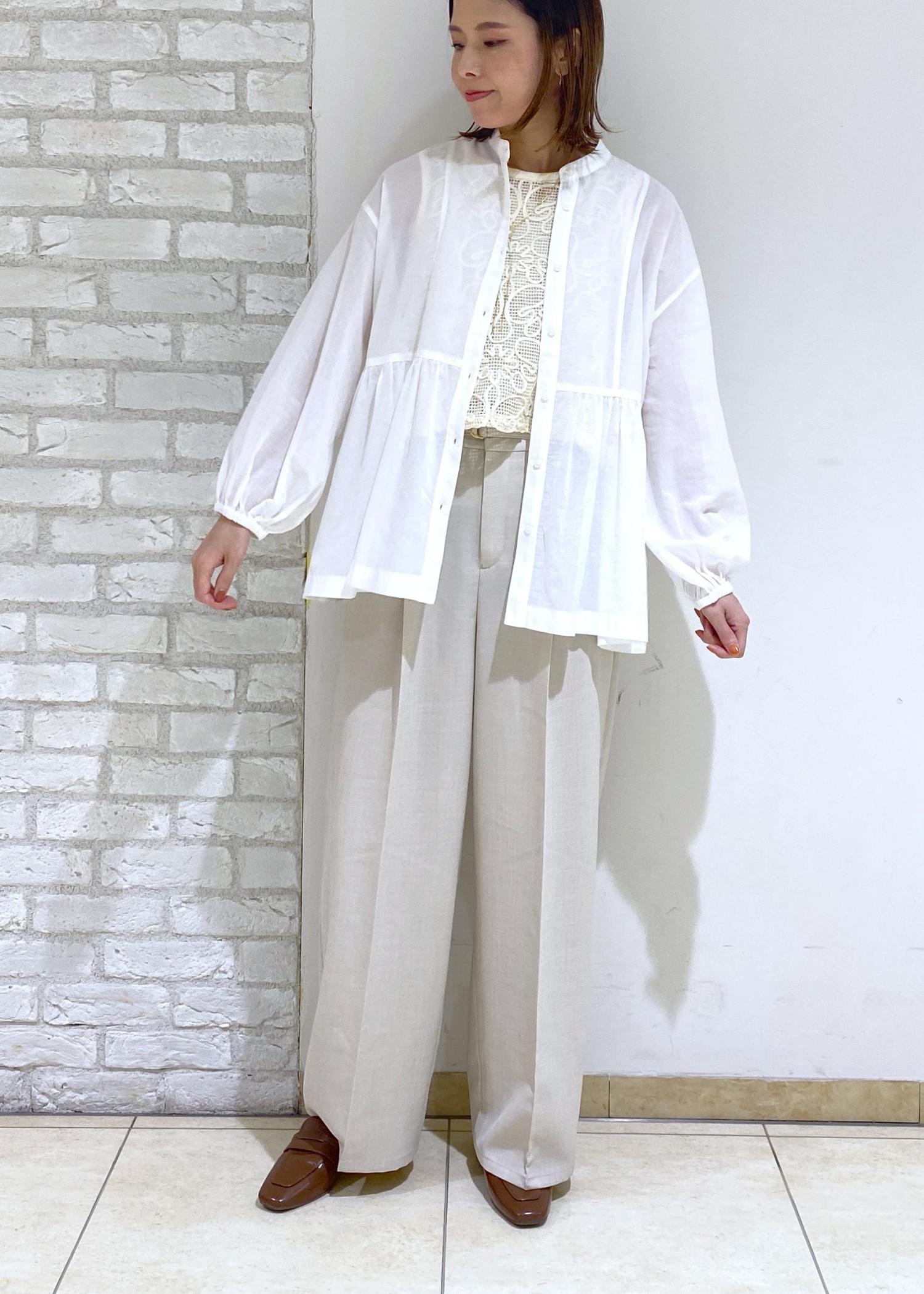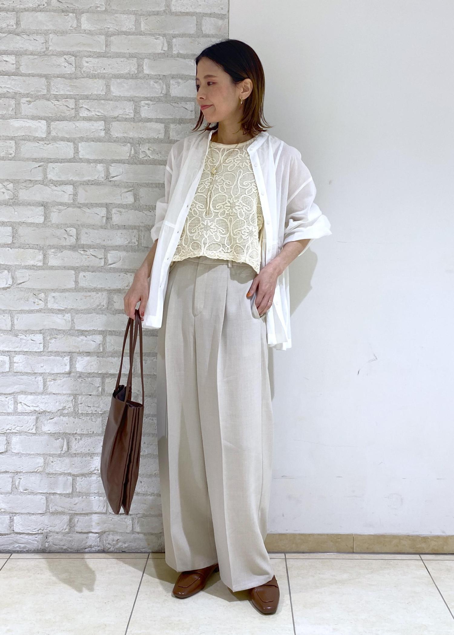 ベージュのワイドパンツでリラックス感のあるスタイリングにしました◎