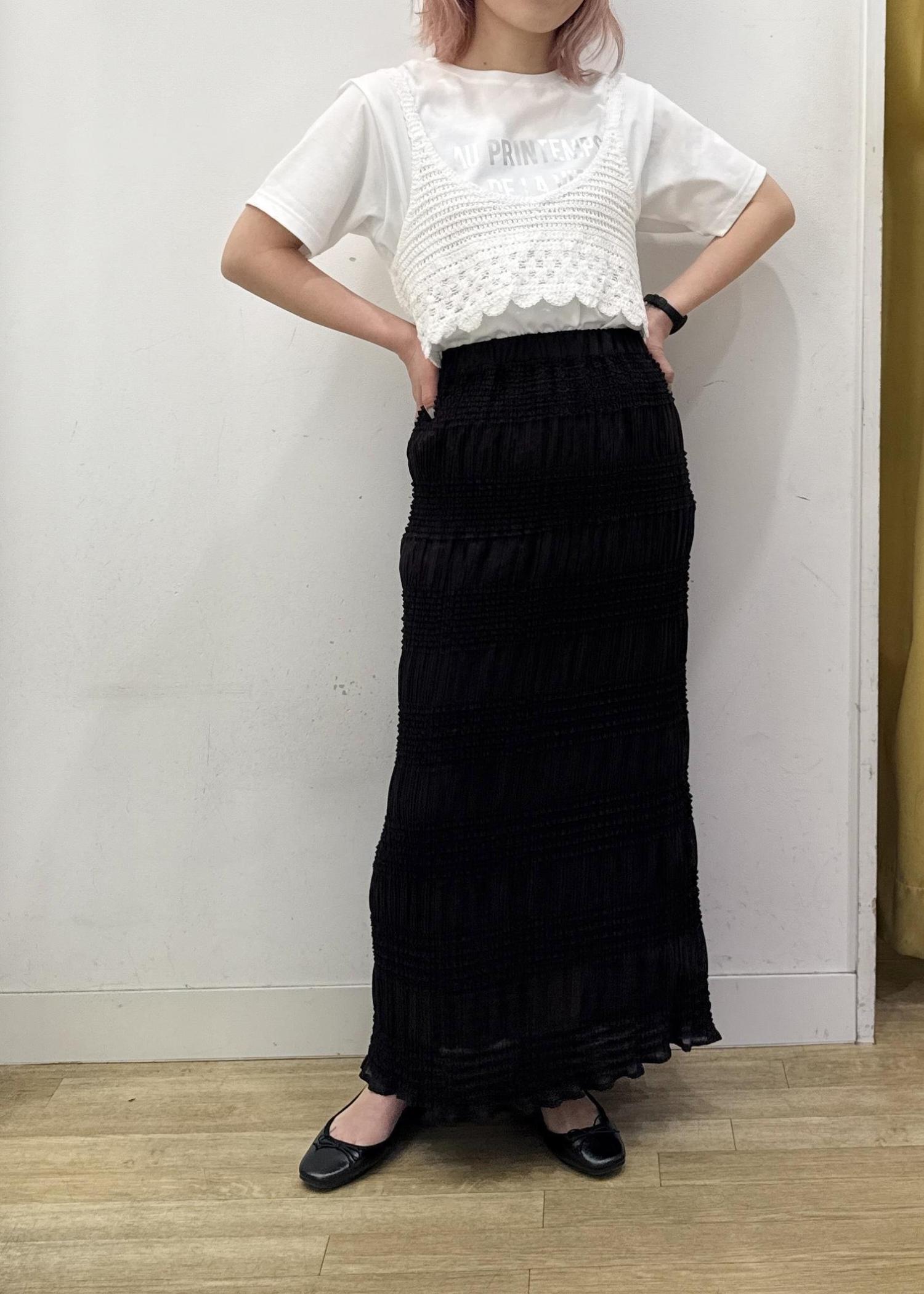 定番のTシャツ合わせですが、クロシェビスチェをレイヤードすれば一気にオシャレ度UP☺︎