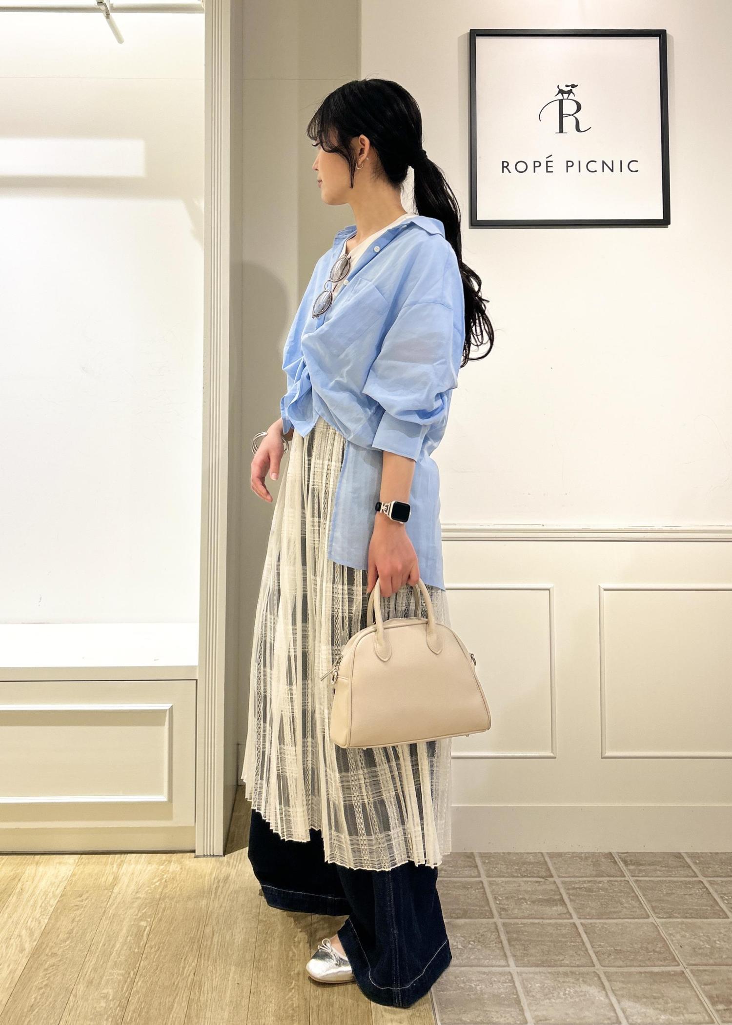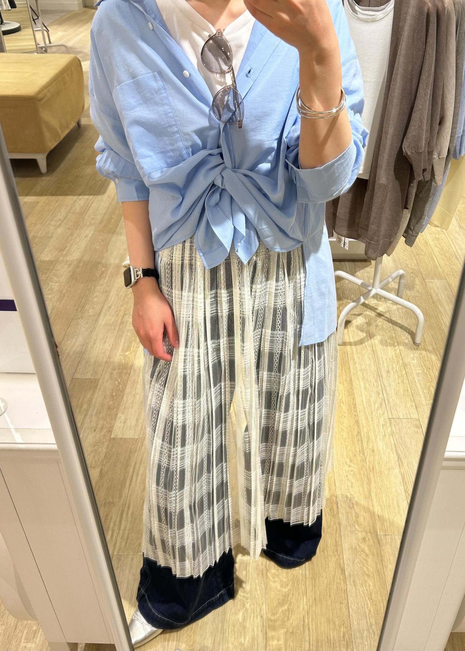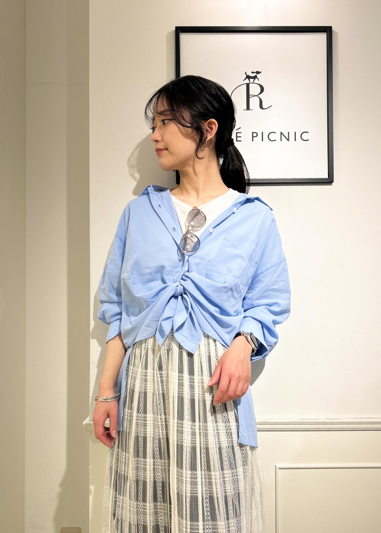 ライトブルーのシャツはあえて前で結んで、ゆるさをプラス。