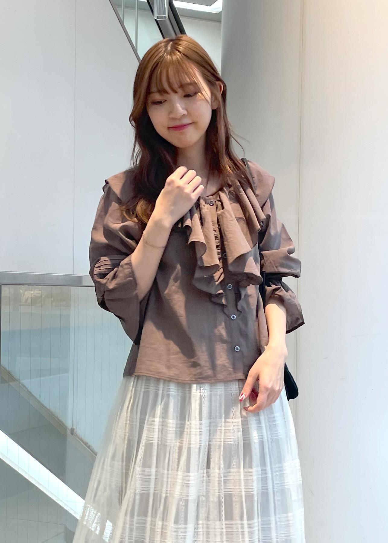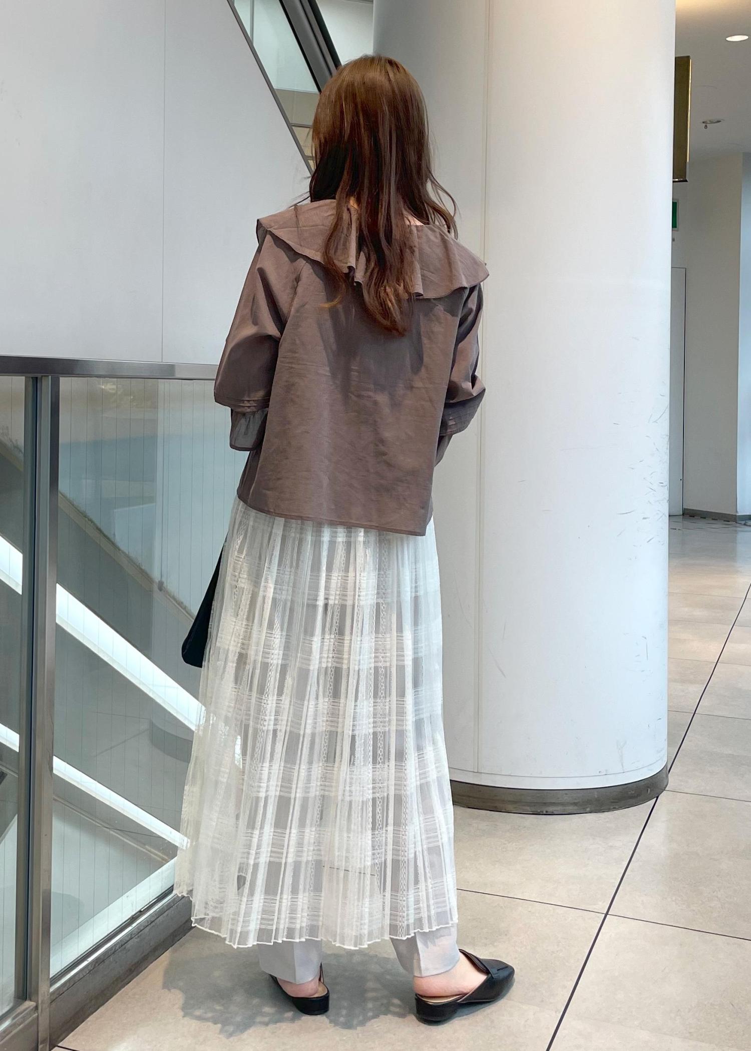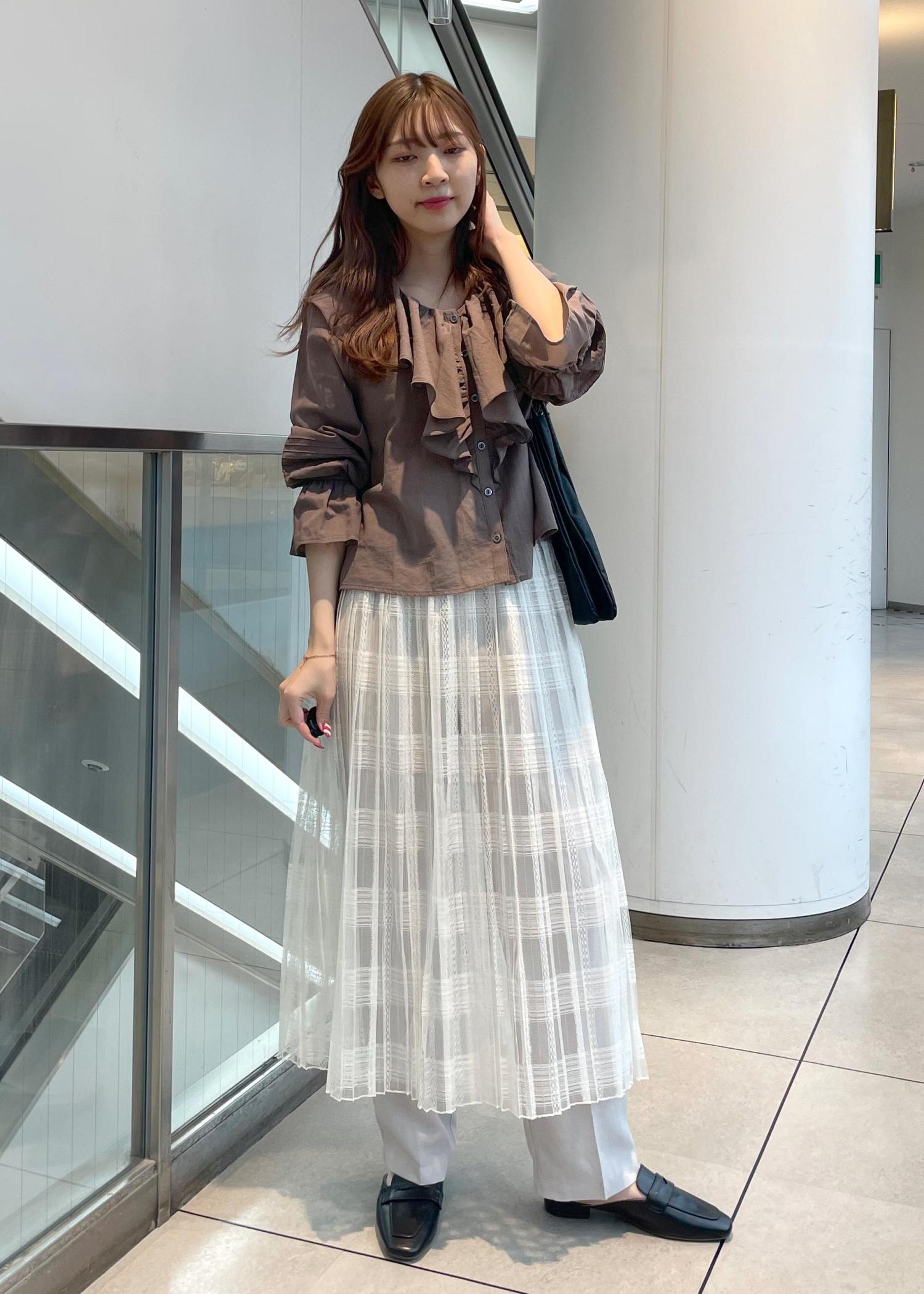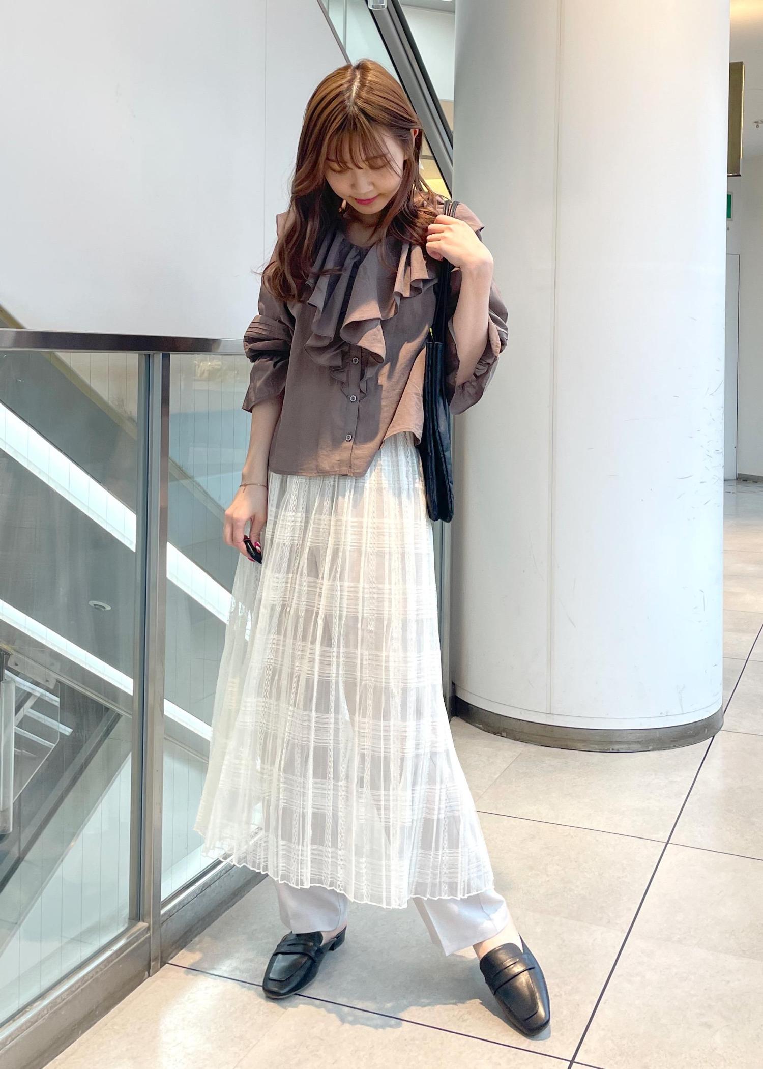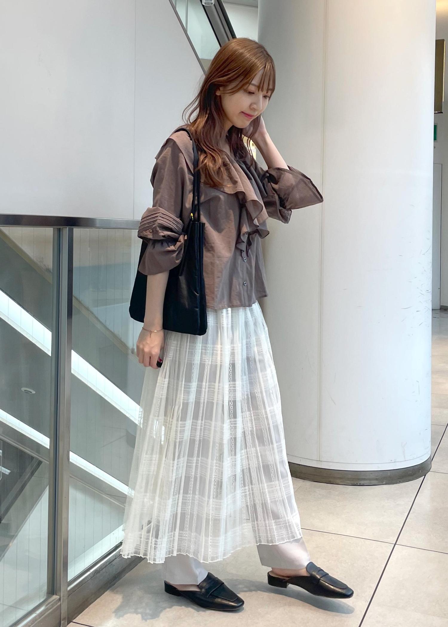 初夏にピッタリ、フェミニンで涼し気なコーディネートにしました。フリル感が可愛いらしいですがボトムスにパンツをレイヤードし、落ち着いた印象に。