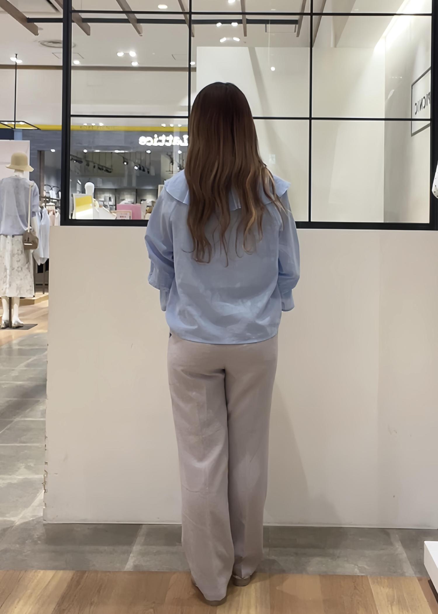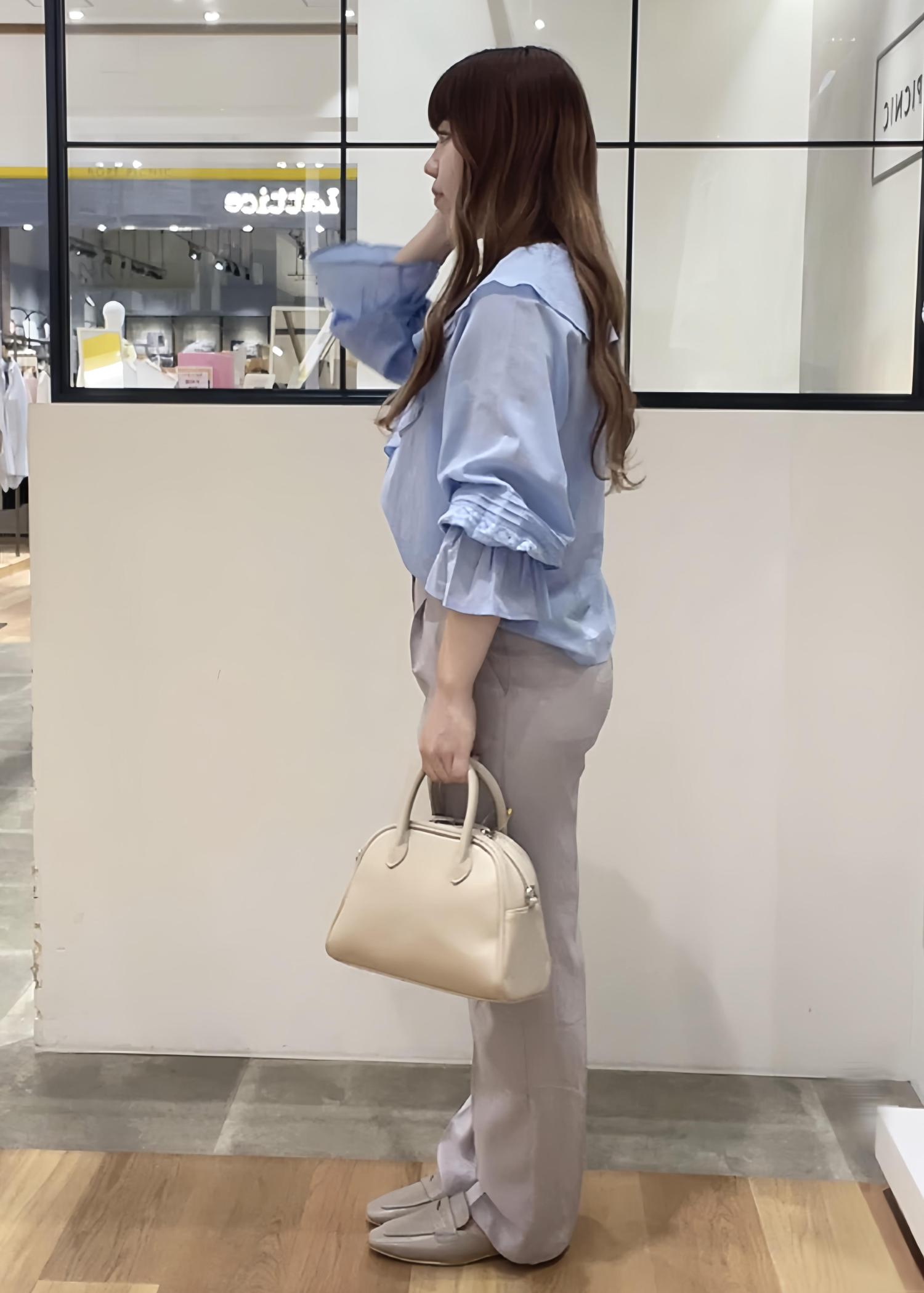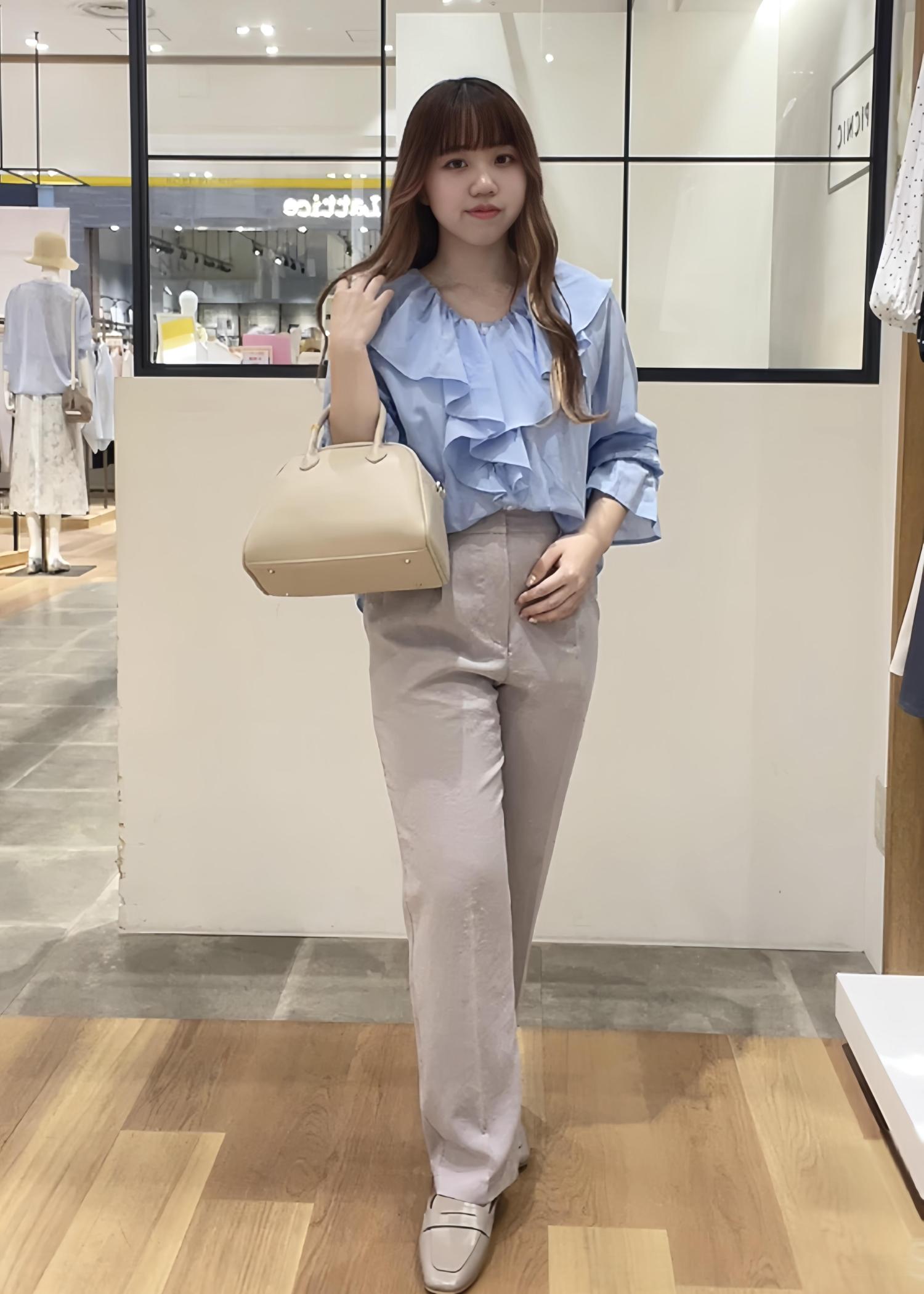 フリルシャツが甘めな印象だったので、ストレートパンツと落ち着いた色味の小物を合わせて甘くなりすぎないコーデにしました!