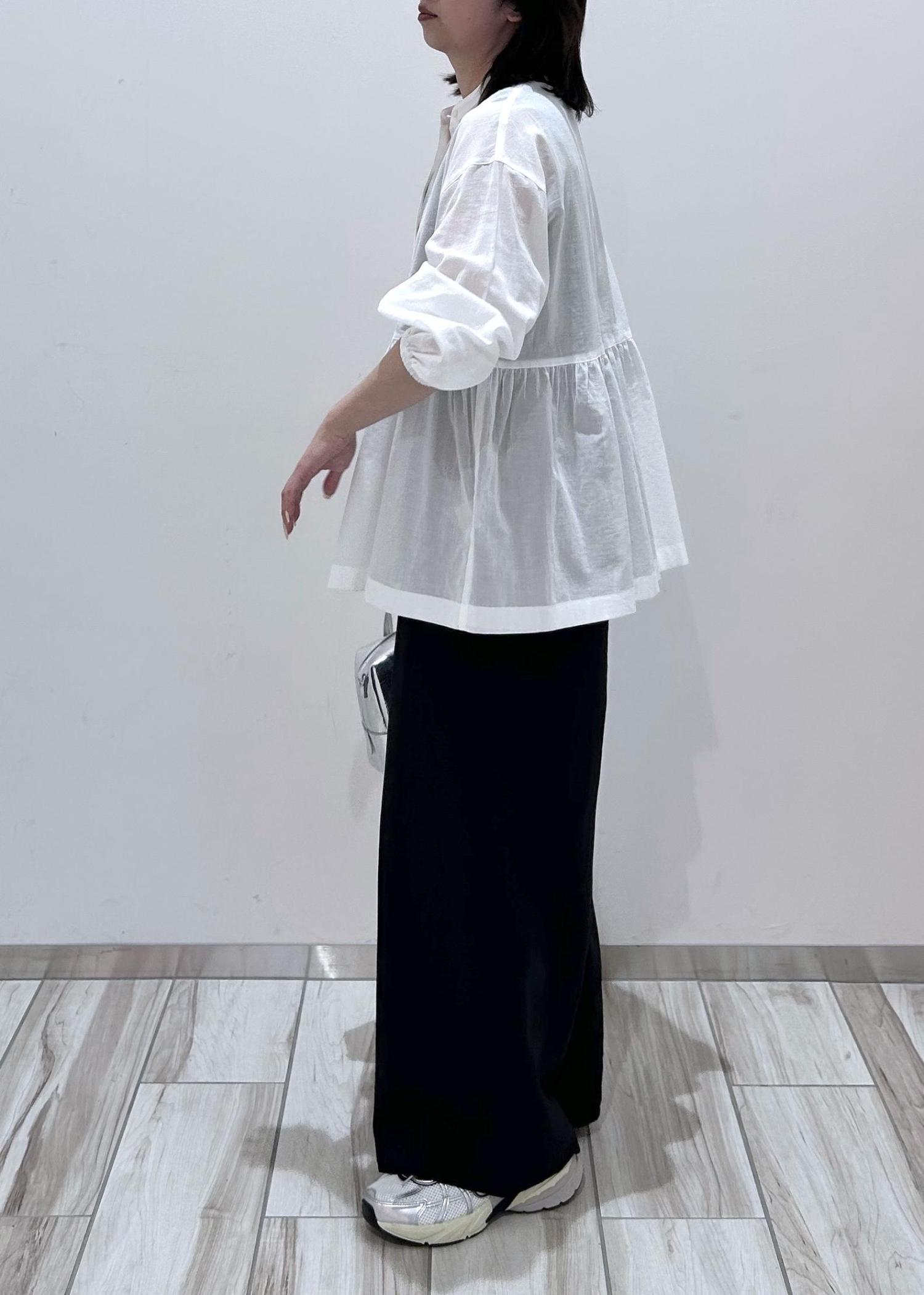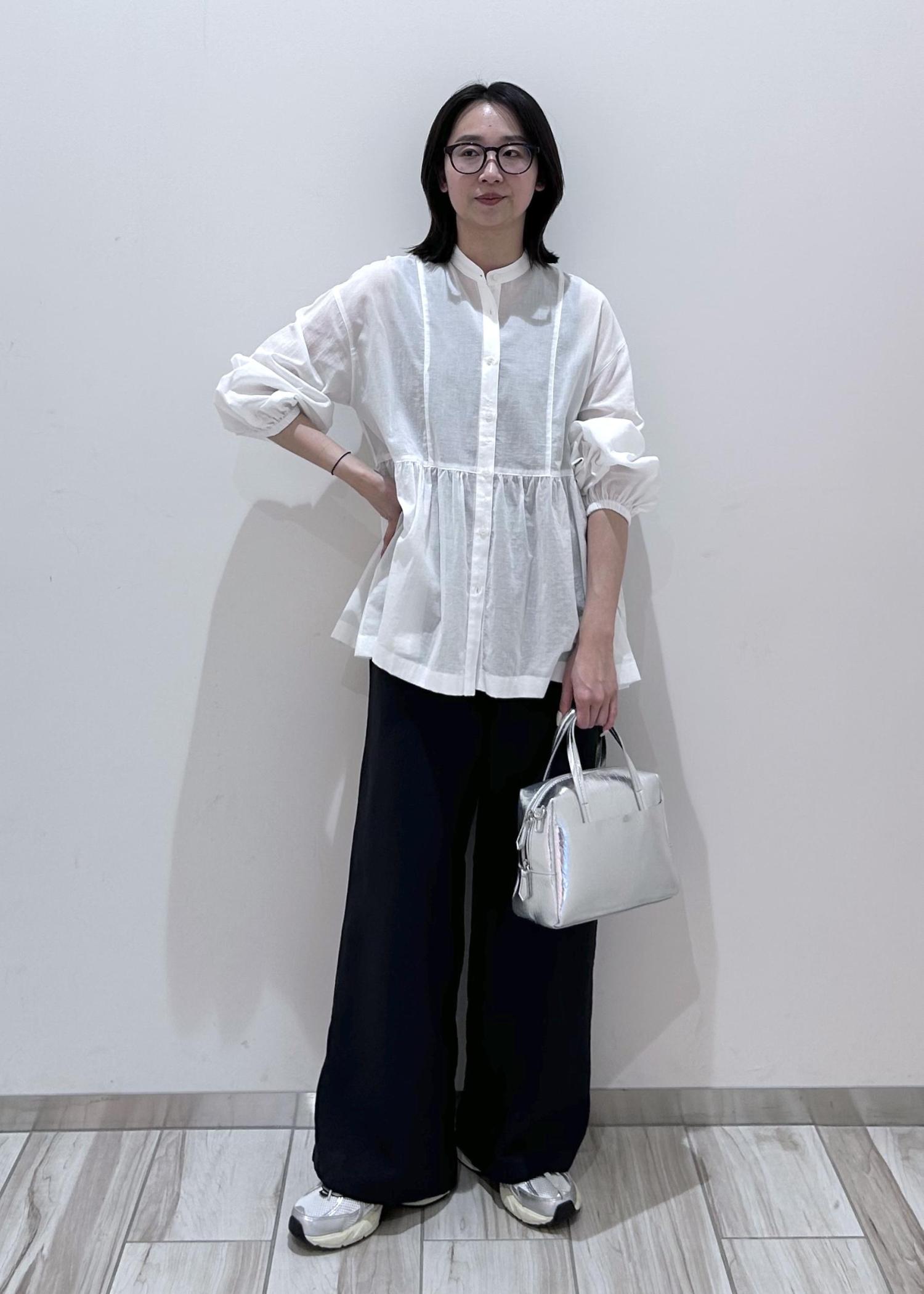 シャツはトップスとしても使える2WAY仕様で着回し力抜群。足元はスニーカーでカジュアルダウンしつつ、シルバーのバッグでほんのりモード感をプラス。