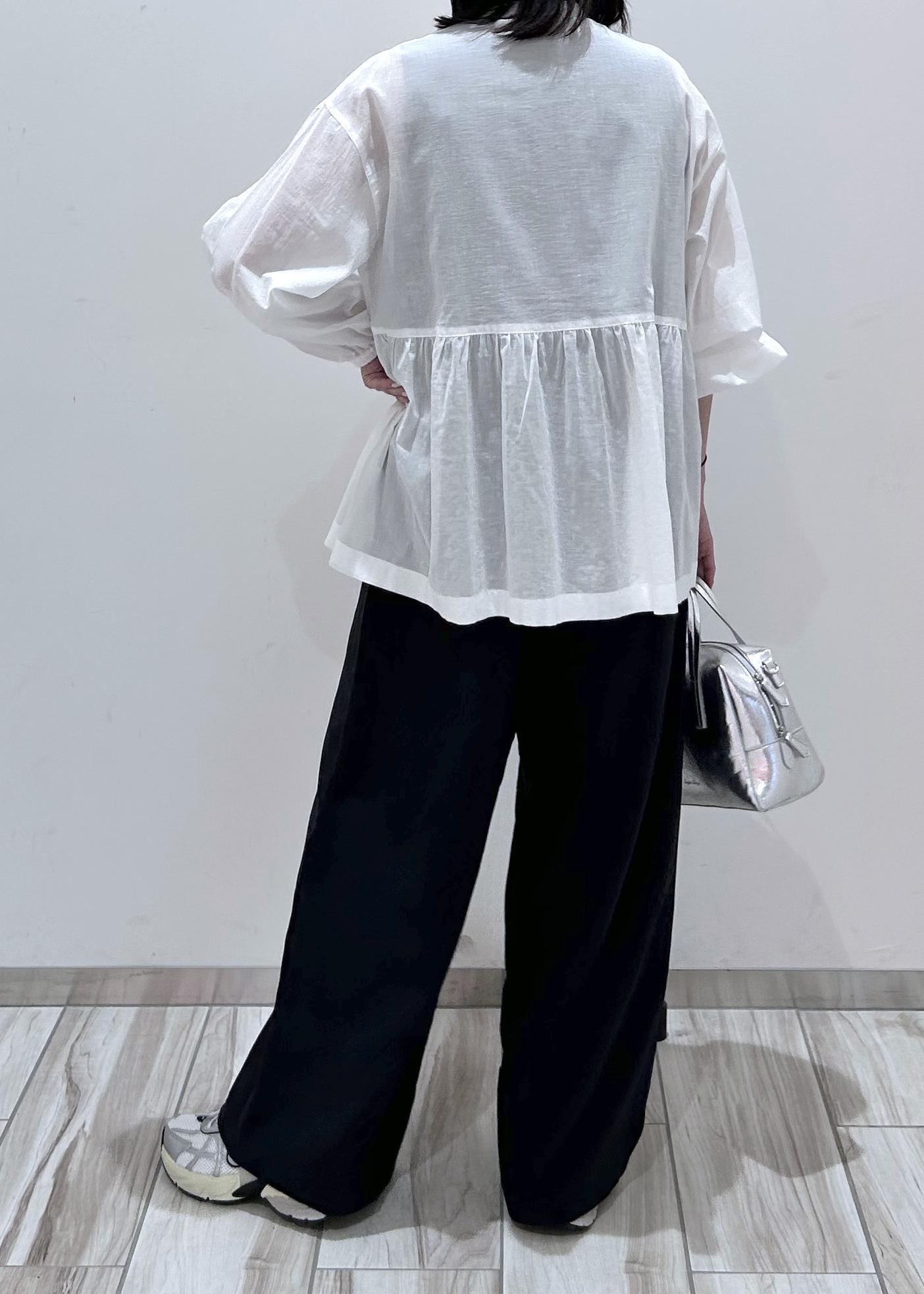 黒のオールインワンに白のペプラムシャツをさらっと羽織って、抜け感のあるモノトーンコーデに。
