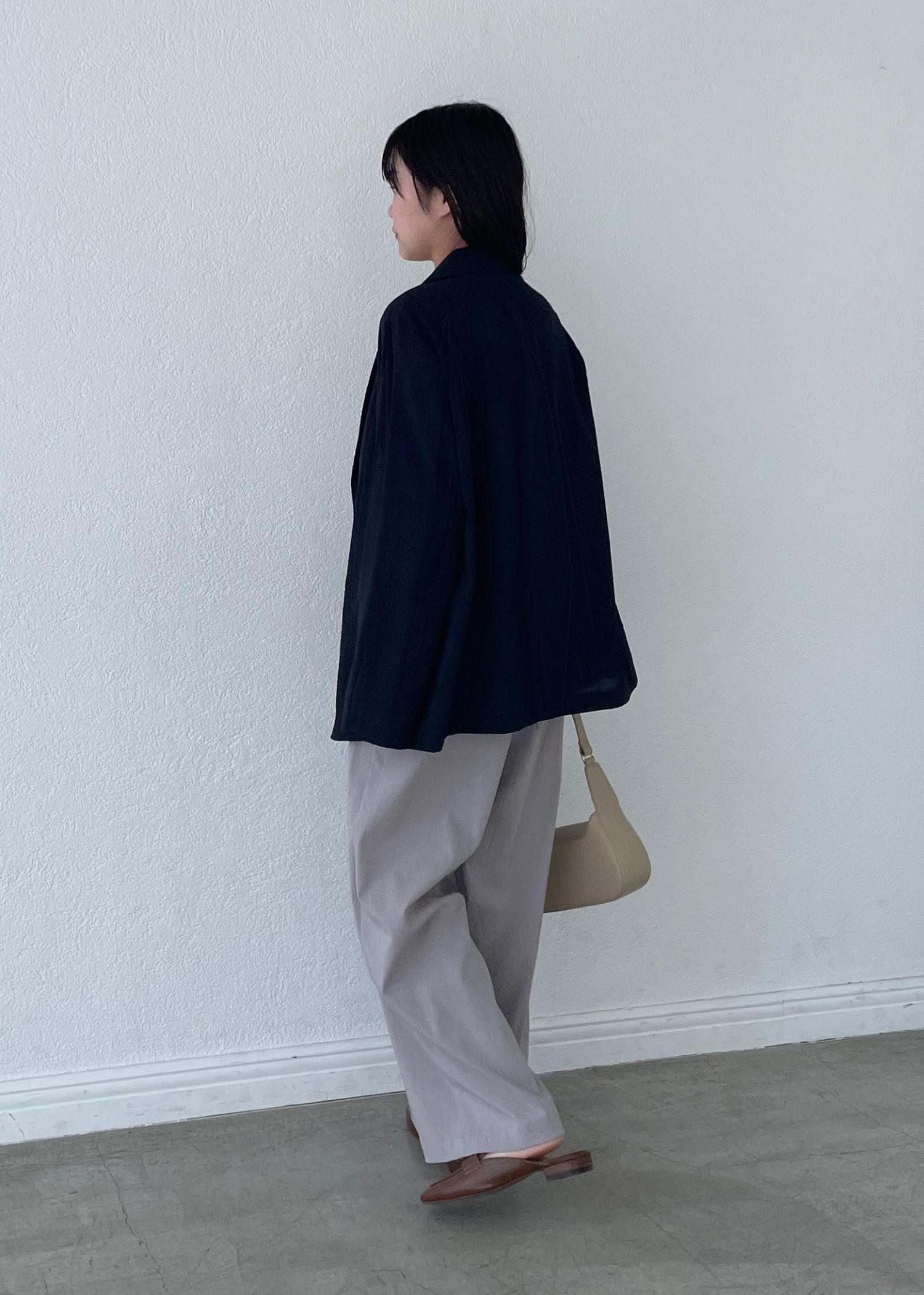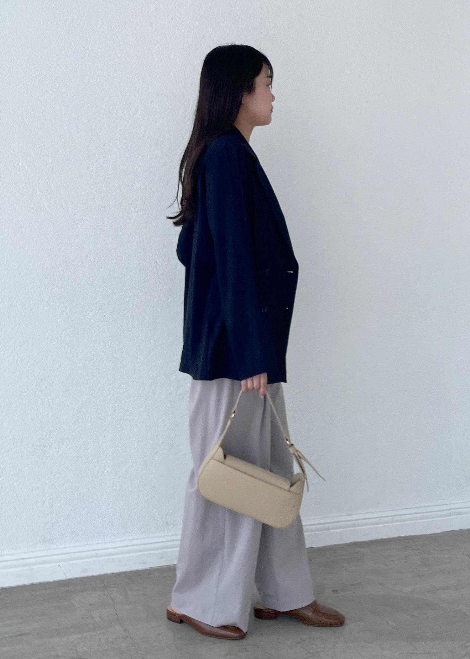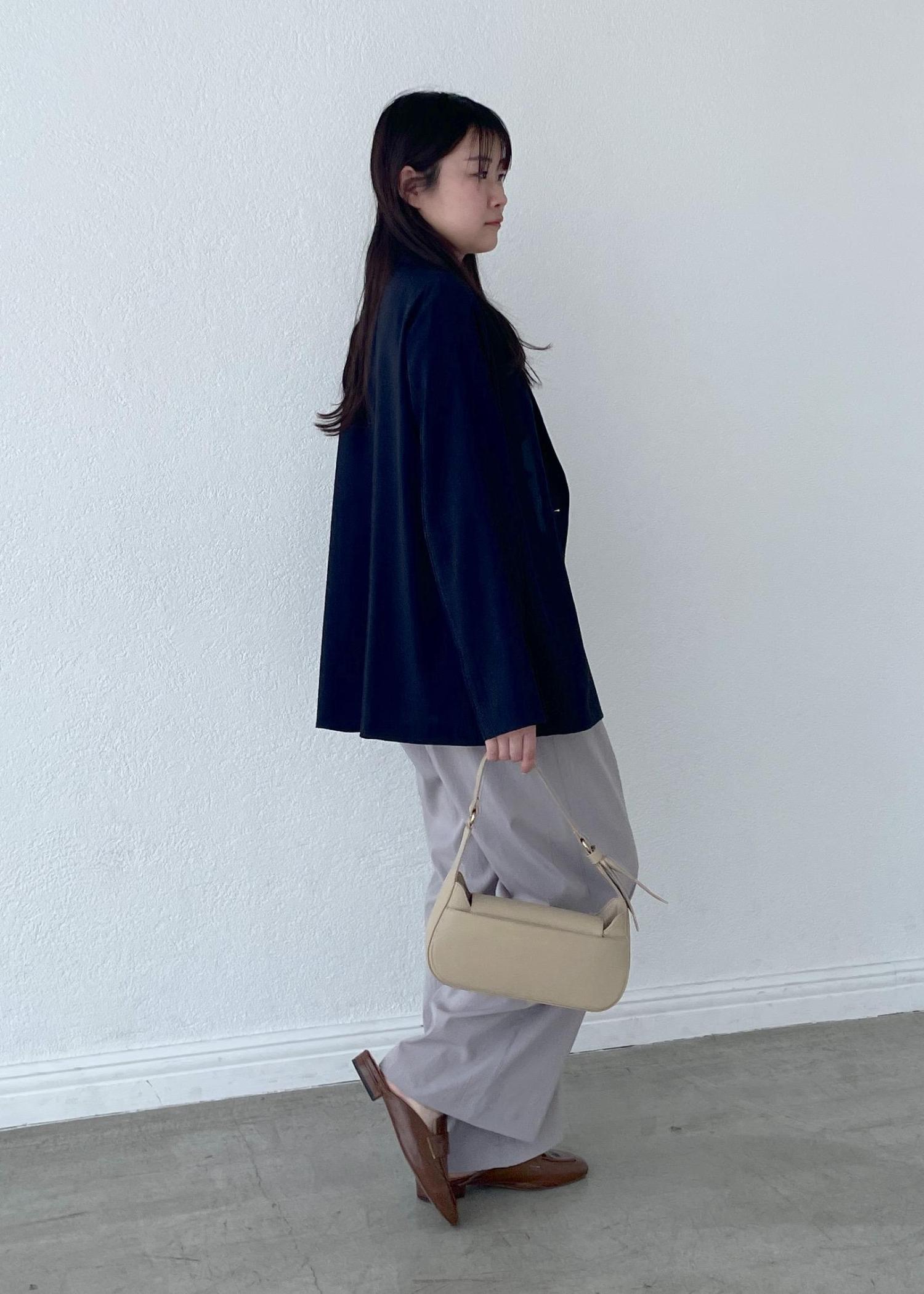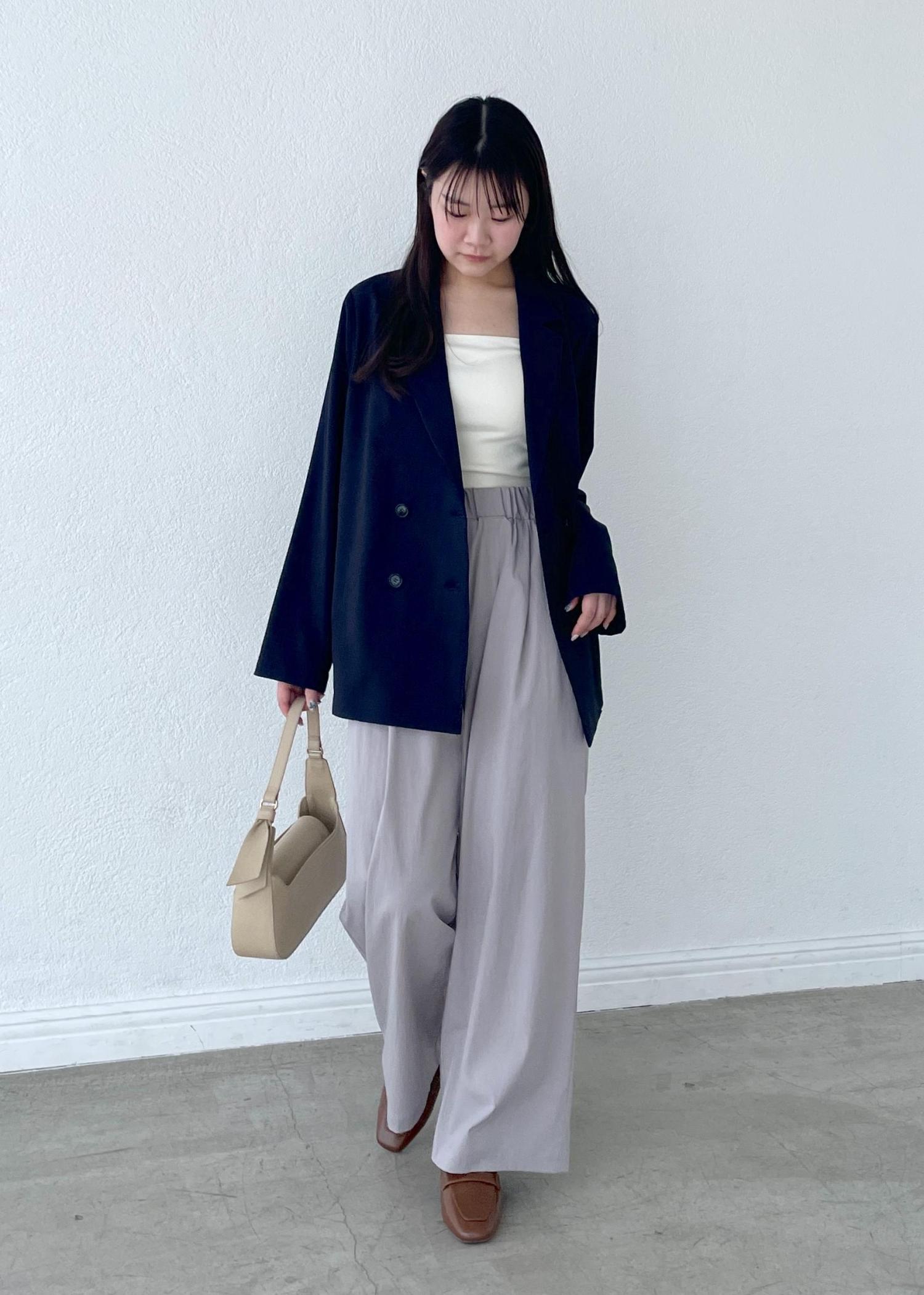 ネイビーのジャケットにグレーのパンツを合わせた、ややマニッシュライクなコーディネートです。