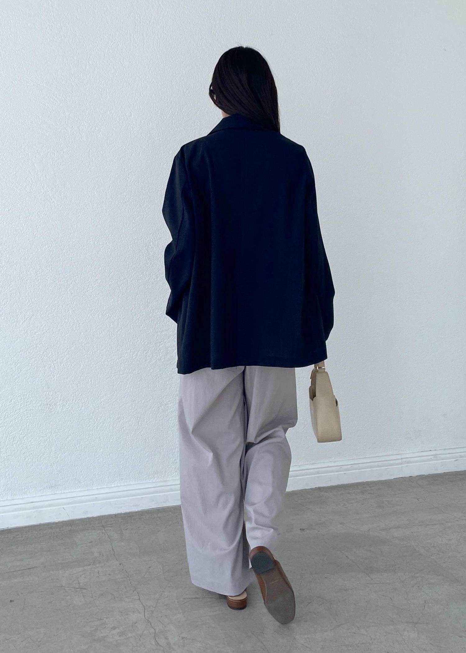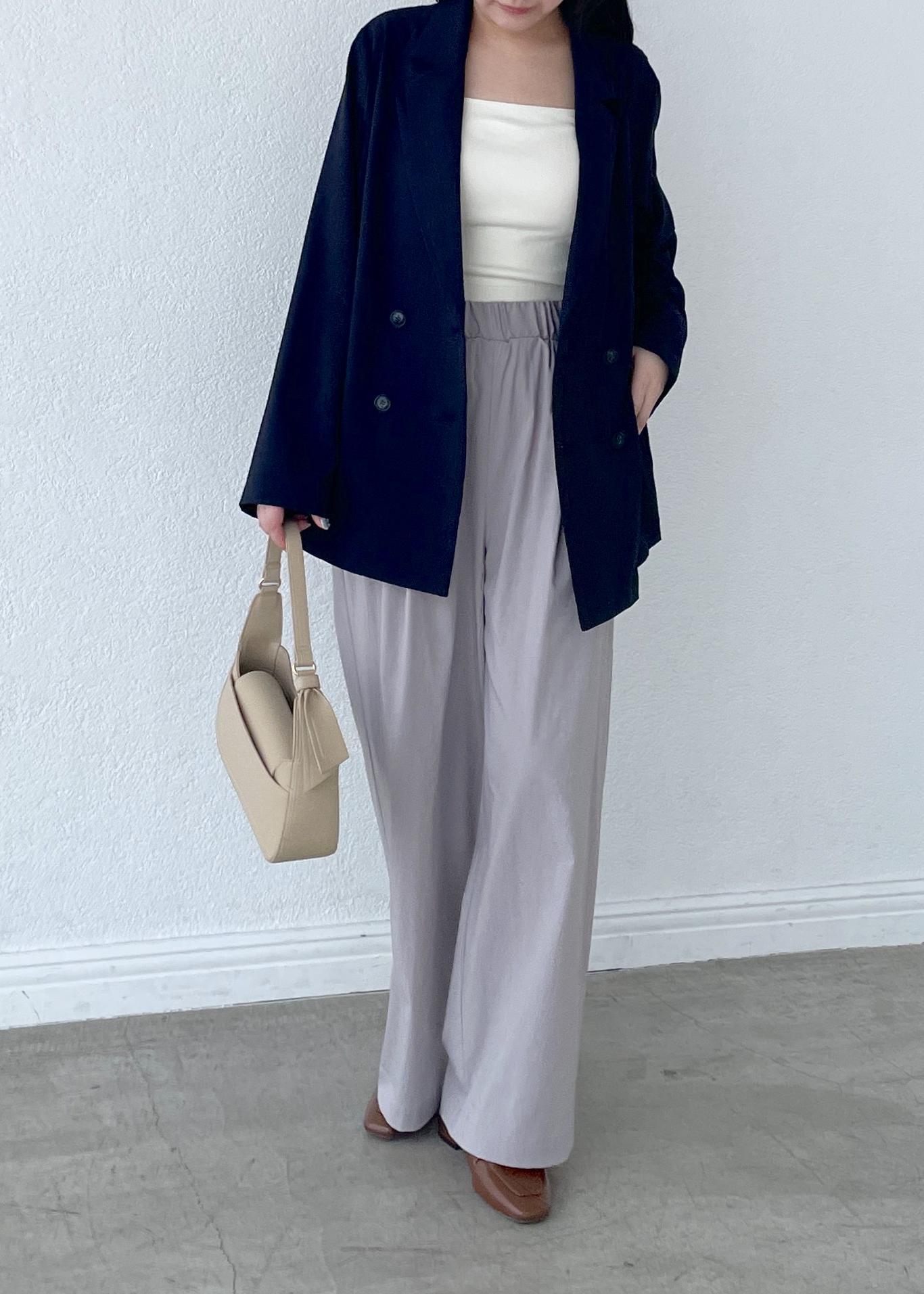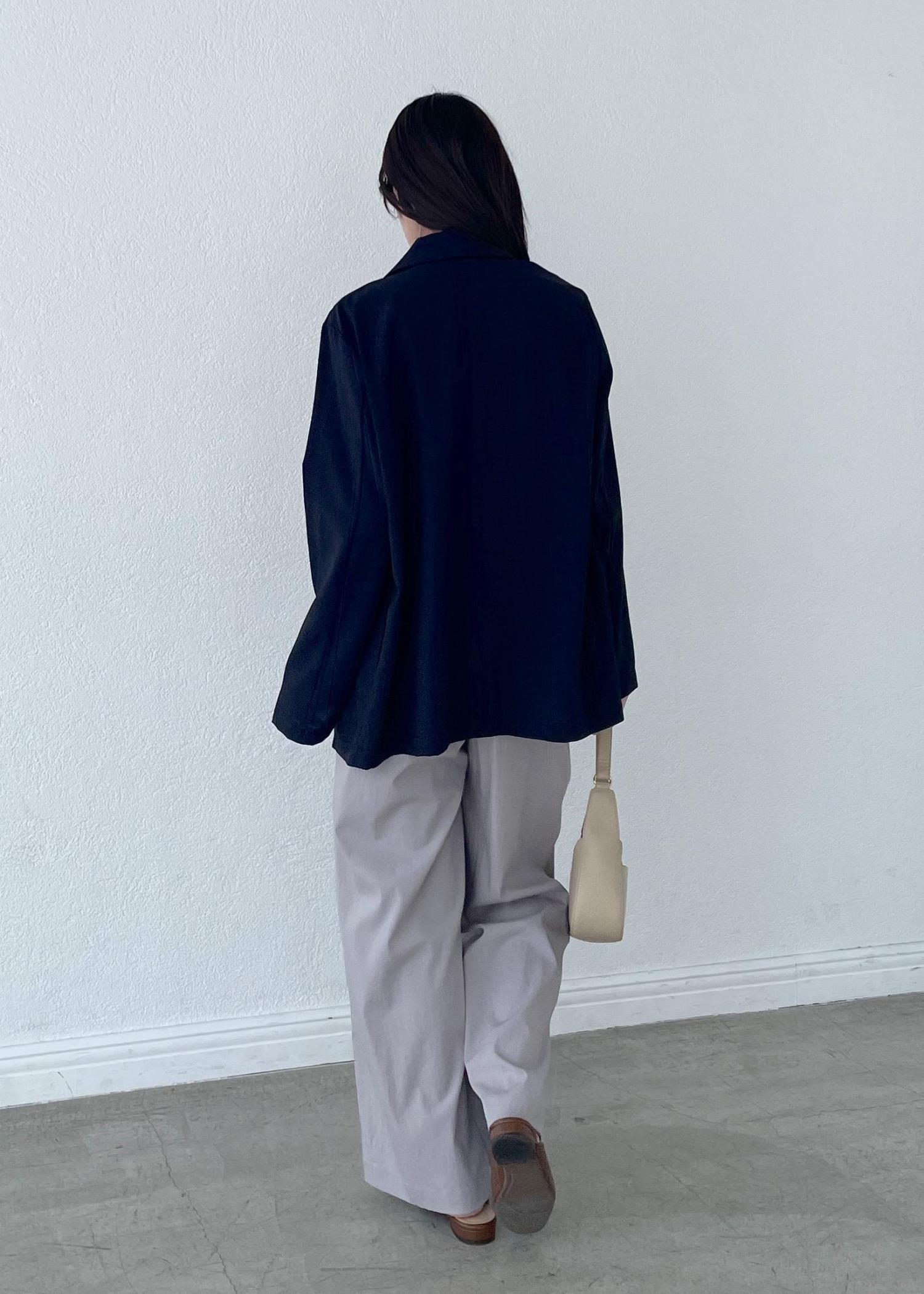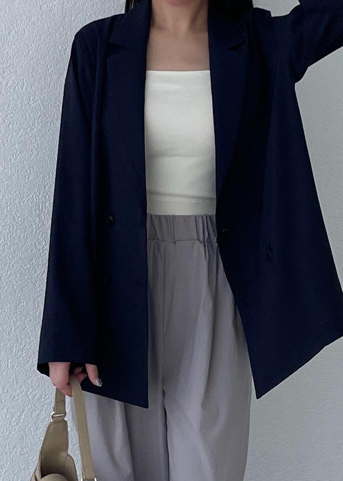 ネイビーのジャケットにグレーのパンツを合わせた、ややマニッシュライクなコーディネートです。