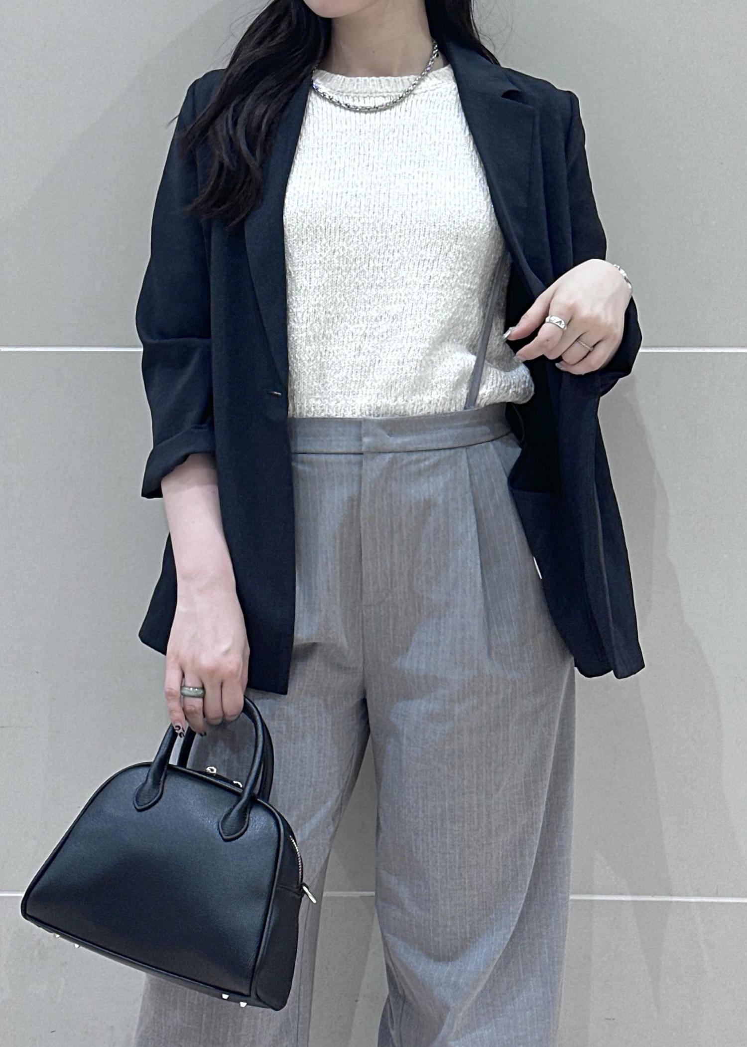 白のニットとグレーのパンツに夏素材でサラッとしたジャケットを羽織ったコーデ。