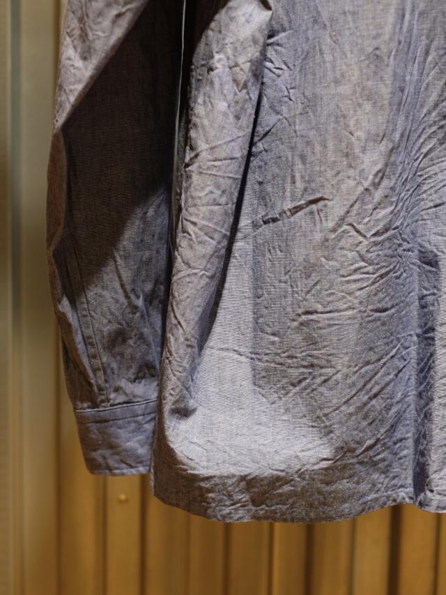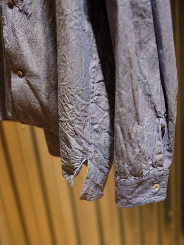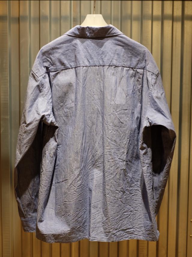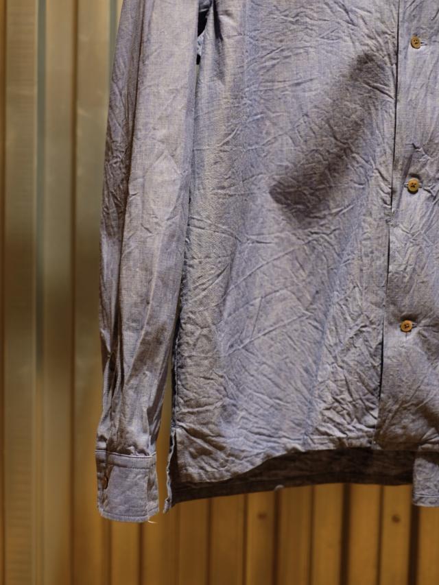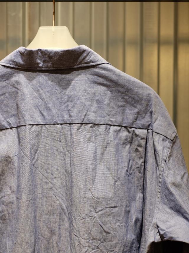 6.2オンスのムラ糸を使用したシャンブレー生地の、ボックスシルエットのオープンカラーシャツです。