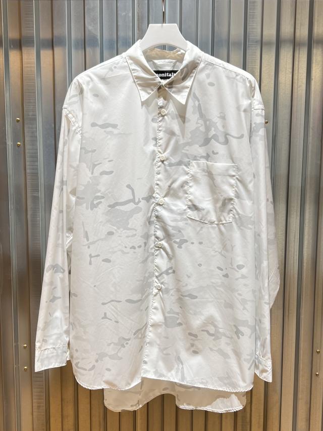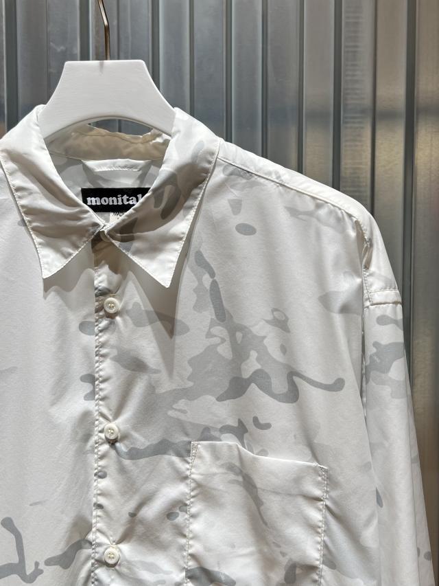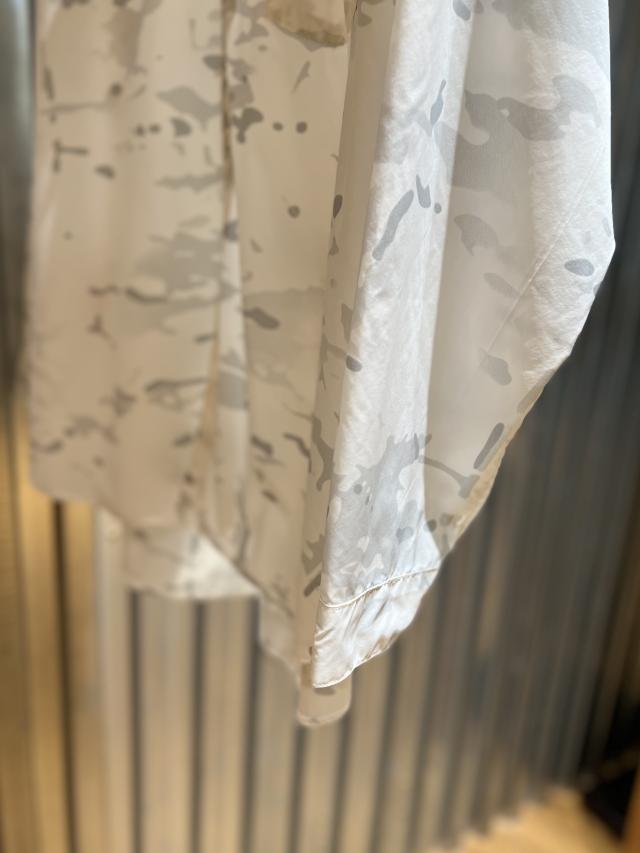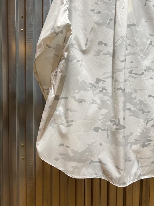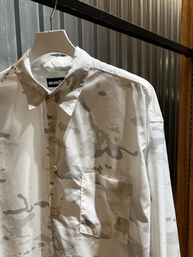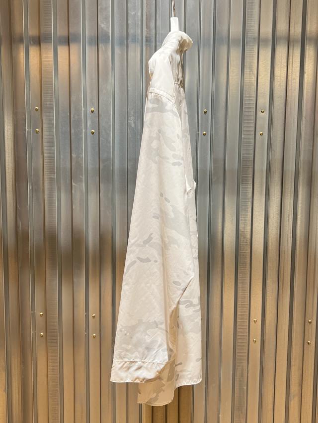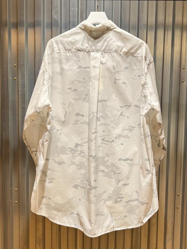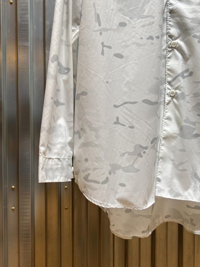 白ベースのカモ柄で非常に軽いナイロン素材の適度なオーバーサイズのシャツです。
