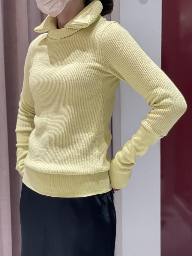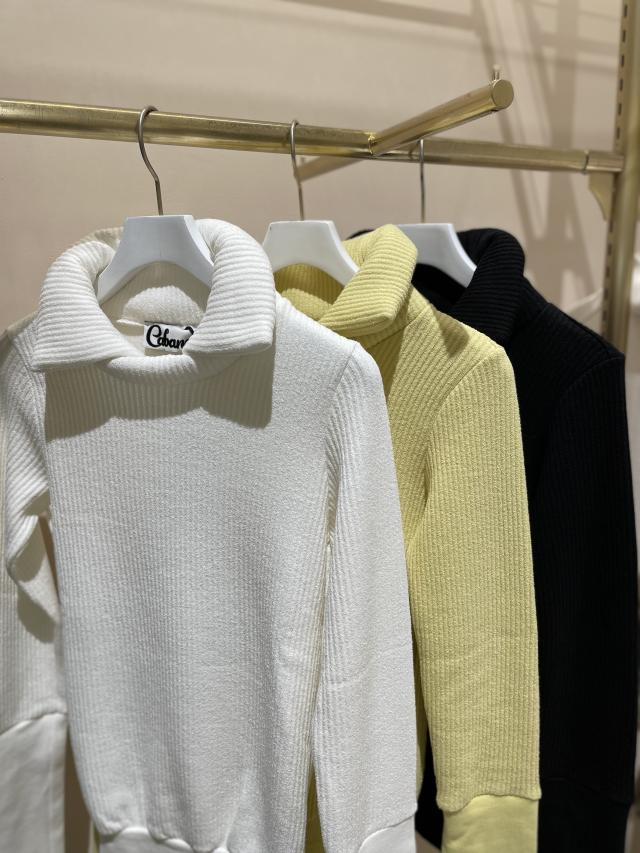 コットンとポリエステル素材のニットは襟に中綿が入っており、少しふっくらしてるんです! ホワイト、イエロー、ブラックの3色展開。