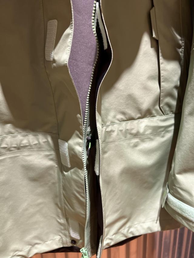 GORE-TEX3L Performance素材の採用、フロントのダブルラップ、収納可能なフード、ウエスト部のアジャスター、グローブ着用時にも操作性を高めたフラップ仕様等機能面と、2色それぞれのカラーリング、ロゴ、ボディとパーツの配色の雰囲気もあり、いい表情です!
