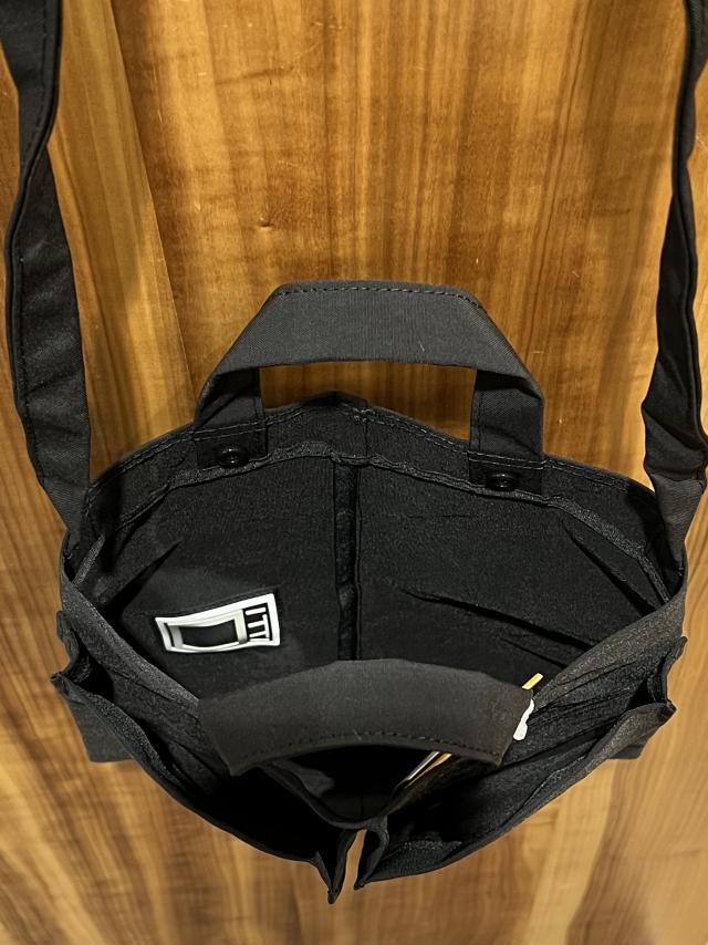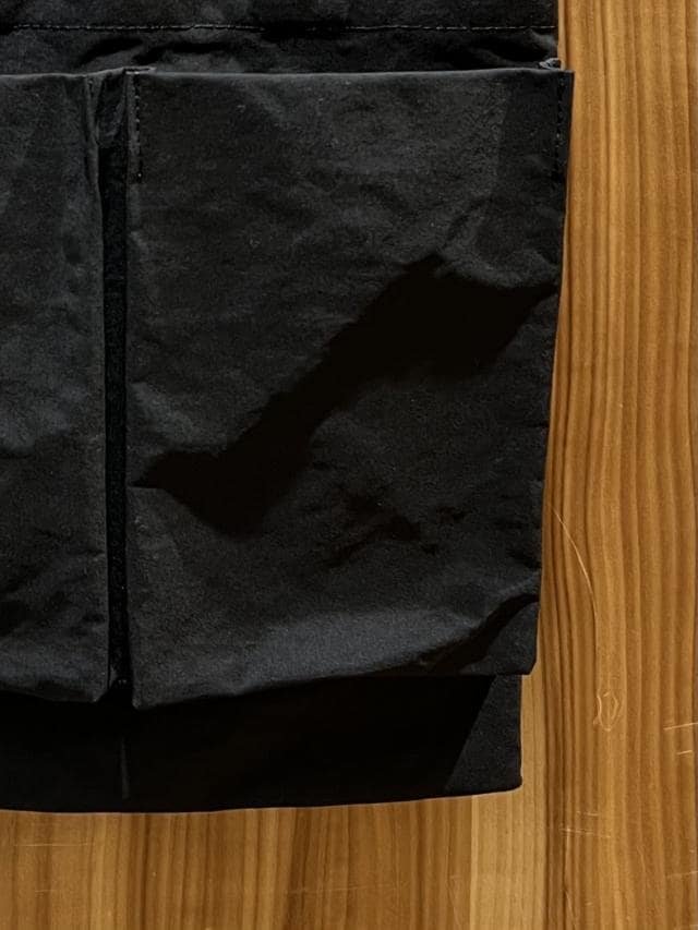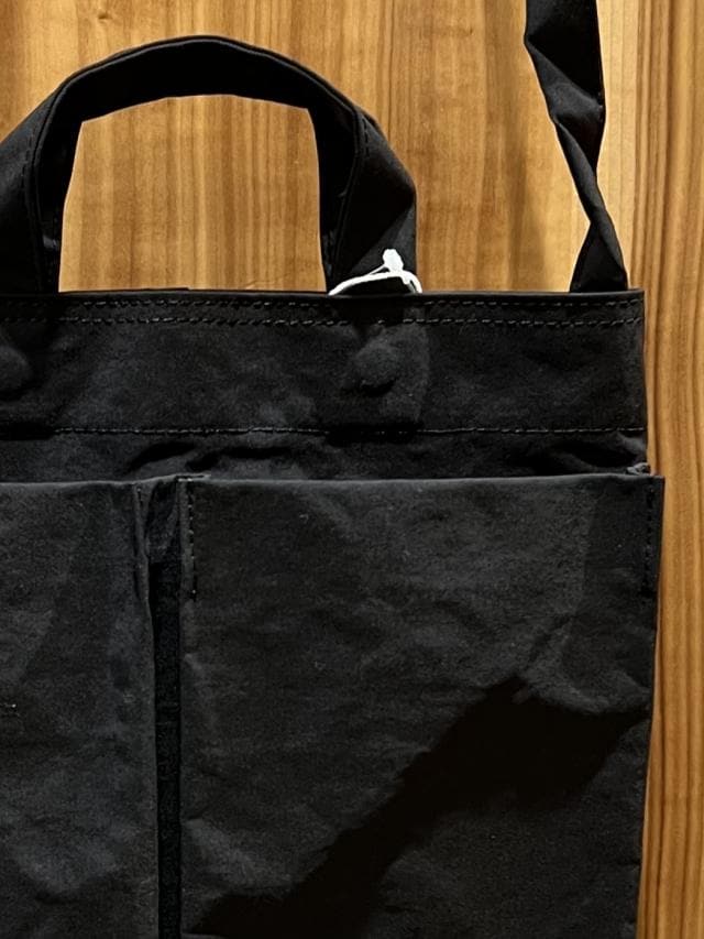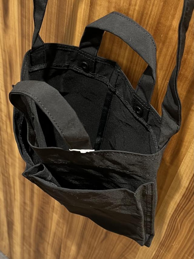 粗い目のキャンバス生地のように自立ながらも超軽量で強靭な塩縮加工ナイロンに強撥水加工を施した素材で、野菜を入れるキャンバス地のバッグ “ベジバッグ”と、ミリタリーの“ヘルメットバッグ”をモチーフにした小さめのバッグです。