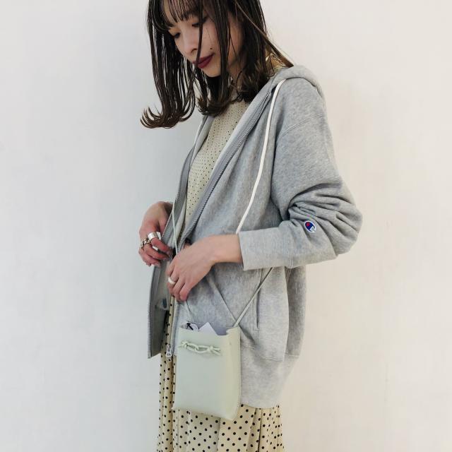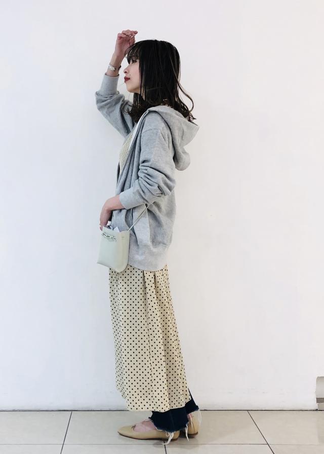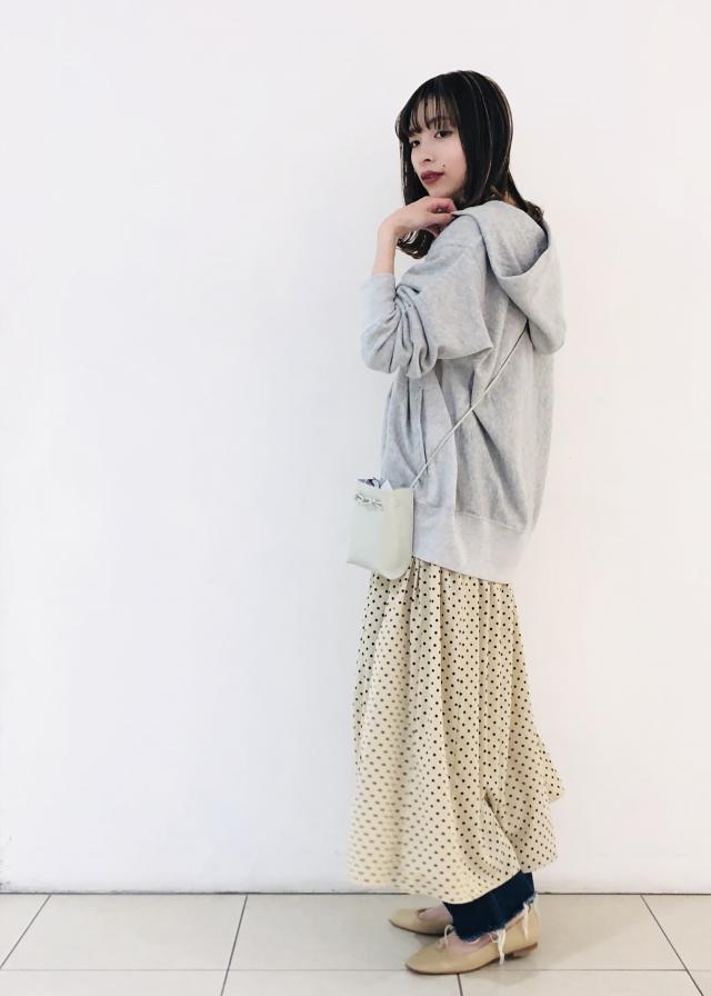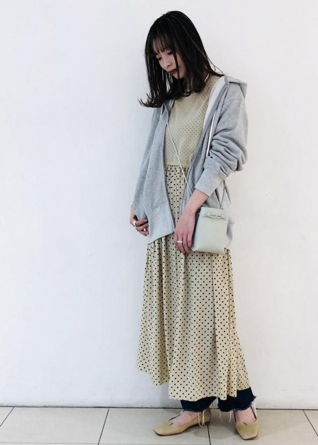 ゆるっとしたシルエットのパーカーに敢えてとろみ感のあるワンピースを合わせ、女性らしく。 カラーはワントーンでまとめて春らしいスタイリングに。