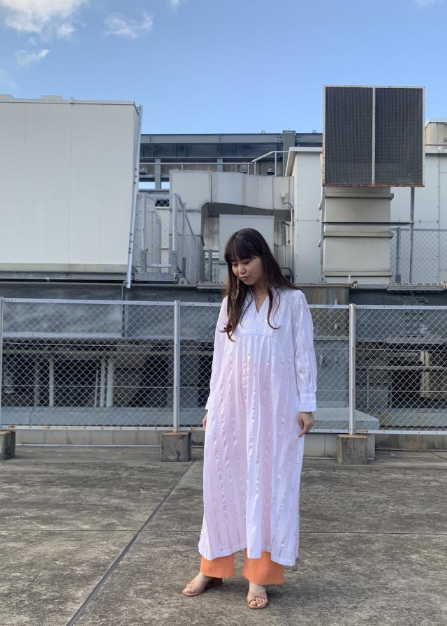 光沢のあるストライプに、涼やかな質感のワンピース。1枚でも様になりますが、パンツのレイヤードスタイルもおすすめです!