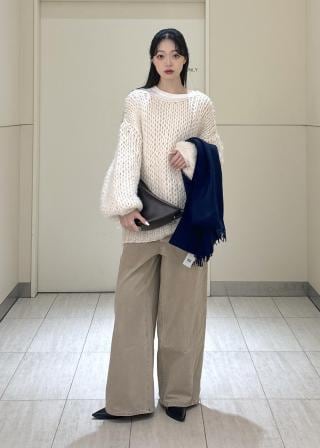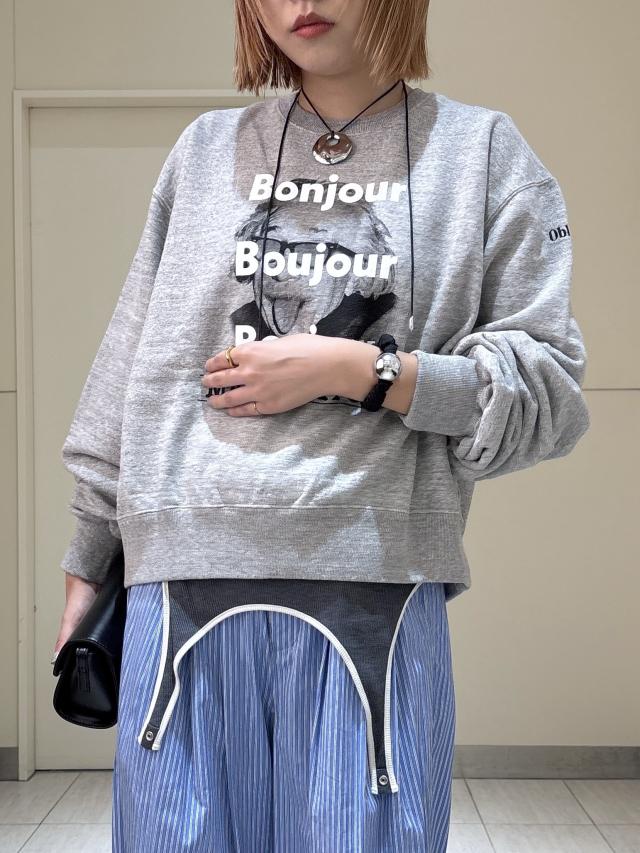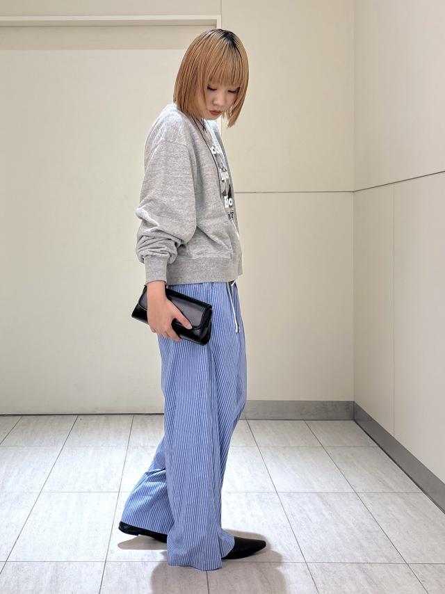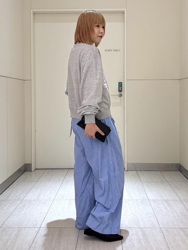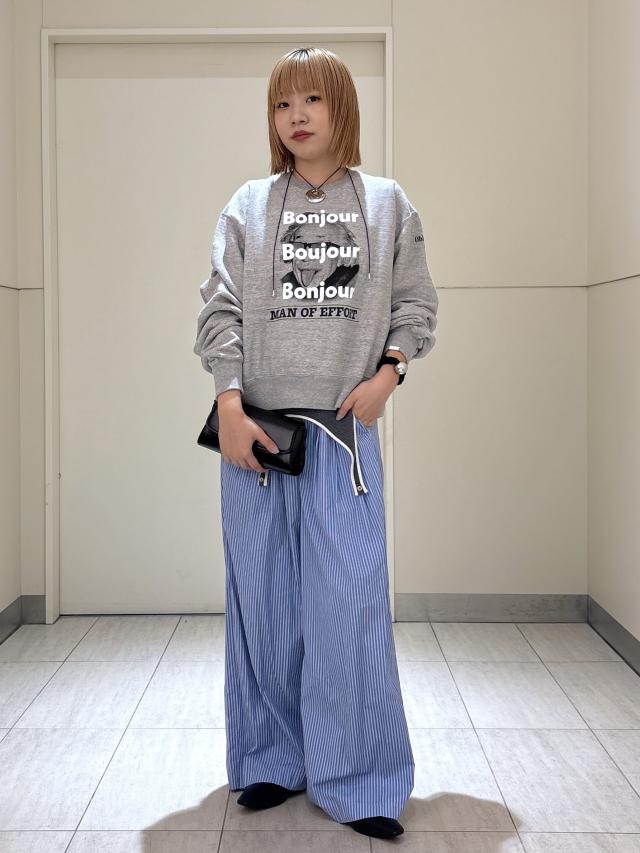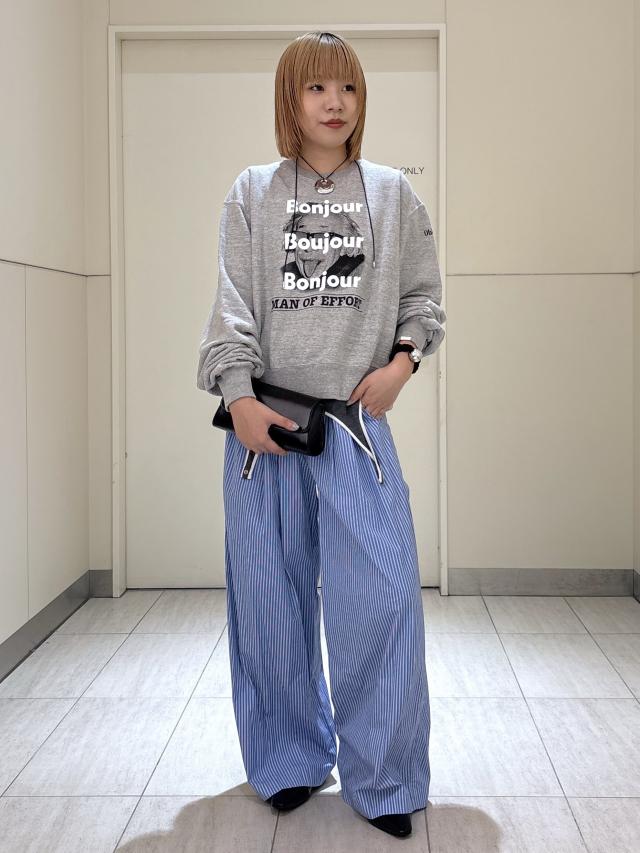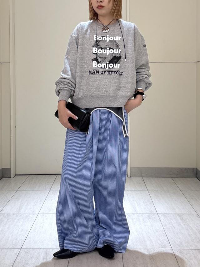 キャッチーなロゴスウェットを主役にしたカジュアルコーデ。ブルーのストライプワイドパンツで軽やかさをプラスし、抜け感のあるリラックススタイルに仕上げました。