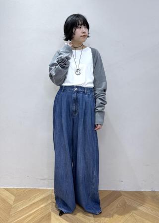 またパンツはウエストにデザインが施されているので、レイヤードしたような見え方になり、少しインするだけでおしゃれな印象に。
