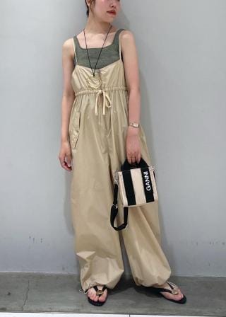 カジュアルなワークパンツのデザインと、華奢な肩紐のアンバランスさが素敵なロンパース。