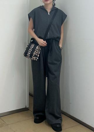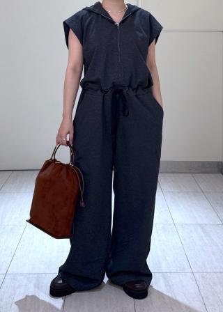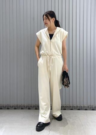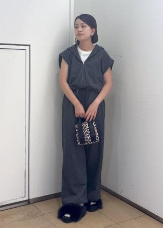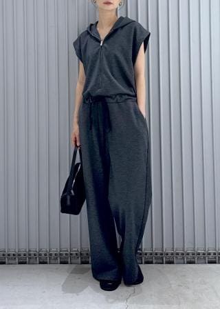 中にベアキャミソール、フロントジップを開けてユルっと一枚で。