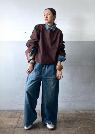 オーバーシルエットが魅力的なデニムのジャンプスーツ。
