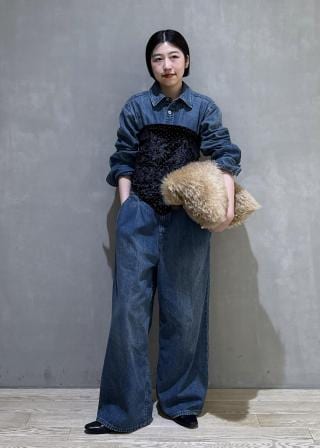 オーバーシルエットが魅力的なデニムのジャンプスーツ。