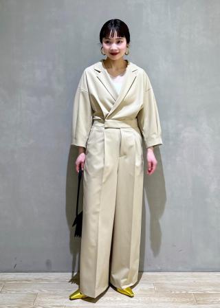 ブラウスと、スラックスのセットアップをスタイリングしたようなジャンプスーツ。テーラードラペルできちんと見えでかっこよく。ウエスト周りはタックが入っているので体型カバー効果も。忙しい朝もスタイリングを考えることなくかっこよくキマる、時短のきちんとつなぎ。ウエストベルト内側にアジャストタブがあるので、自分の好みのウエスト寸に調整が可能。